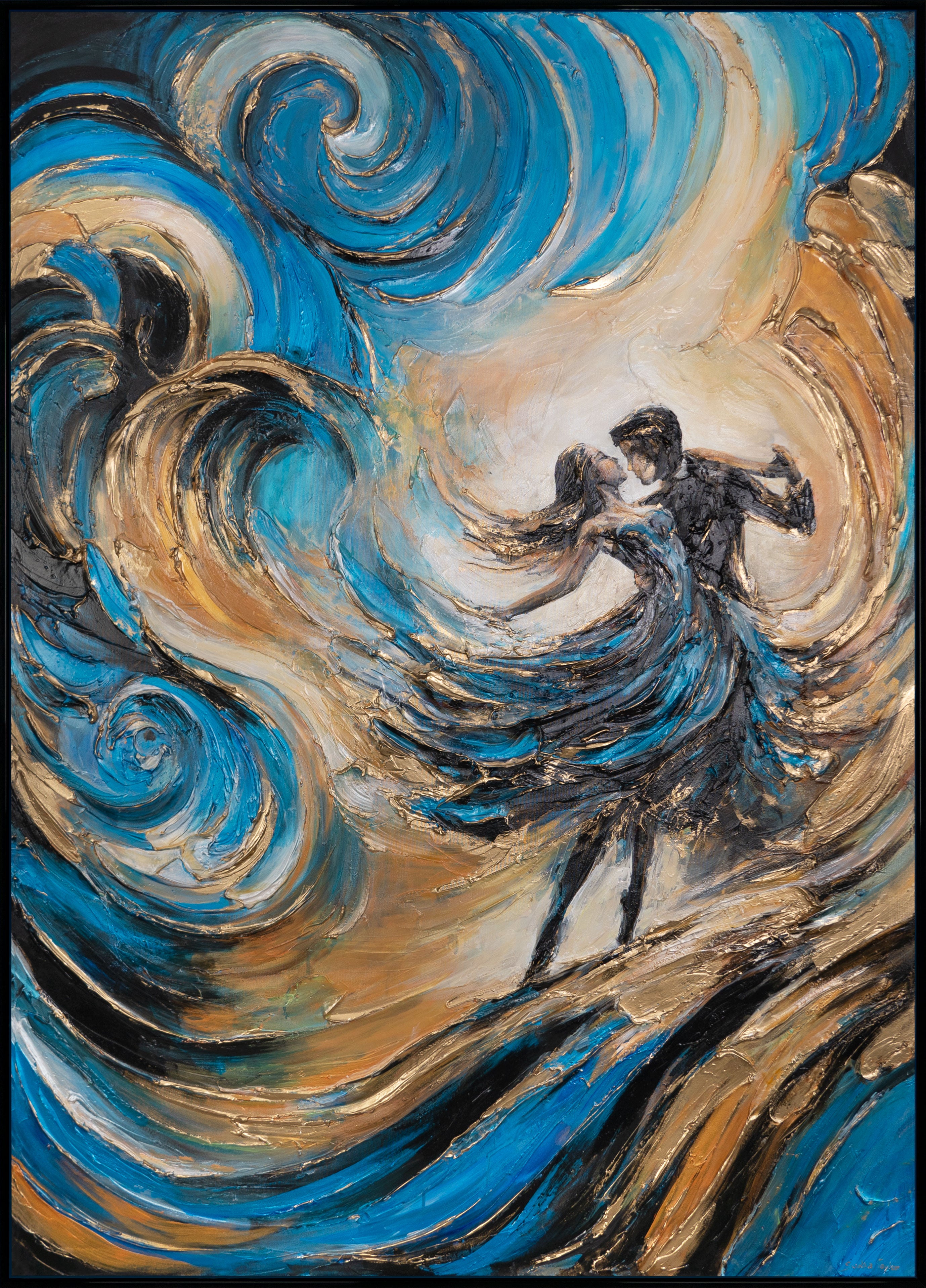 Lærredsmaleriet „Fevalsen“ indfanger magien i et dansende øjeblik, mesterligt udført i flydende bevægelser og en levende farvepalet af blå, guld og jordtoner. De dynamiske penselstrøg og den stærkt strukturerede overflade giver værket intens dybde, der fænger betragteren. Dette billede forener følelser, bevægelse og kunstnerisk finesse på imponerende vis.