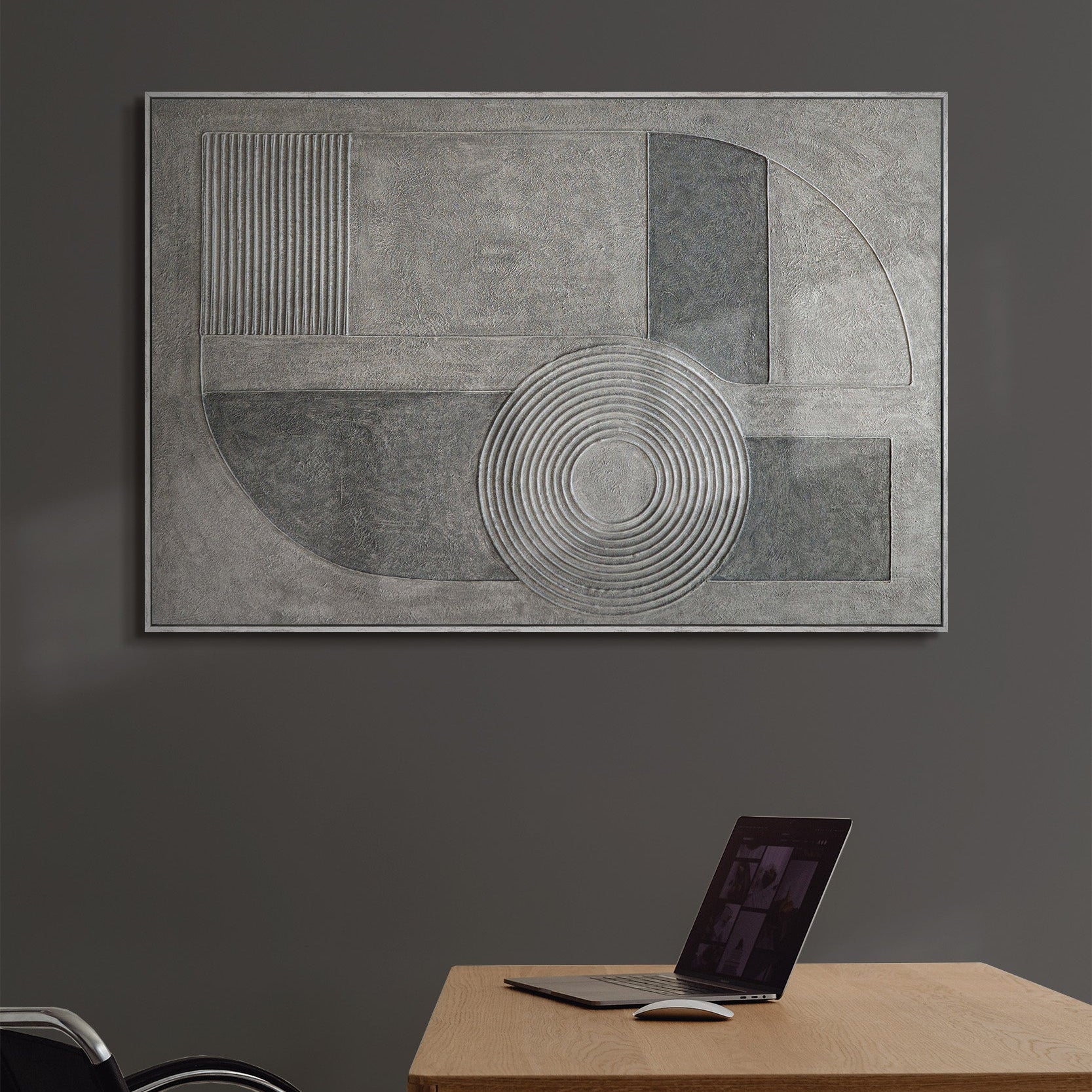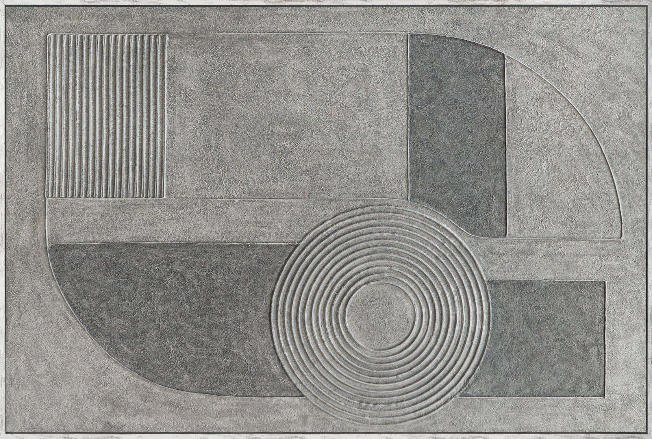 Det abstrakte maleri "Gray Chord" udfolder sin effekt gennem rolige geometriske former, koncentriske cirkler og en fint tekstureret overflade. Forskellige gråtoner blandes til en harmonisk komposition, der udstråler dybde og balance uden visuelt at dominere. Det relieflignende akrylmaleri skaber et fængslende samspil mellem lys, skygge og materialitet.