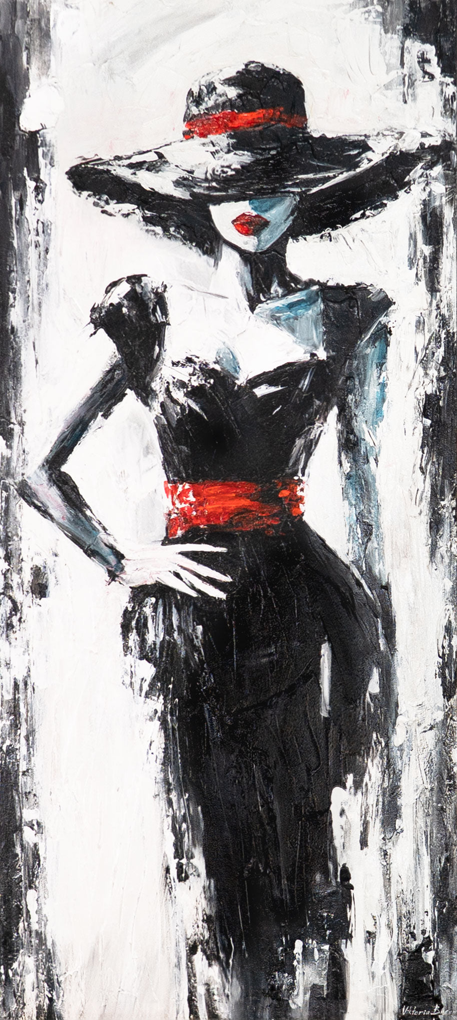 Håndmalet akrylmaleri på lærred "Mystisk Fremmed" viser med ekspressive penselstrøg en abstrakt silhuet af en elegant fremmed i sort, hvid og rød. Den plastiske struktur og stærke farvekontrast skaber en mystisk, moderne atmosfære.
