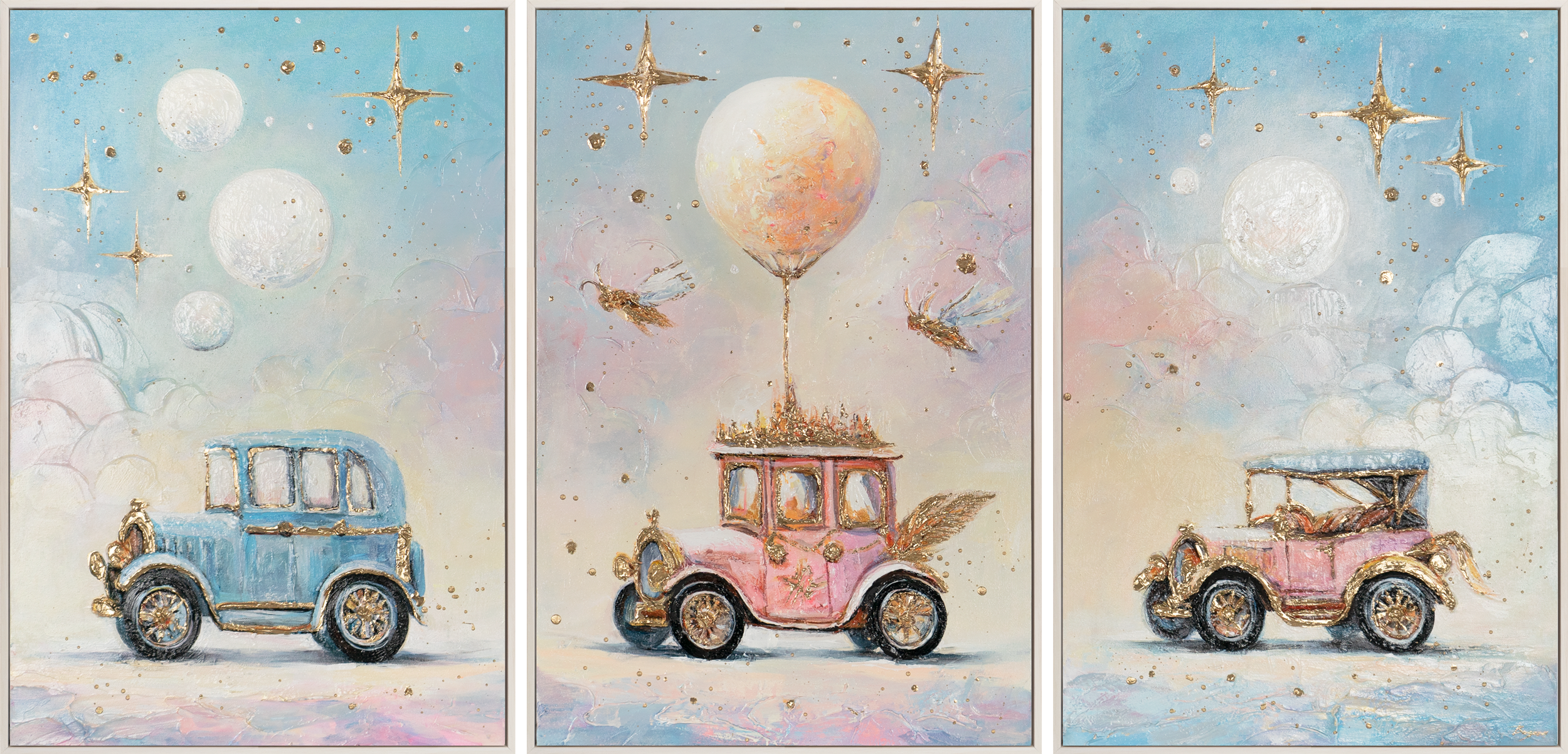 Triptykonet „Eventyrlig Gade“ tager dig med ind i en magisk fantasiverden med kærligt malede, nostalgiske biler og en drømmende himmel, der glimter i bløde pastelfarver og gyldne detaljer. Hver af de tre lærredsmalerier samles til en harmonisk helhed, der fortæller historier og forvandler børneværelset til et eventyrligt sted. Den strukturerede overflade og de varme farveaccenter skaber en unik stemning fuld af tryghed og fantasi.