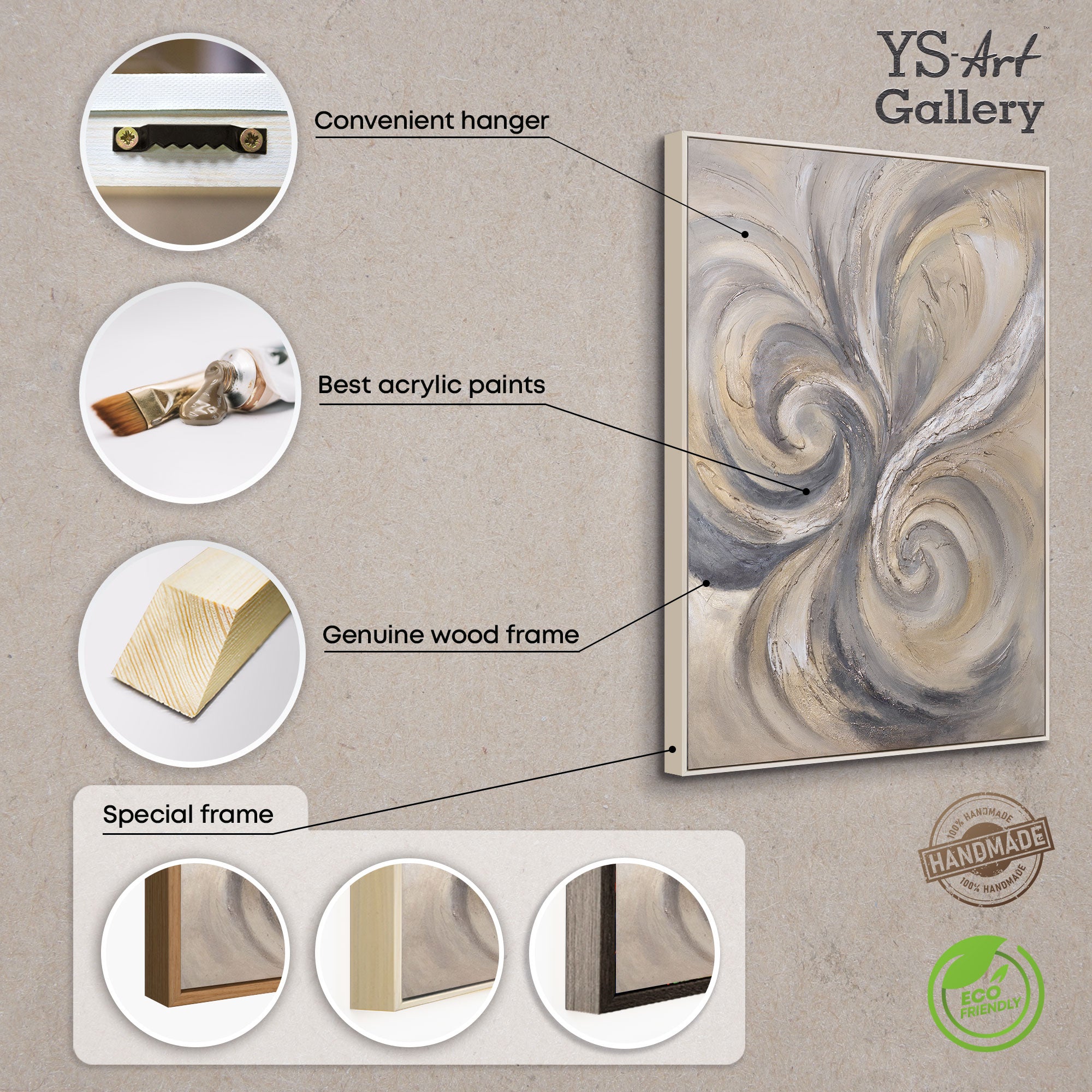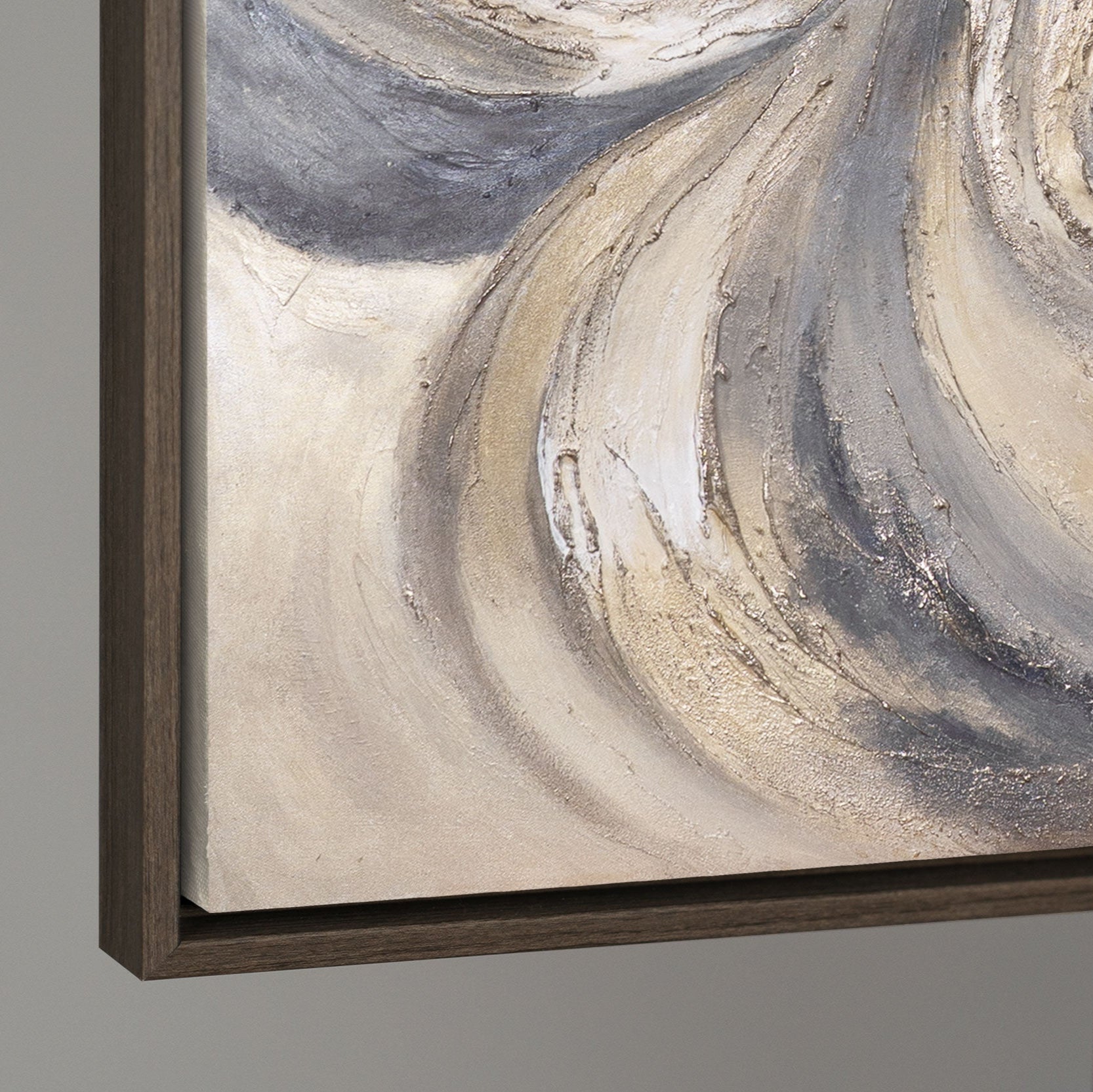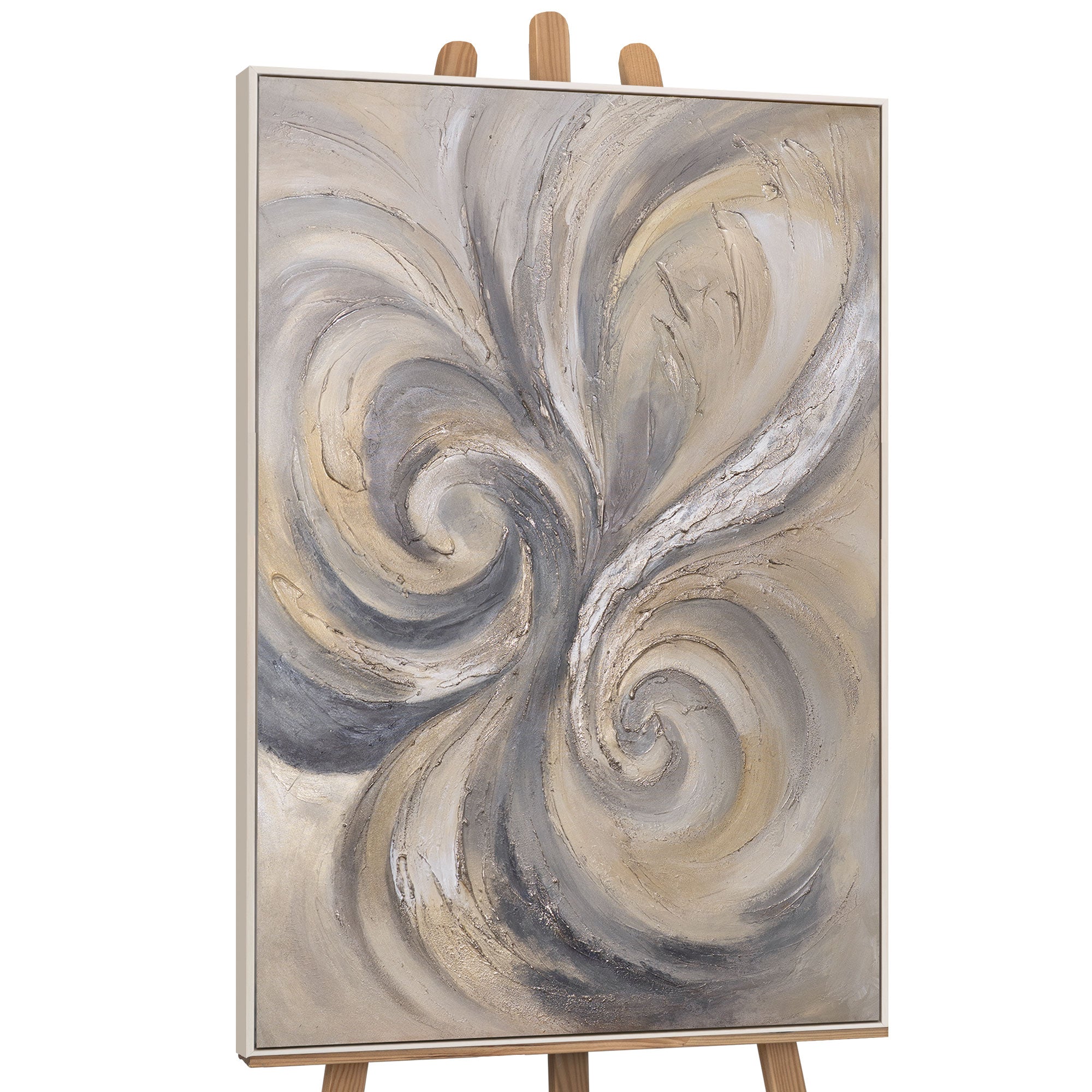 Det håndmalede lærredsmaleri "Sand og skyer" forener bløde beige- og gråtoner i en dynamisk spiralbevægelse. Den strukturerede overflade skaber dybde og minder om den uendelige bevægelse af vind, sand og skyer. Værket fascinerer med sin energi og samtidig harmoniske ro.