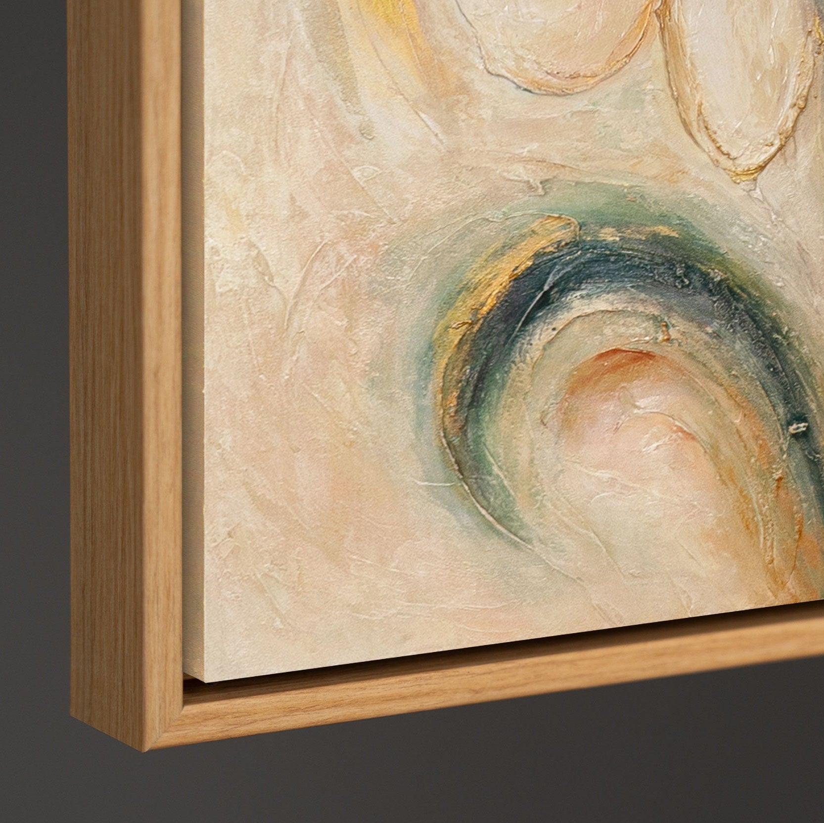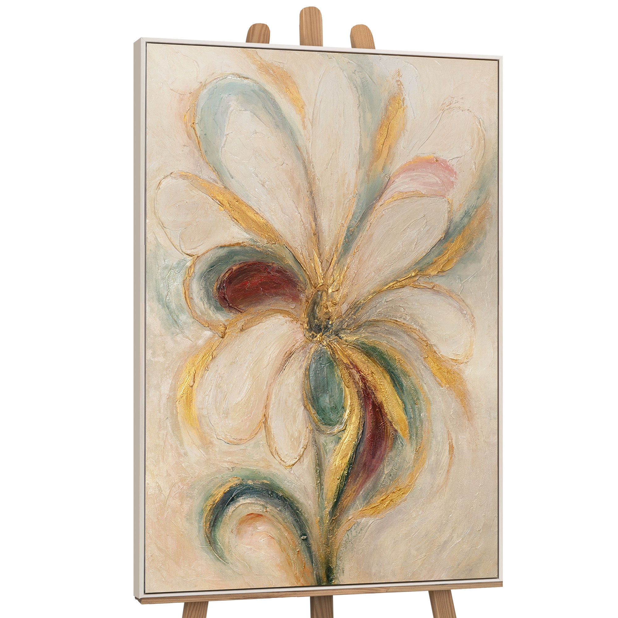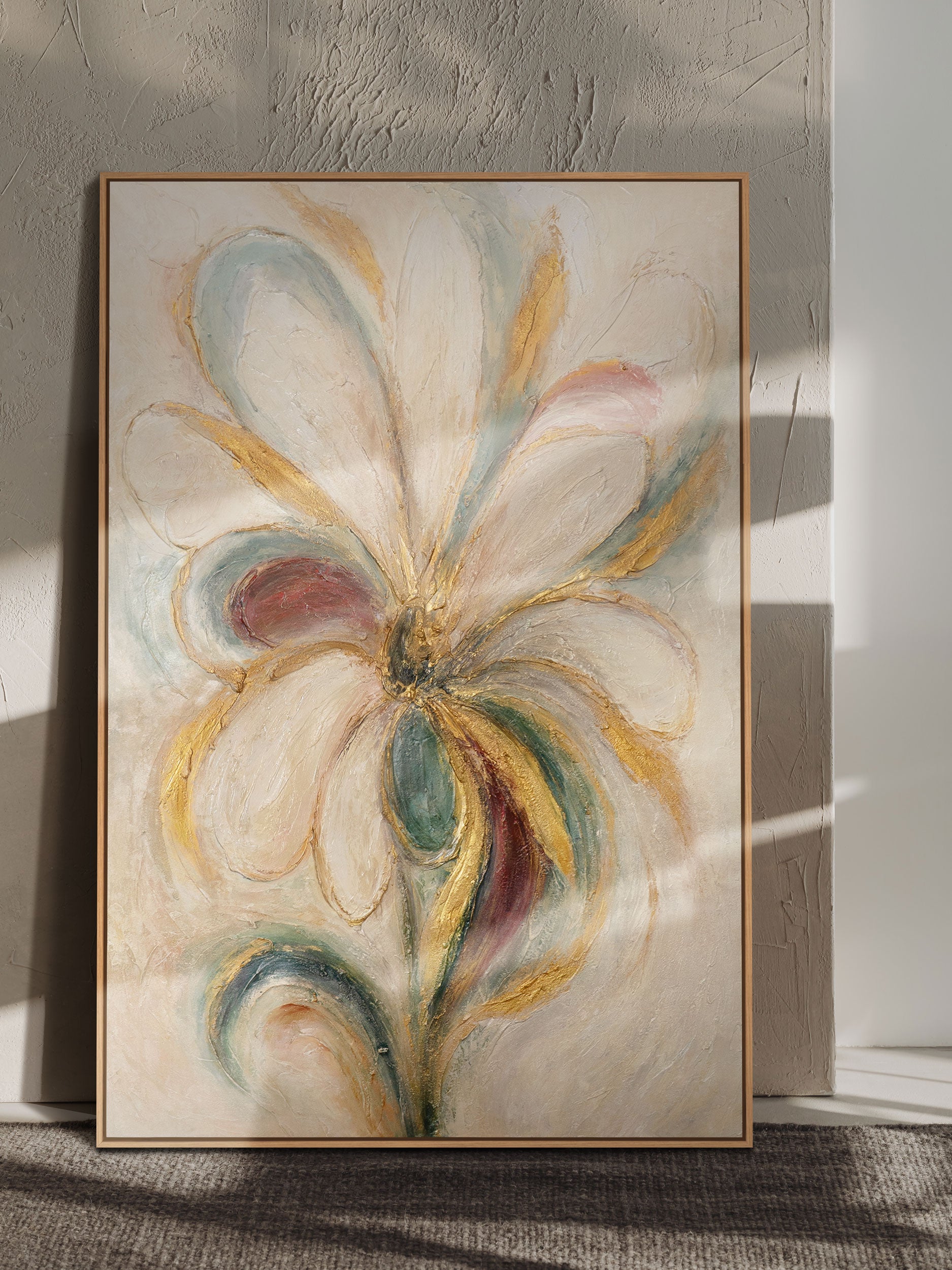 "Blomstrende energi" er et håndmalet akrylmaleri på lærred, der med sin intense farvestyrke og flydende linjer udfolder en floral dynamik. Lysende accenter i guld, grøn og rød møder bløde creme- og beige nuancer, hvilket skaber et harmonisk og samtidig levende udtryk. Den plastiske struktur giver kunstværket dybde og bevægelse, som minder om en stiliseret blomst i vinden.