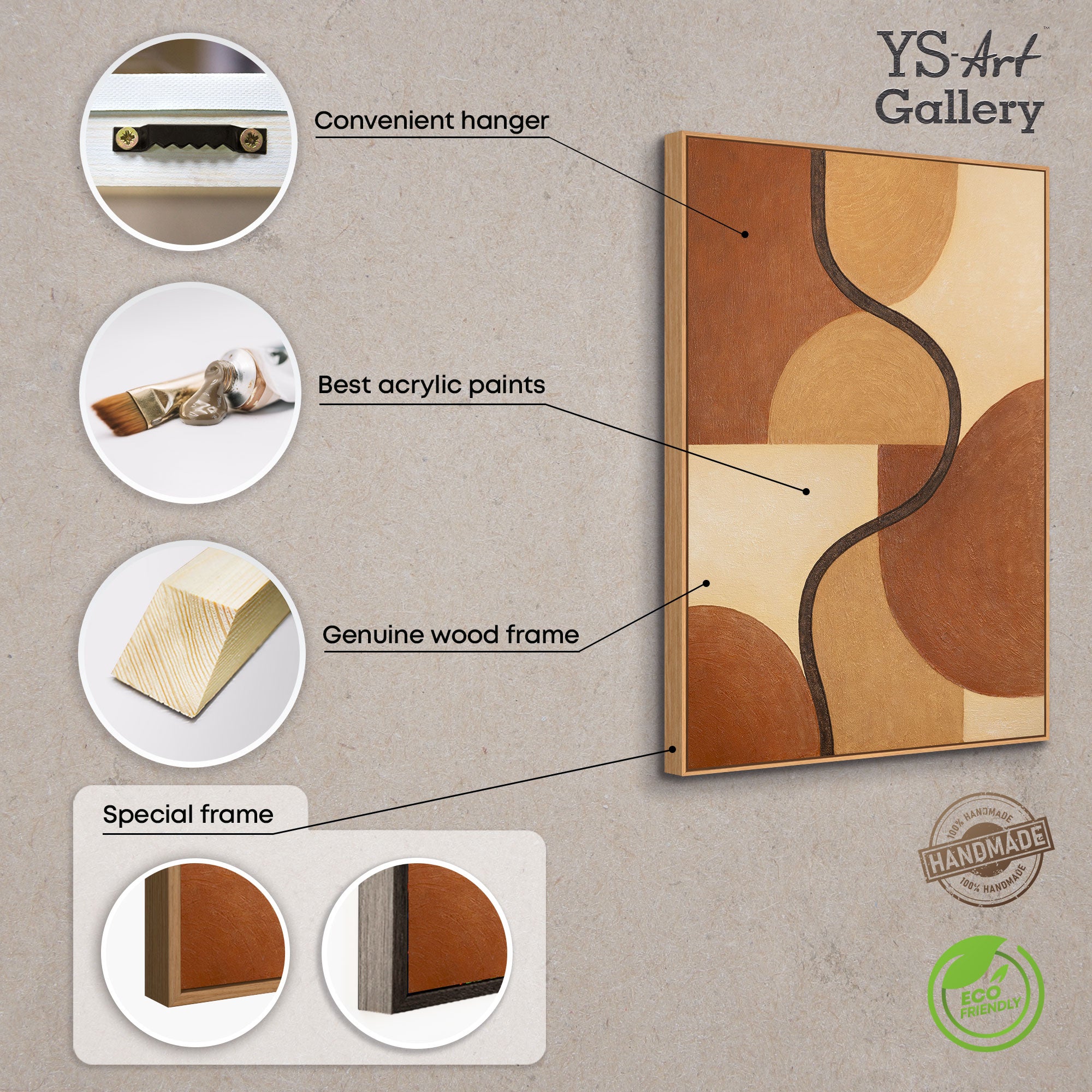 "Forbindelse af former" er et håndmalet acrylmaleri, der imponerer med sin harmoniske kombination af linjer og flader. Kompositionen i varme nuancer af brun, beige og okker skaber naturlig dybde og en følelse af bevægelse. Den strukturerede overflade giver de geometriske former dynamik og en moderne, taktil udstråling.