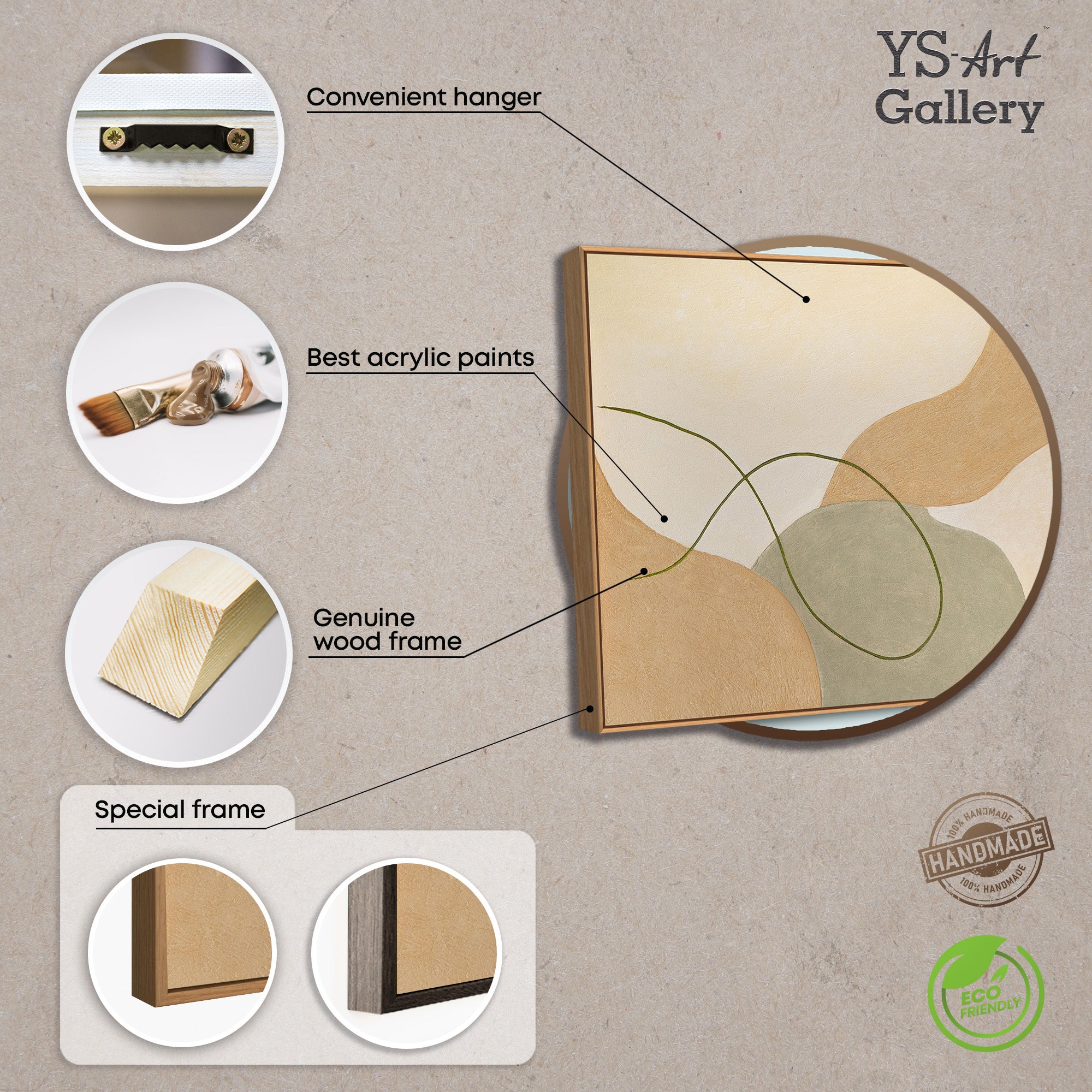 Dette håndmalede lærred præsenteres indrammet og er ideelt som moderne vægkunst til åbne, moderne interiører. Det subtile farveskema blander sig harmonisk med forskellige interiører og bidrager til en rolig og afbalanceret atmosfære uden at være overvældende.