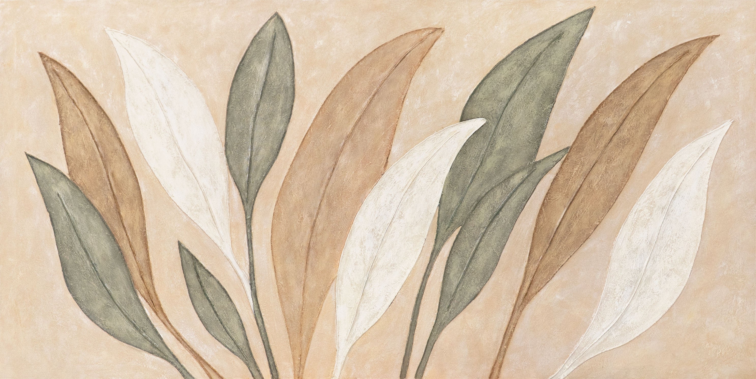 Bring naturens skønhed ind i dit hjem med det håndmalede lærredsmaleri "Bladenes dans". Bløde jordfarver i beige, brun og grøn smelter harmonisk sammen med klare linjer og en struktureret overflade. Den elegante komposition udstråler ro og naturlighed, mens de organiske bladmønstre tilfører en tidløs lethed.