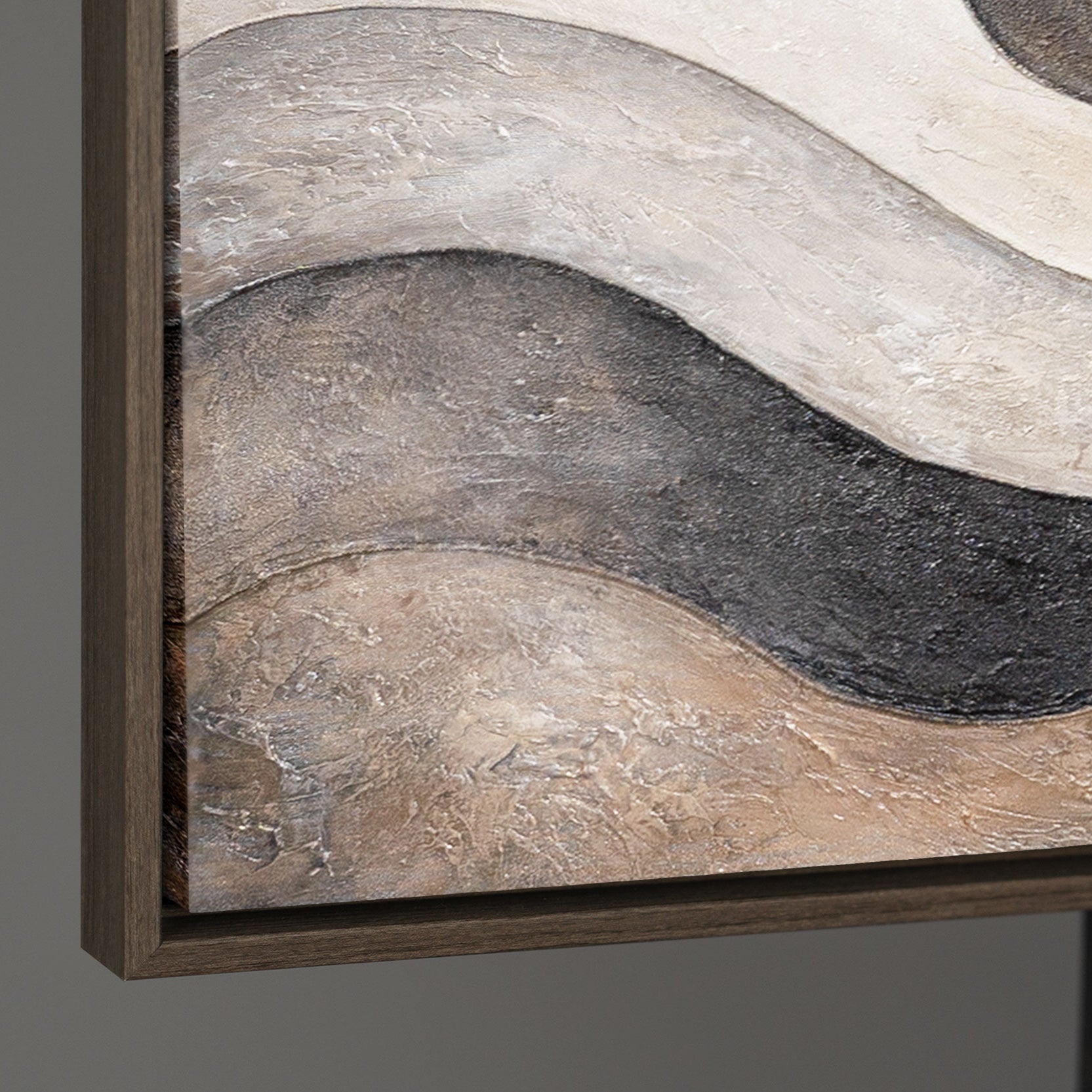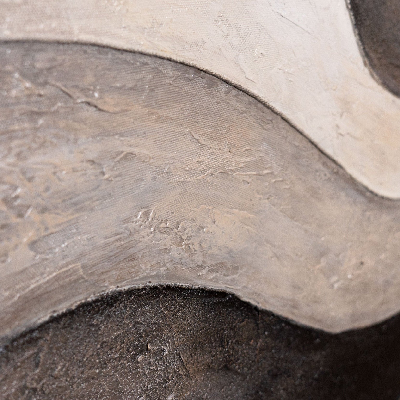 Akrylmaleriet "Sandbølger" er et håndmalet lærredsbillede, der imponerer med sine organiske former og en raffineret struktur. I bløde toner af beige, creme, grå og sort fremstår bølgende linjer, der minder om naturlige klitlandskaber. Hvert penselstrøg tilføjer dybde og bevægelse til kompositionen, hvilket skaber et harmonisk spil af lys og skygge.
