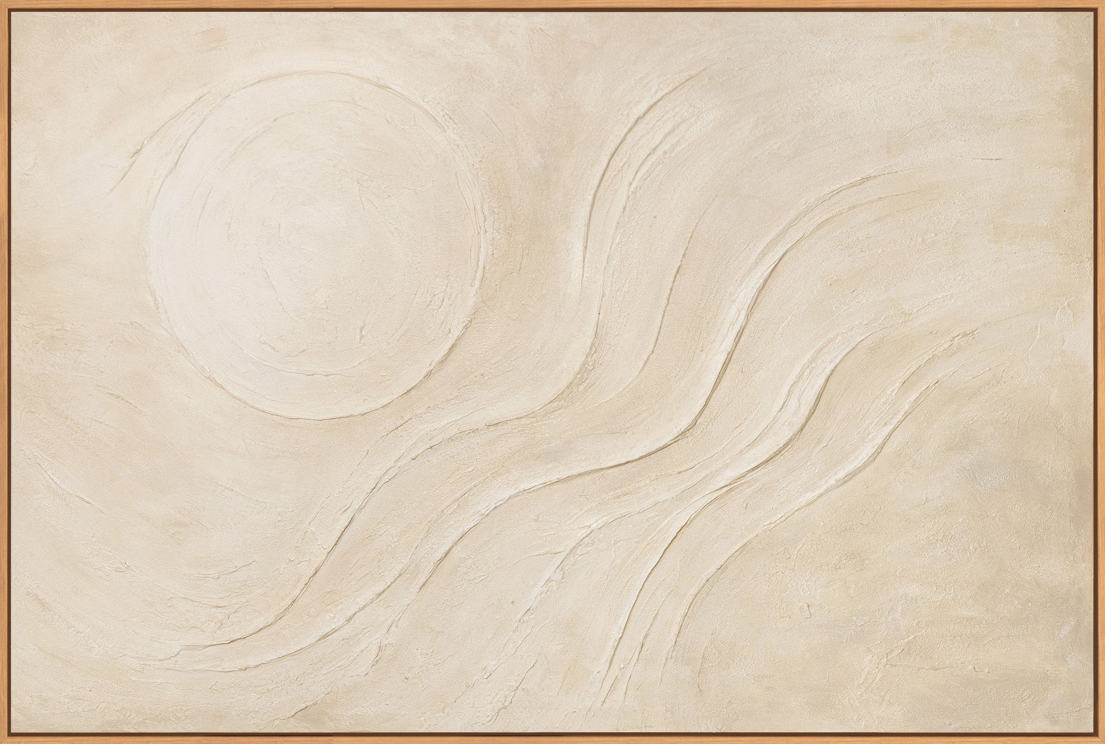 "Sandy Sun" er et abstrakt akrylmaleri med en blød, mineralsk tekstur og en varm, lys farvepalet. Delikate beige-, sand- og cremefarvede toner kombineres med flydende linjer og en cirkulær form, der minder om solskin, varme og naturens rolige kræfter.