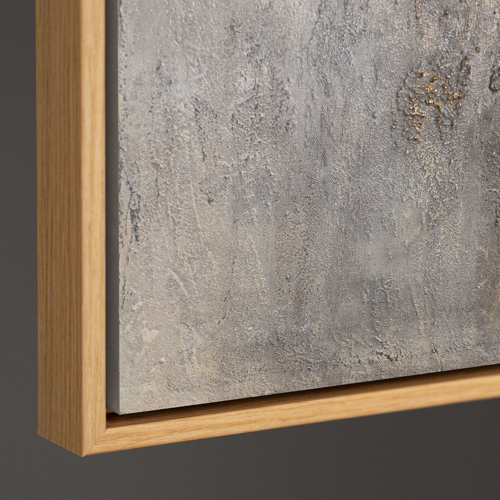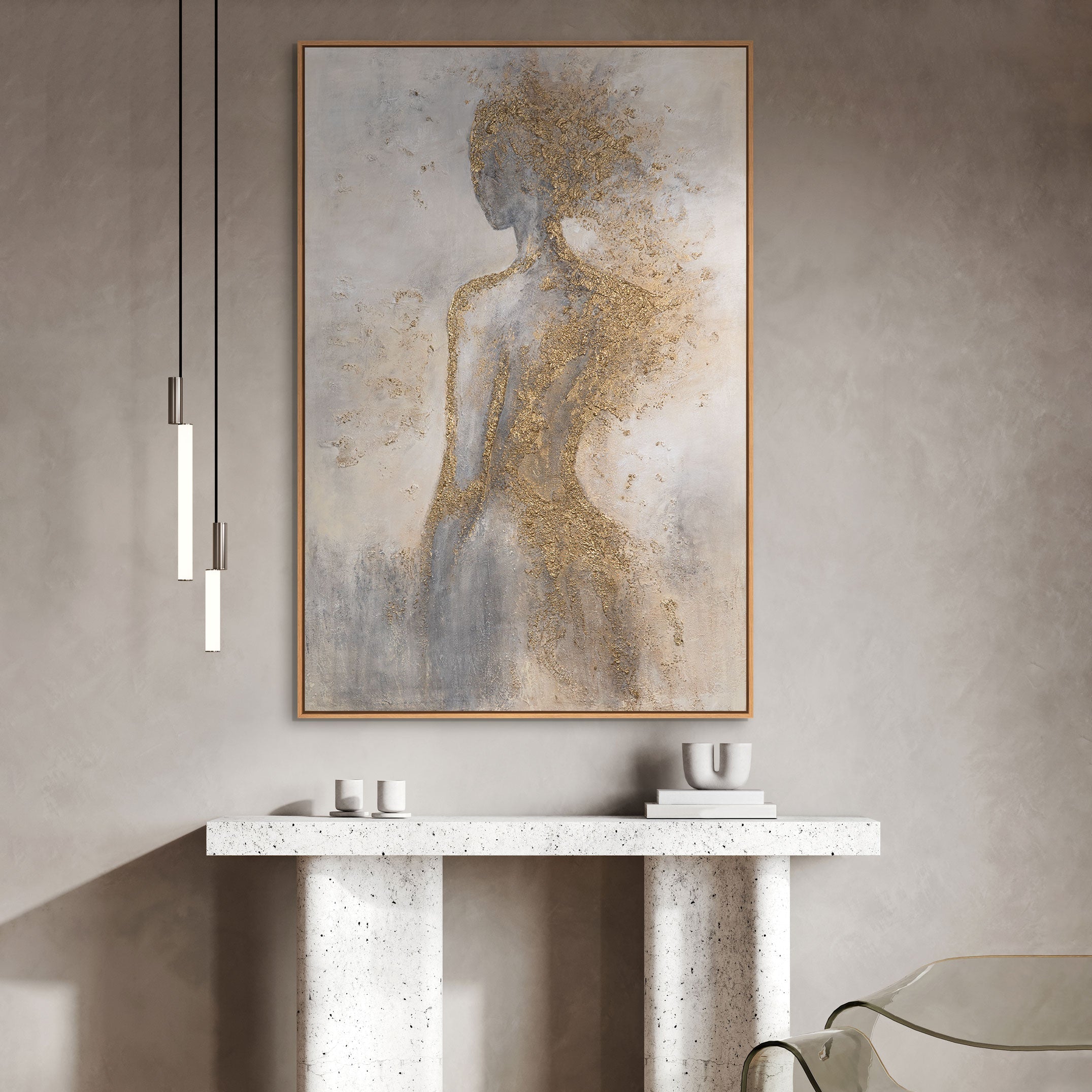 "Gylden aura" udtrykker feminin elegance og lys harmoni. En fin silhuet træder frem fra glitrende guld og tågegrå nuancer – et spil af lys, bevægelse og struktur, der skaber magisk dybde og luksuriøs tekstur. Den håndpåførte guldstruktur giver værket et eksklusivt og sanseligt udtryk.