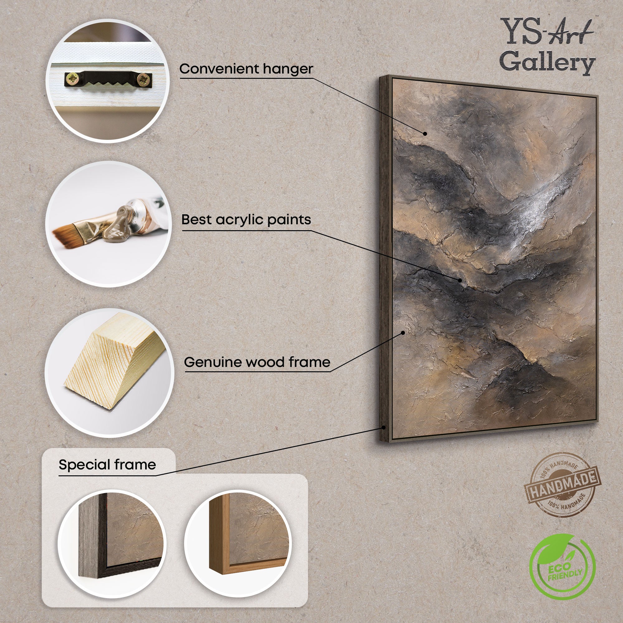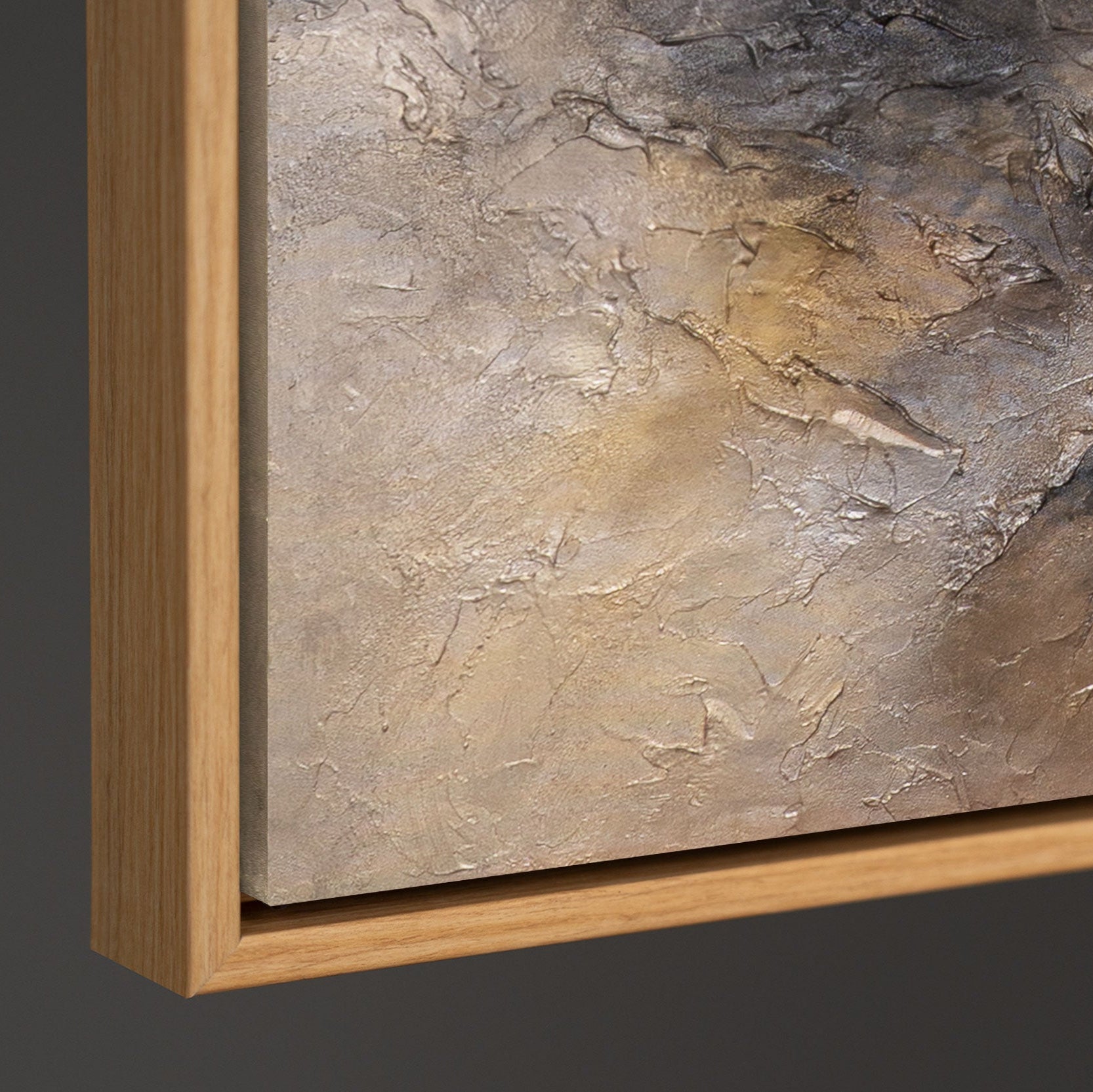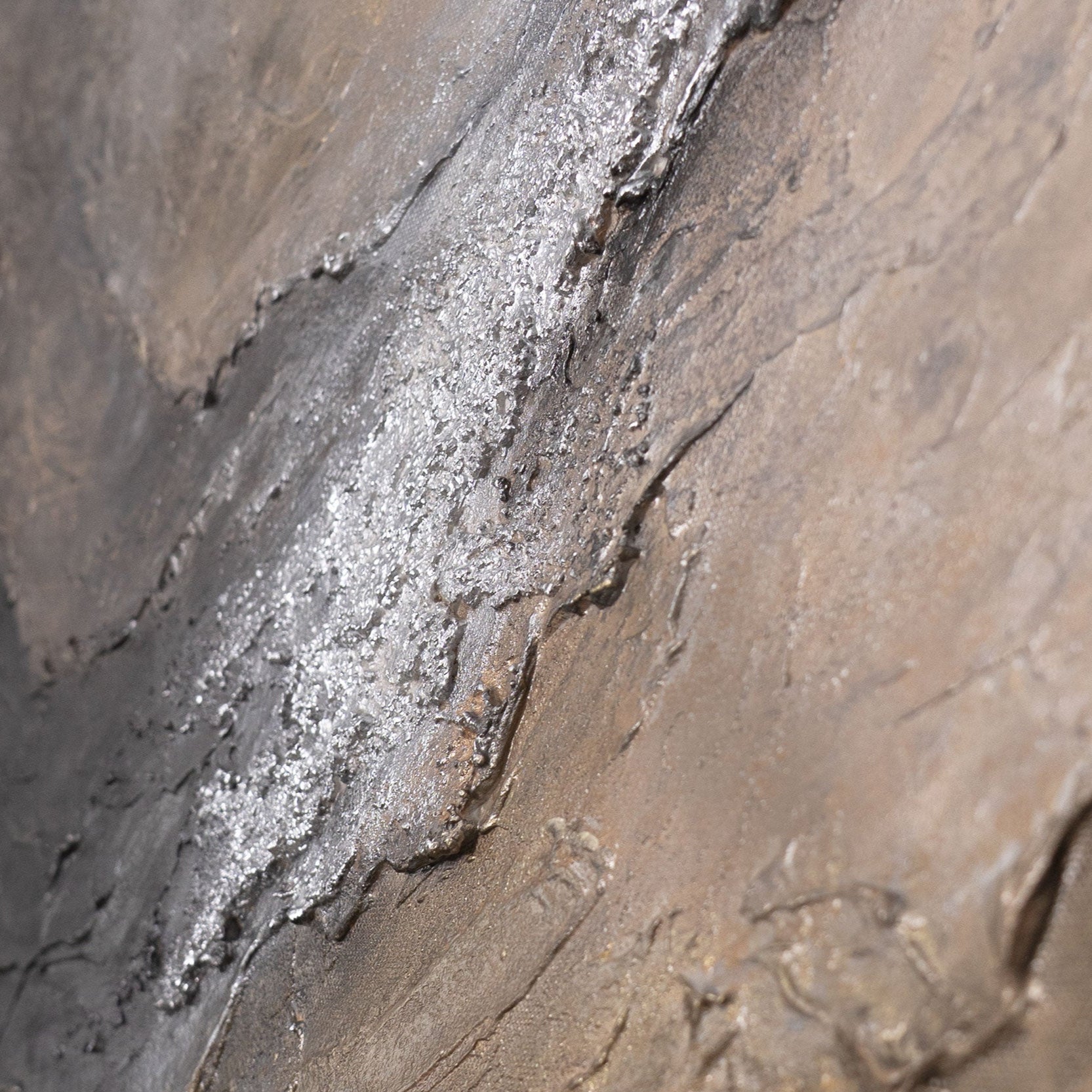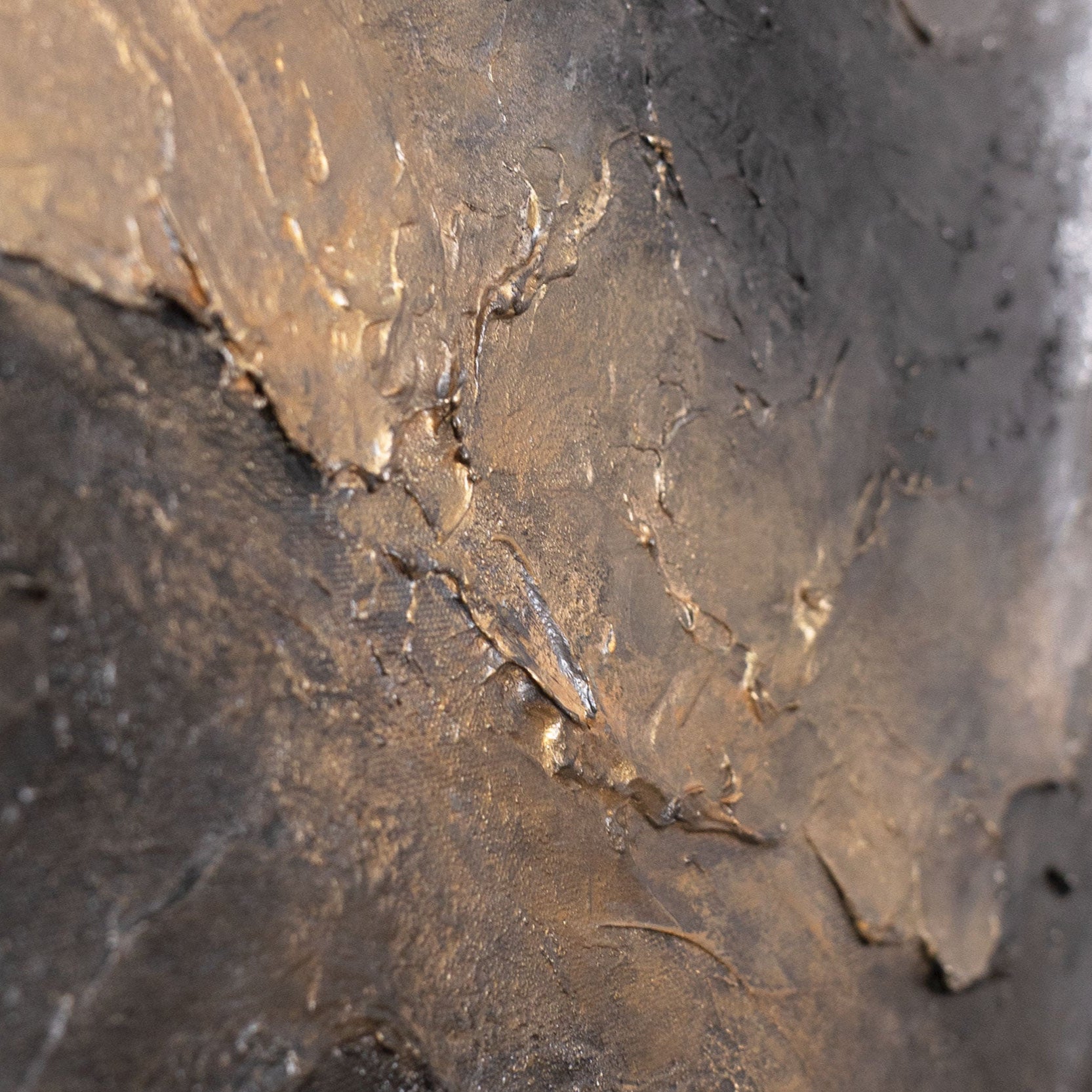 Det abstrakte lærredsbillede "Mørke og daggry" viser et kraftfuldt samspil mellem dyb sort, jordbrun og metallisk skinnende accenter. Den reliefagtige struktur skaber et levende indtryk af bevægelse, der minder om overgangen fra nat til dag.