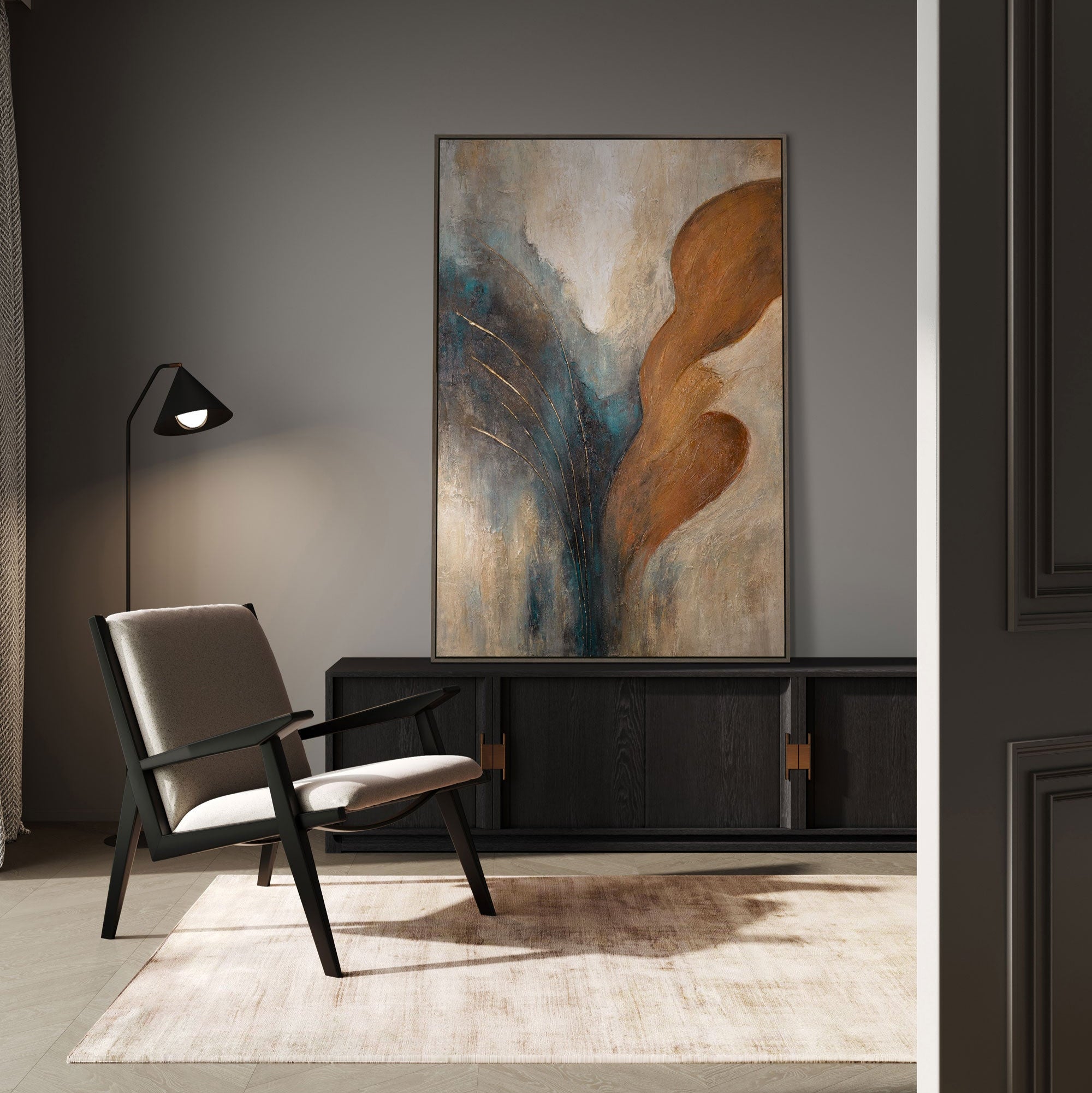 Dette håndmalede lærredsmaleri passer perfekt til både moderne og klassiske interiører. Uanset om det hænger i stuen, spisestuen eller på kontoret, sætter det stilfulde accenter og bringer en dynamisk, men samtidig harmonisk atmosfære ind i rummet.