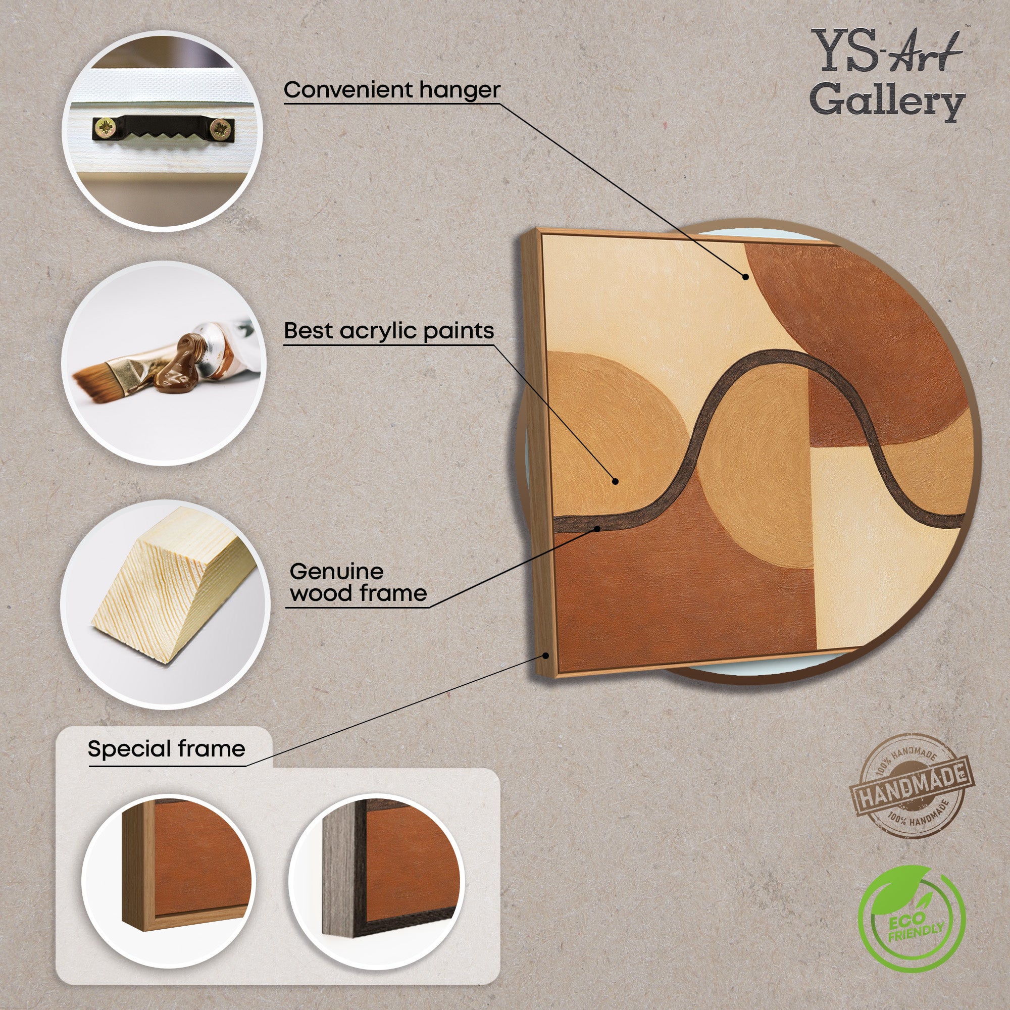 Dette håndmalede lærredskunstværk præsenteres indrammet og er ideelt som moderne vægkunst til stuer, spisestuer eller stilfulde arbejdsområder. Kombinationen af klar geometri og bløde overgange giver struktur, ro og en sofistikeret atmosfære til ethvert rum.