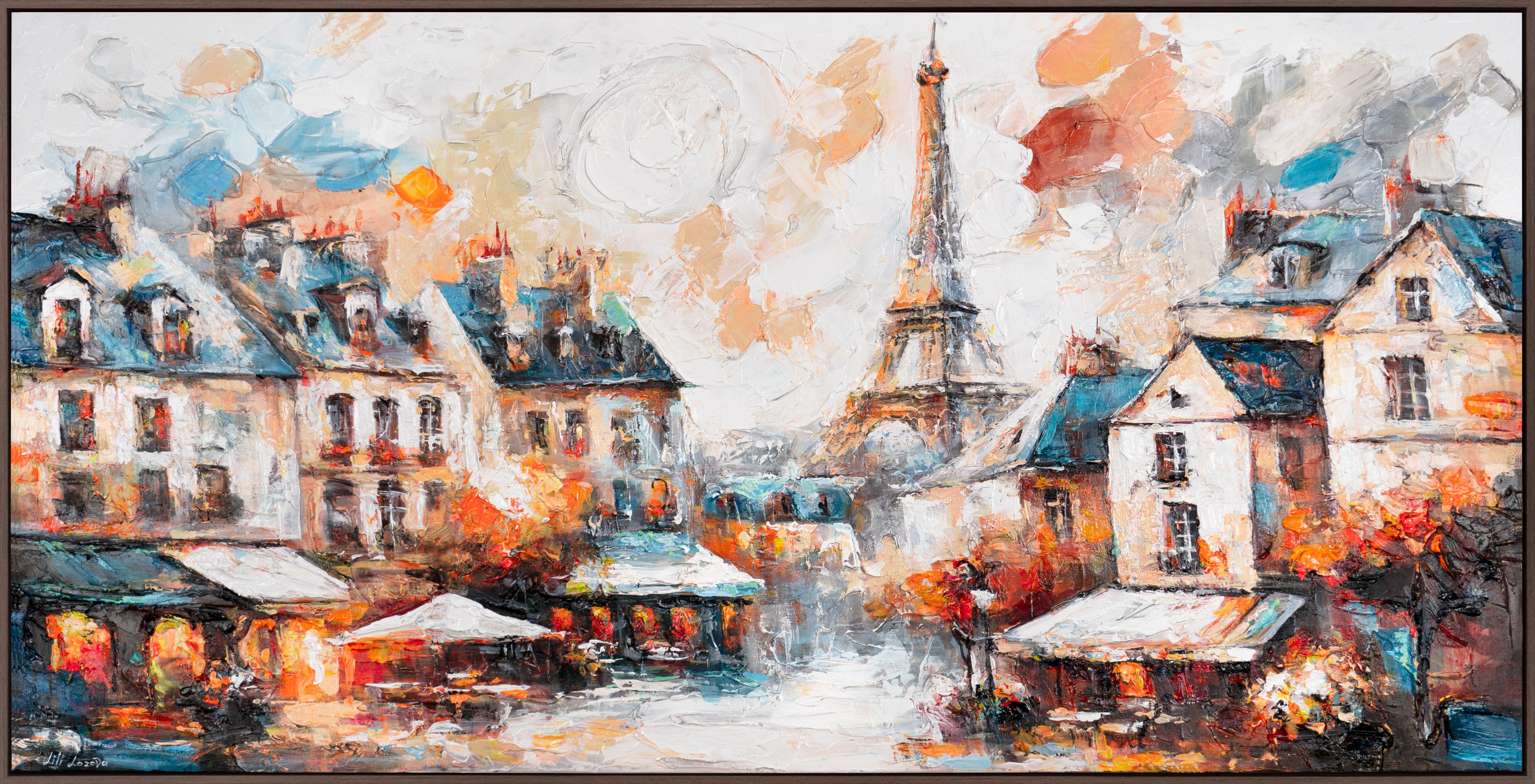 "Paris’ hygge" er et håndmalet akrylbillede på lærred, der skildrer en stemningsfuld byscene med Eiffeltårnet og charmerende caféer. De levende farver og abstrakte strukturer gør dette kunstværk til et ideelt vægmaleri til stuen for elskere af abstrakt kunst og bybilleder på lærred.