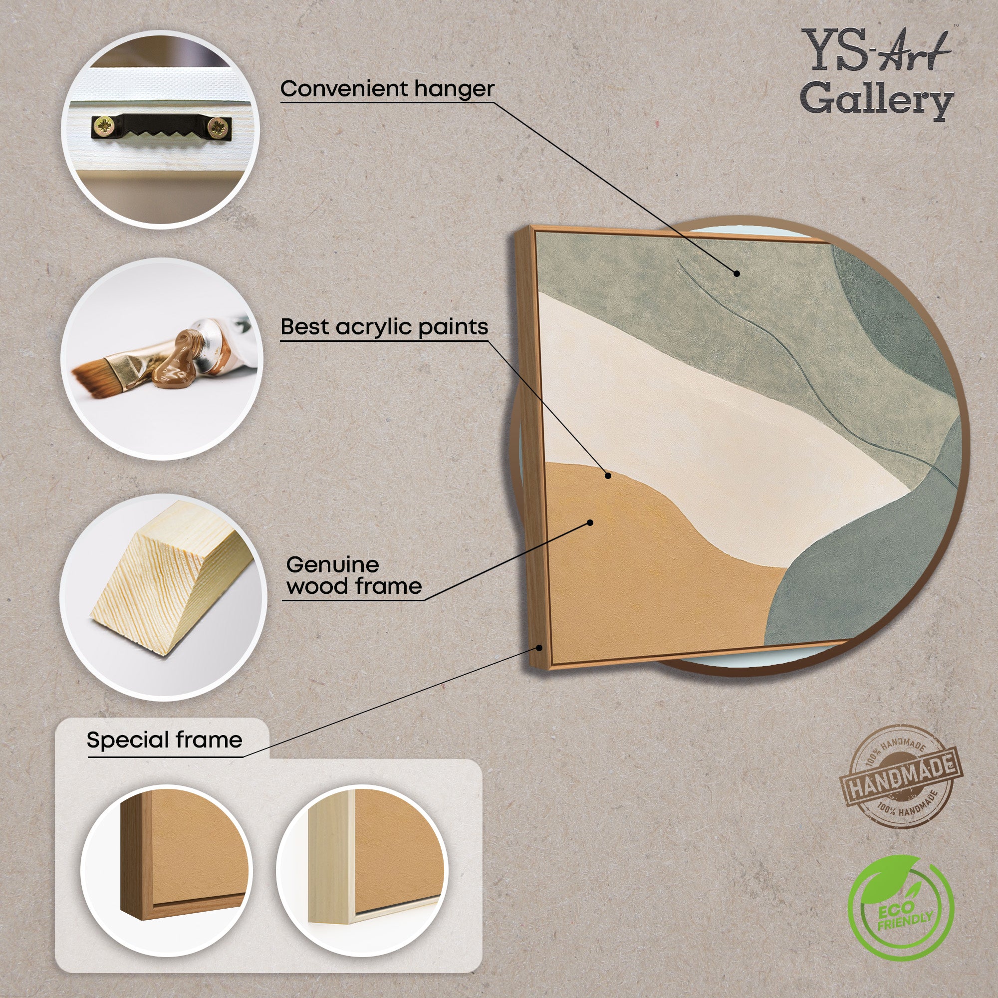 Dette håndmalede kunstværk præsenteres som moderne vægdekoration i en ramme og er velegnet til en række forskellige interiører. Takket være sin minimalistiske farvepalet og afbalancerede struktur kan dette akrylmaleri kombineres på mange måder og integreres problemfrit i moderne indretningskoncepter.