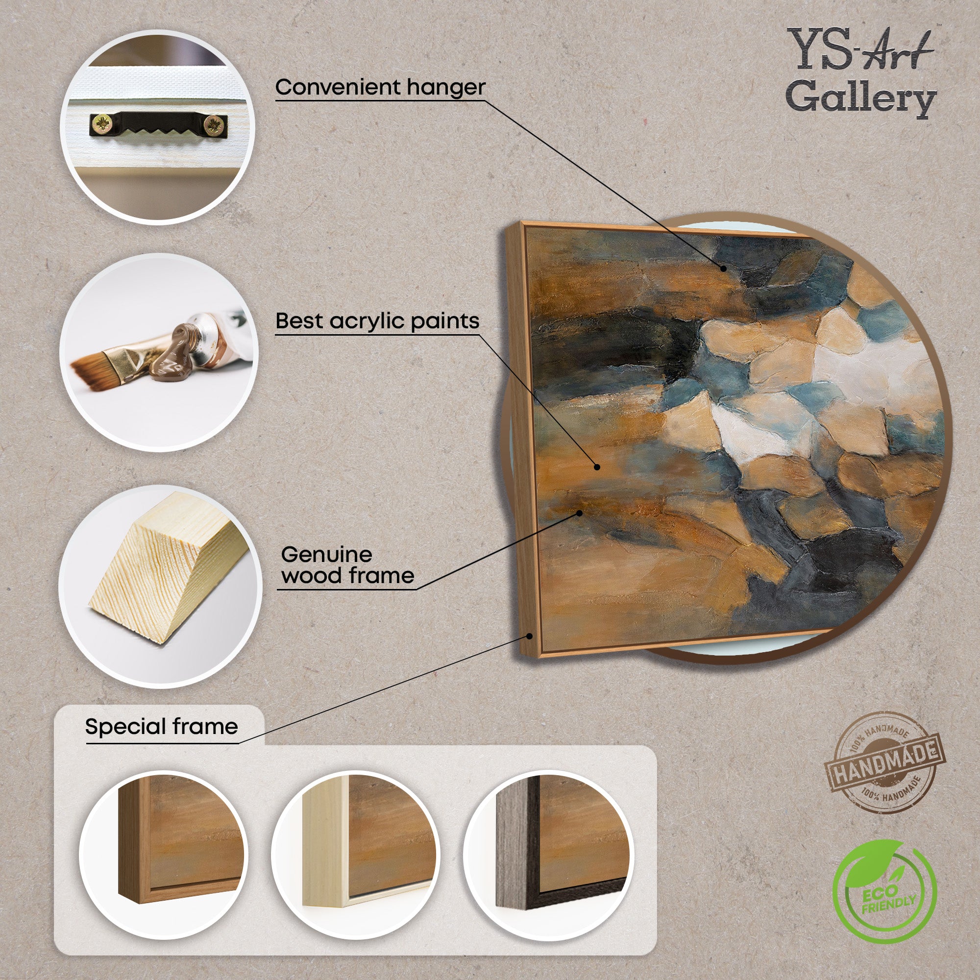 - Farver: Beige, brun, blå, grå