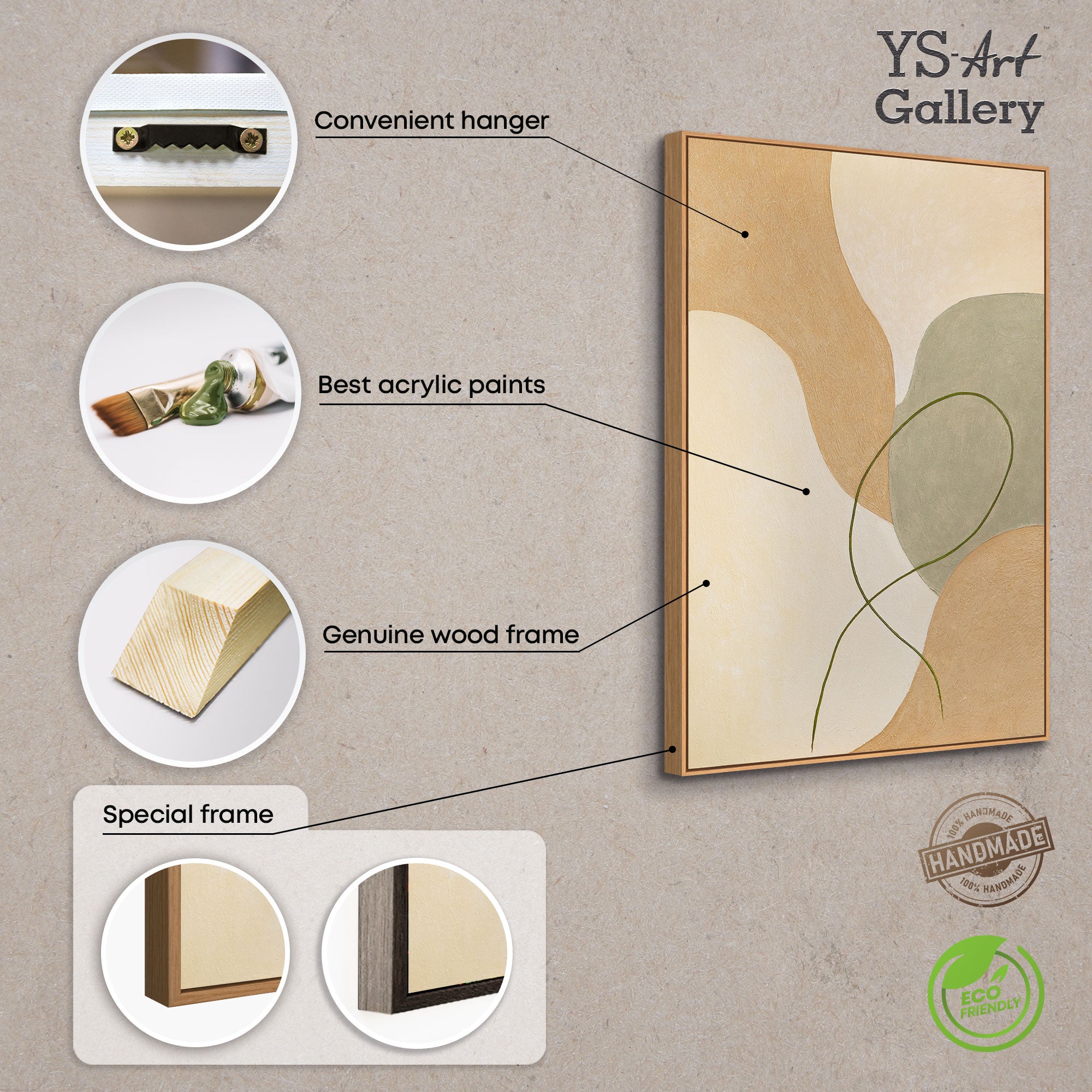 "Forbindelse" er et håndmalet acrylmaleri, der imponerer med sine bløde linjer og harmoniske farvesammensætning. Sarte beige- og cremefarver kombineres med et let grønt strøg, som skaber en rolig og organisk bevægelse, der både virker elegant og moderne.