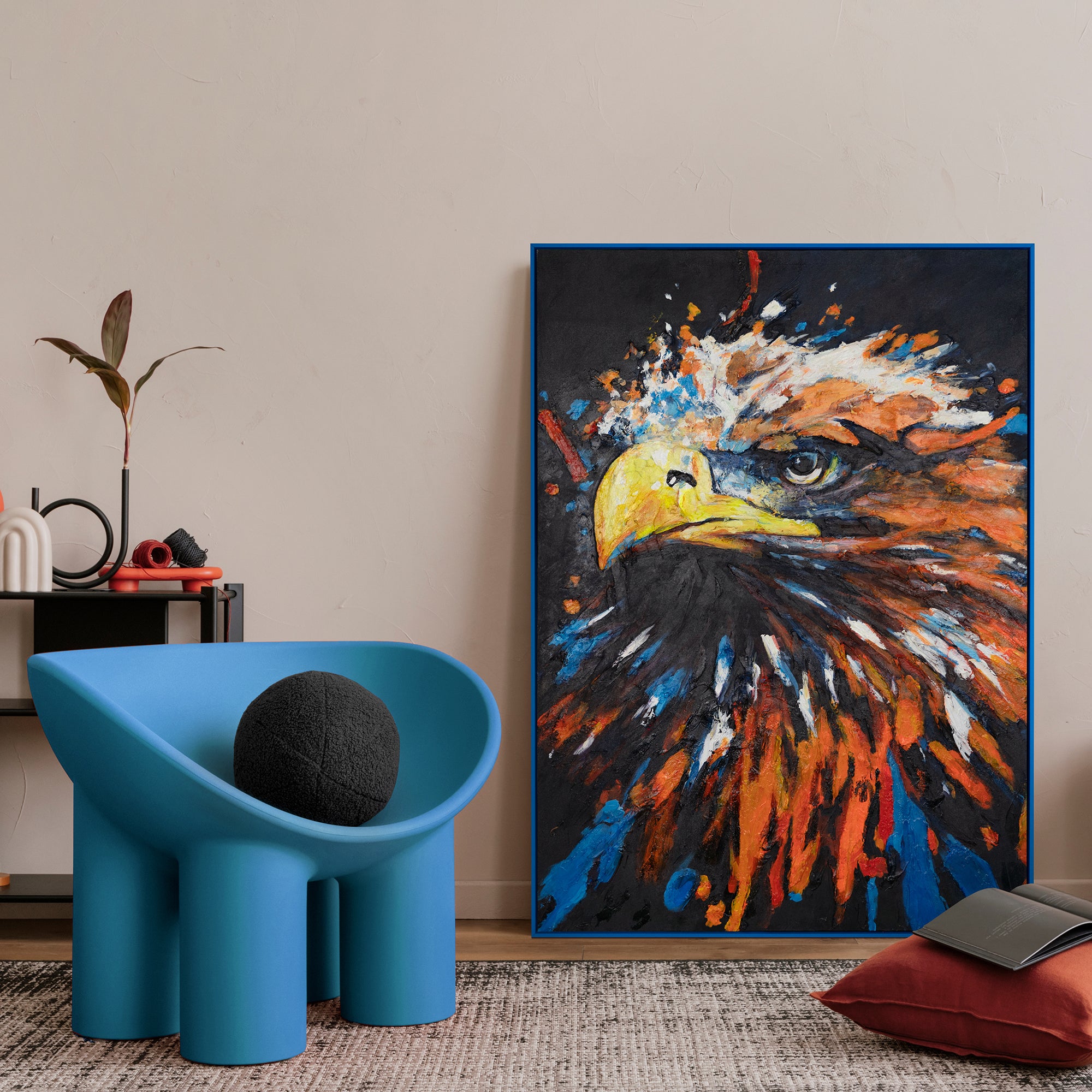 Oplev den majestætiske skønhed i dette håndmalede abstrakt maleri på lærred, der skildrer en kraftfuld ørn i levende farver og ekspressive penselstrøg. Maleriet er skabt med akrylfarver på solidt lærred og har en imponerende tekstur, som skaber dybde og liv. Et perfekt element til at fremhæve stemningen i din stue eller dit kontor.