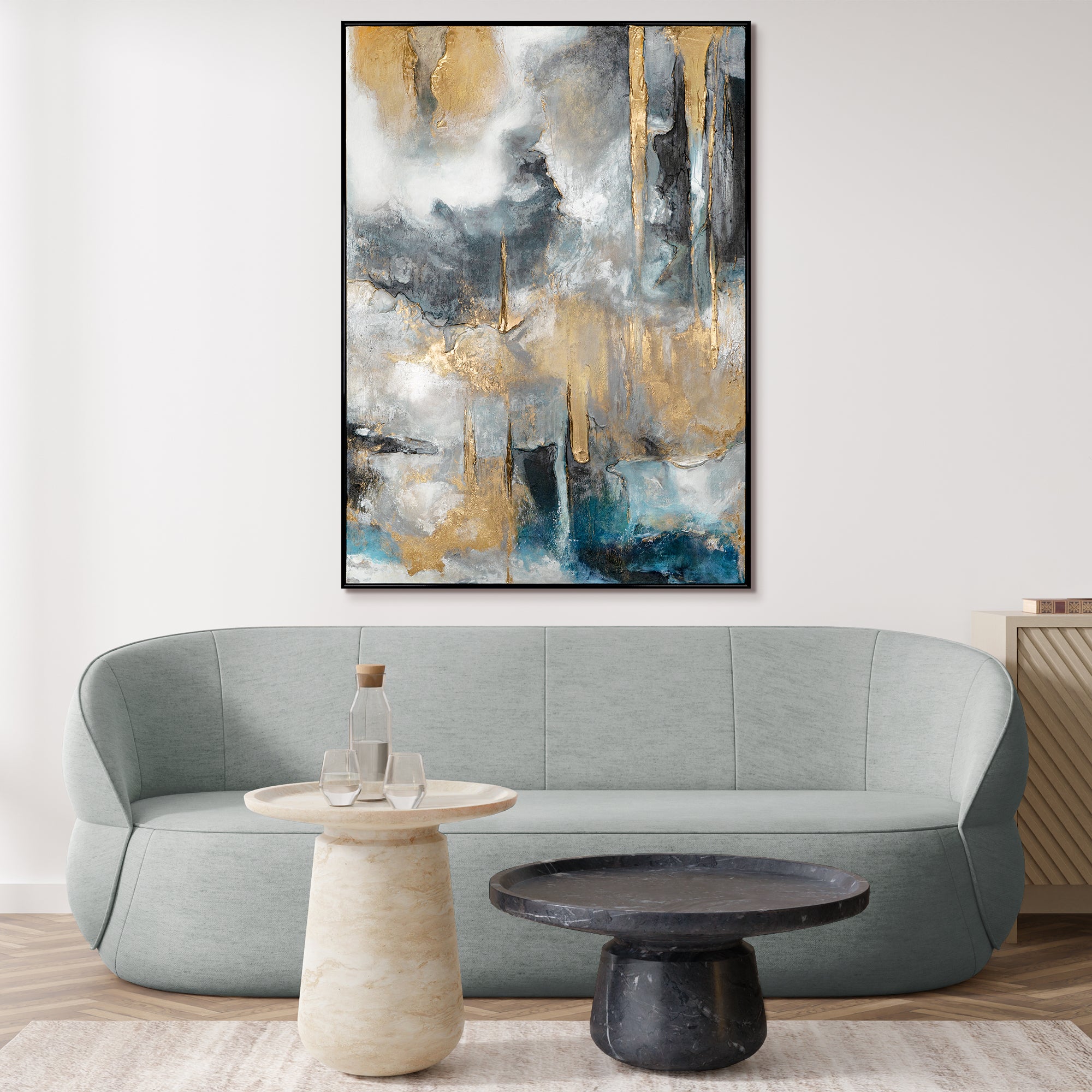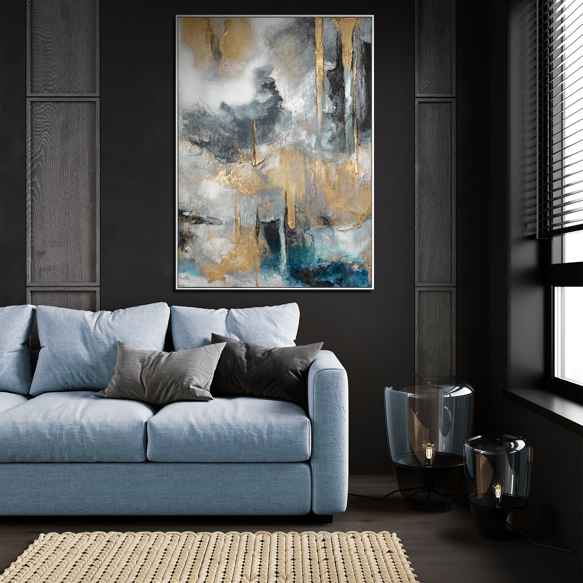 Berig dit hjem eller kontor med dette elegante, abstrakte kunstværk, der gennem gyldne og blå toner skaber en dynamisk og moderne komposition. Billedet imponerer med stærke kontraster og ekspressive penselstrøg. Det er 100 % håndmalet kunst og fremhæves af en elegant ramme.