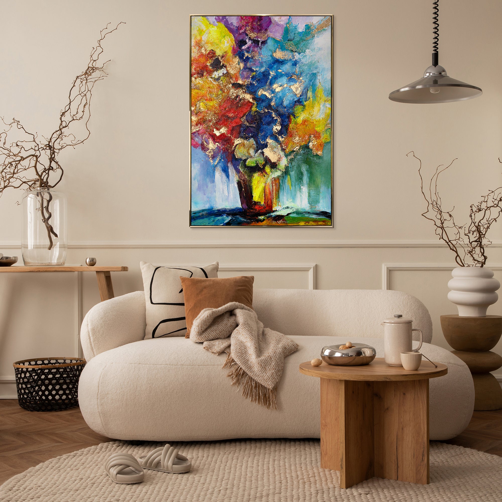 Berig dit hjem med dette farverige, abstrakte kunstværk, som skildrer naturens skønhed i levende nuancer. Værket imponerer med intense farvetoner og udtryksfulde penselstrøg. Det er 100 % håndmalet og fremhævet af en moderne guldramme.
