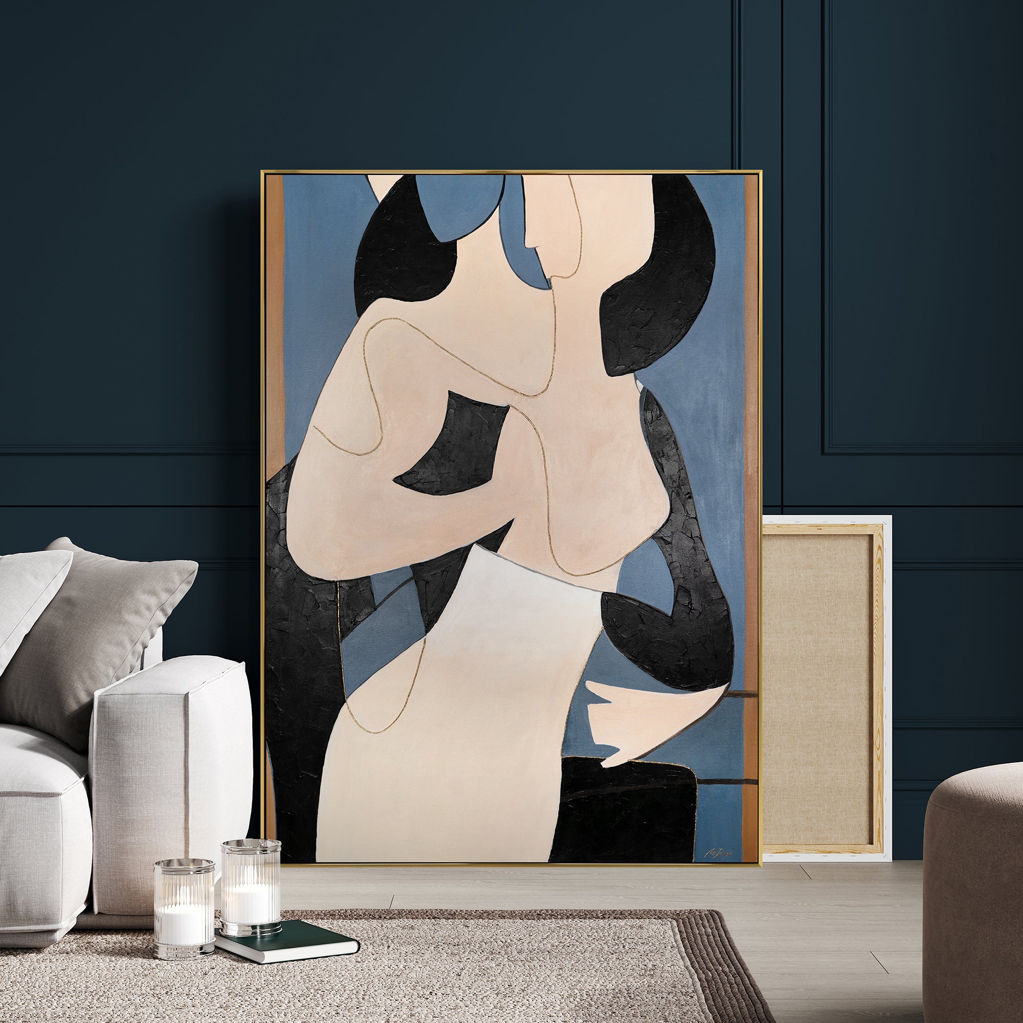 Opdag skønheden i moderne kunst med dette eksklusive, håndmalede billede på lærred abstrakt. Dette unikke værk er skabt af en talentfuld kunstner og viser to figurer i et fascinerende abstrakt kunst-design, der løfter dit interiør til et nyt niveau af design. Maleriet måler 60×90 cm og er udført på højkvalitets lærred, der sikrer lang holdbarhed.
