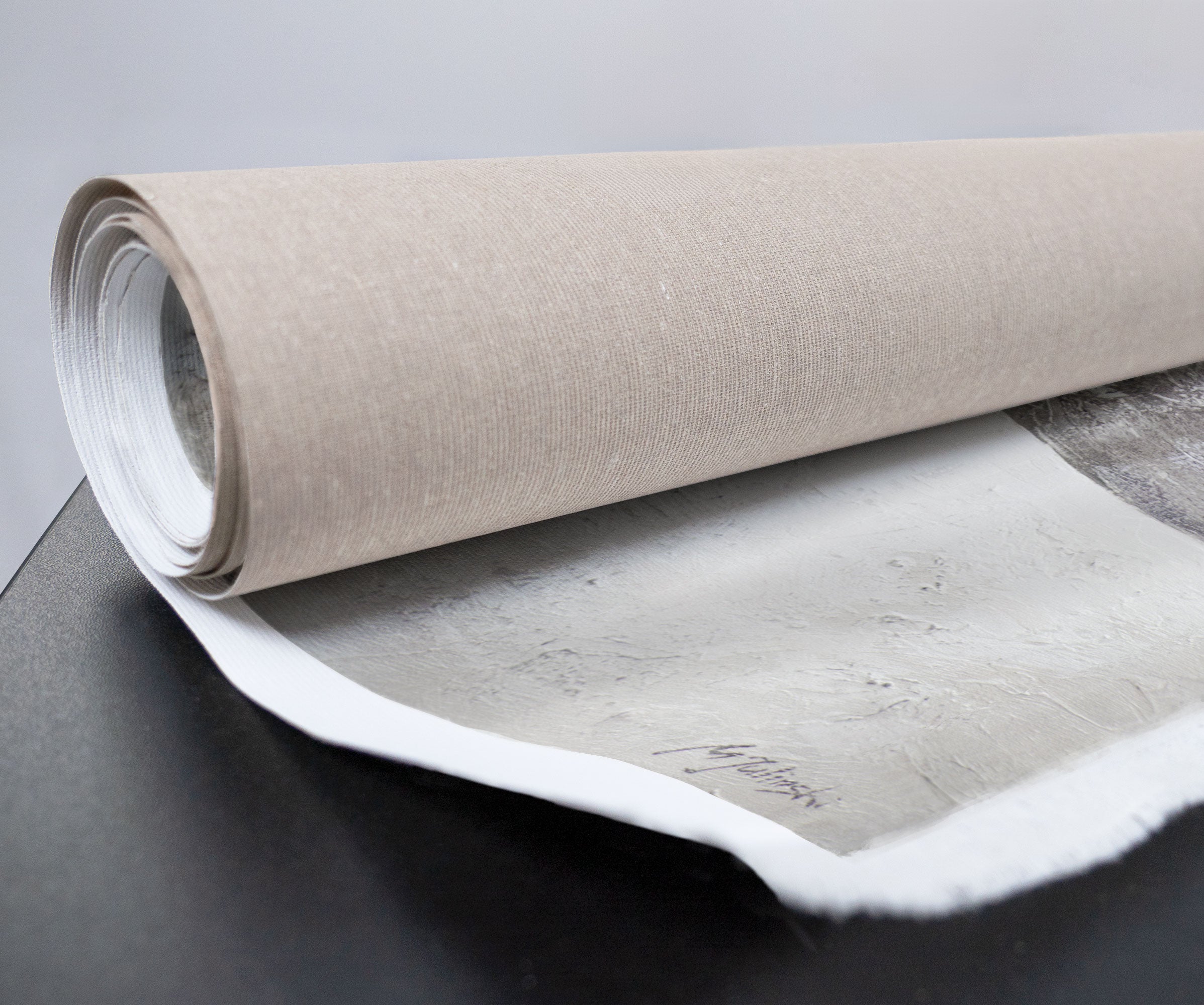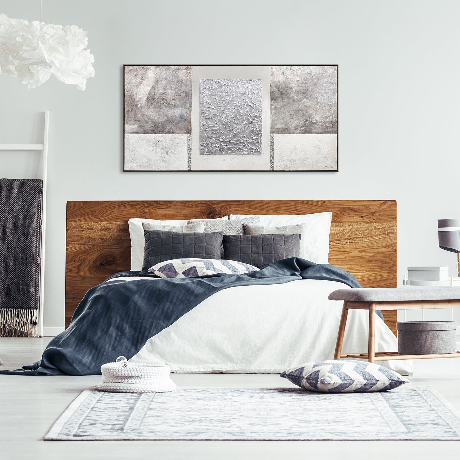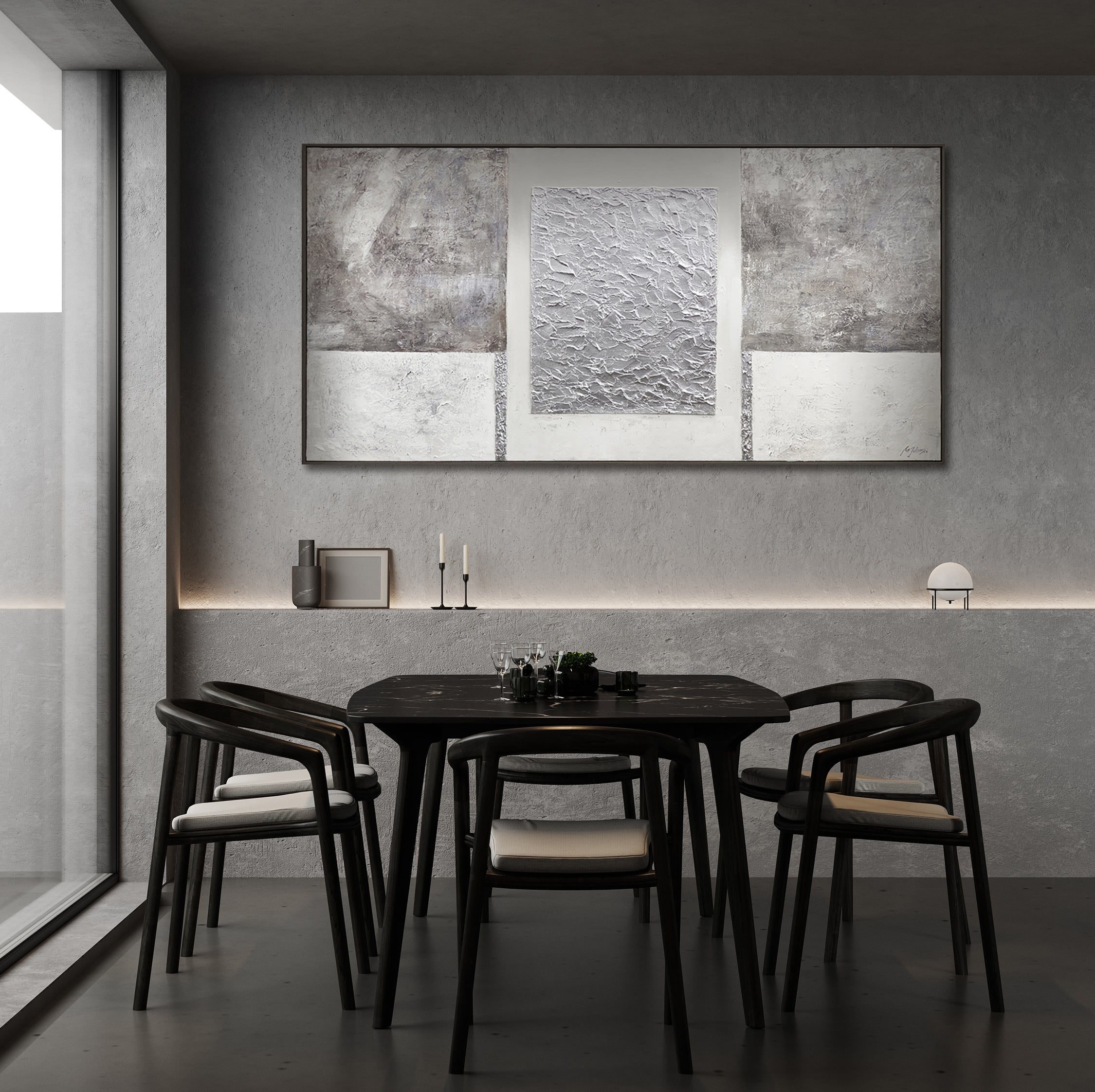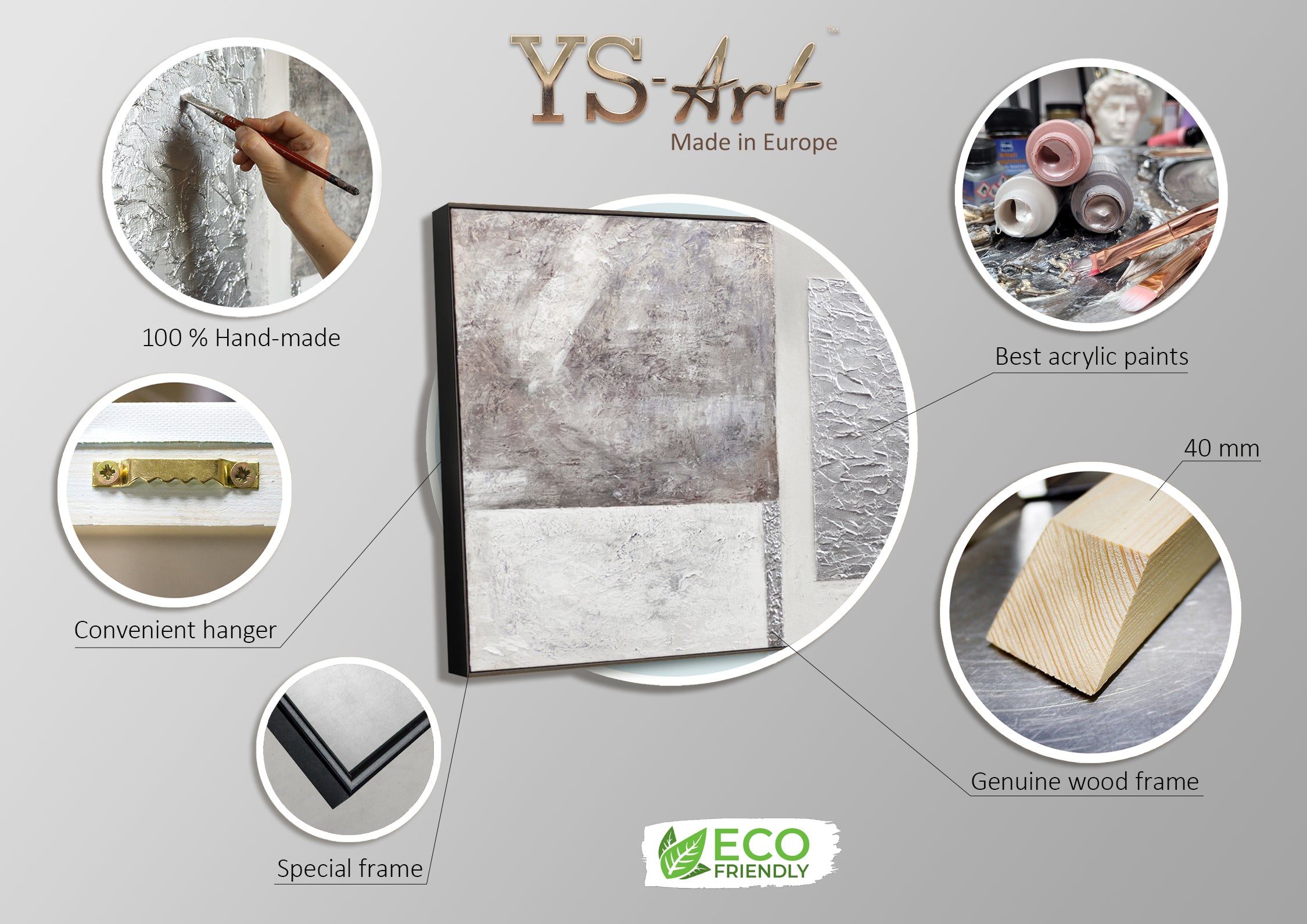Dette eksklusive kunstværk fra YS-Art DeLuxe kollektionen imponerer med en harmonisk kombination af grå, sølv og hvid samt en markant strukturteknik, der tilfører værket dybde og elegance. Den elegante ramme fremhæver designet og giver en luksuriøs præsentation.