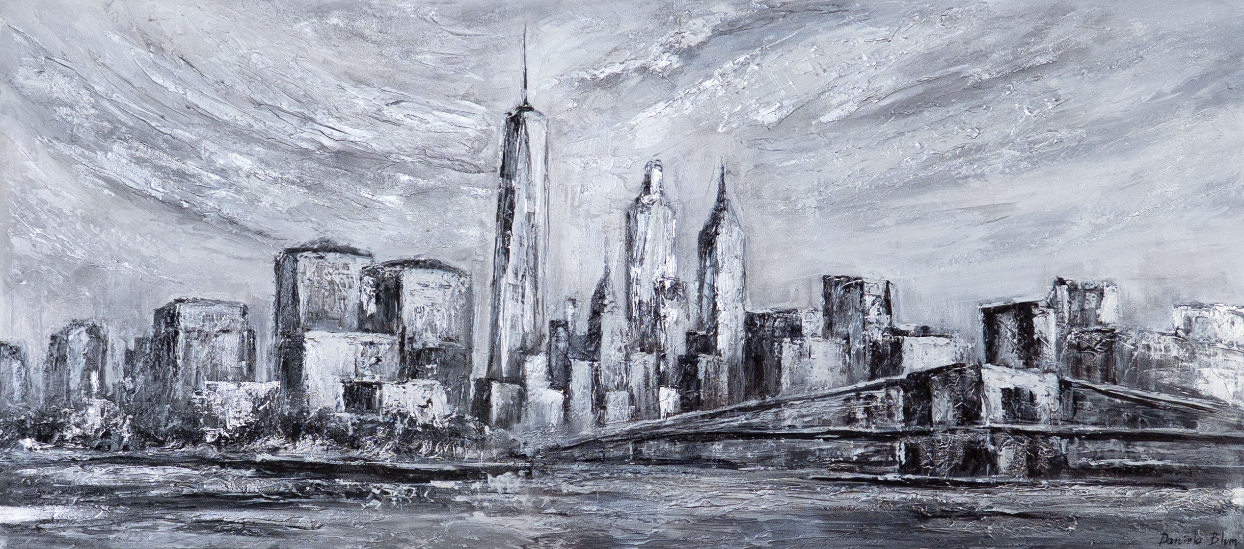 Håndmalet abstrakt bybillede på lærred "Arkitektur der tid" viser den kraftfulde ro i moderne arkitektur. Med nuancer i grå, sort, hvid og sølv og en plastisk, struktureret overflade opstår et fascinerende bybillede – en skyline med karakter og dybde.