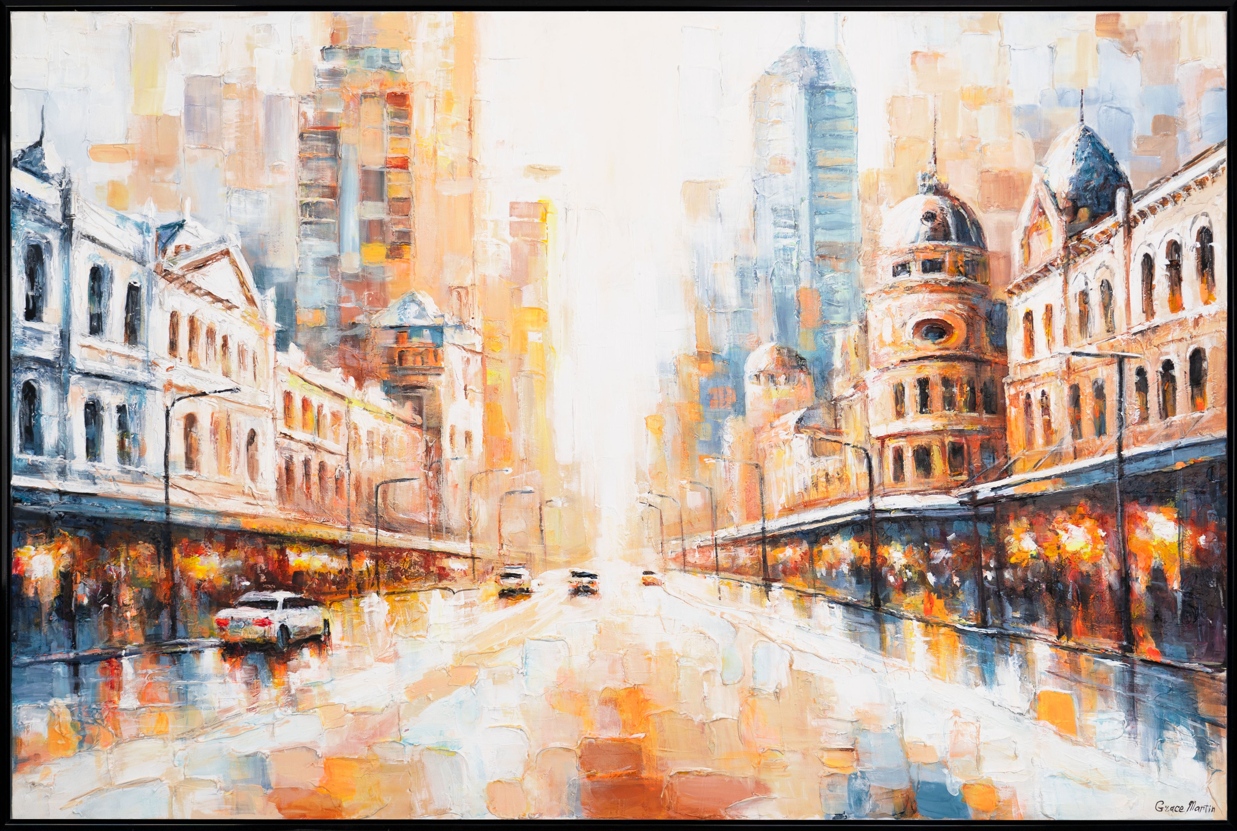 Dette håndmalede lærredsmaleri "Rum og Rytme" indfanger den levende atmosfære i en urban byscene. Med kraftige penselstrøg og en struktureret overflade skabes en dynamisk komposition af lys, farve og arkitektoniske former. De varme farvetoner og den abstrakte fremstilling giver værket et moderne og samtidig indbydende udtryk.