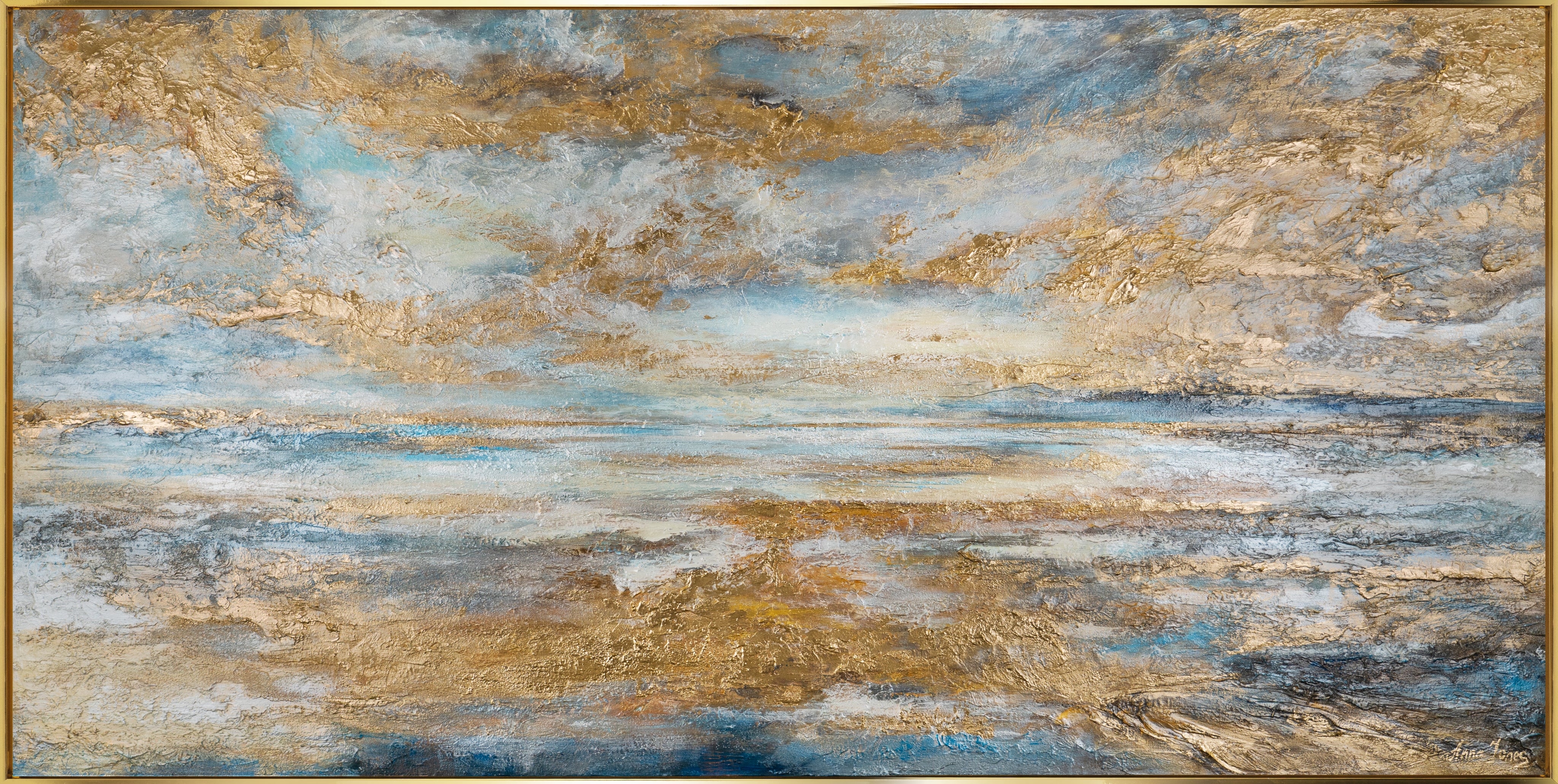 Dette abstrakte maleri indfanger den vidtstrakte og beroligende atmosfære ved havet med intense akrylfarver. De luksuriøse guldaccenter og den dynamiske farvepalet giver værket en unik dybde og struktur.