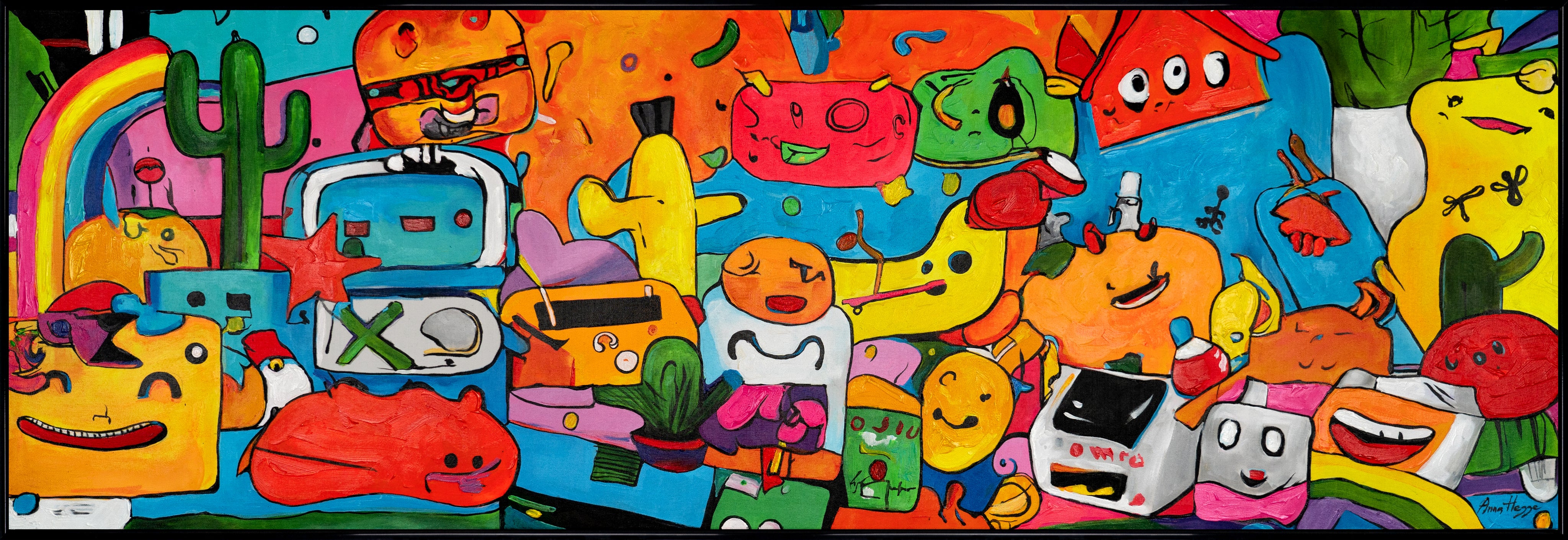 Berig dit hjem eller kontor med dette farverige, abstrakte kunstværk, der viser en livlig og legende verden fuld af farverige karakterer. Maleriet imponerer med stærke farvetoner og ekspressive penselstrøg. Det er 100% håndmalet og fremhæves af en elegant ramme.