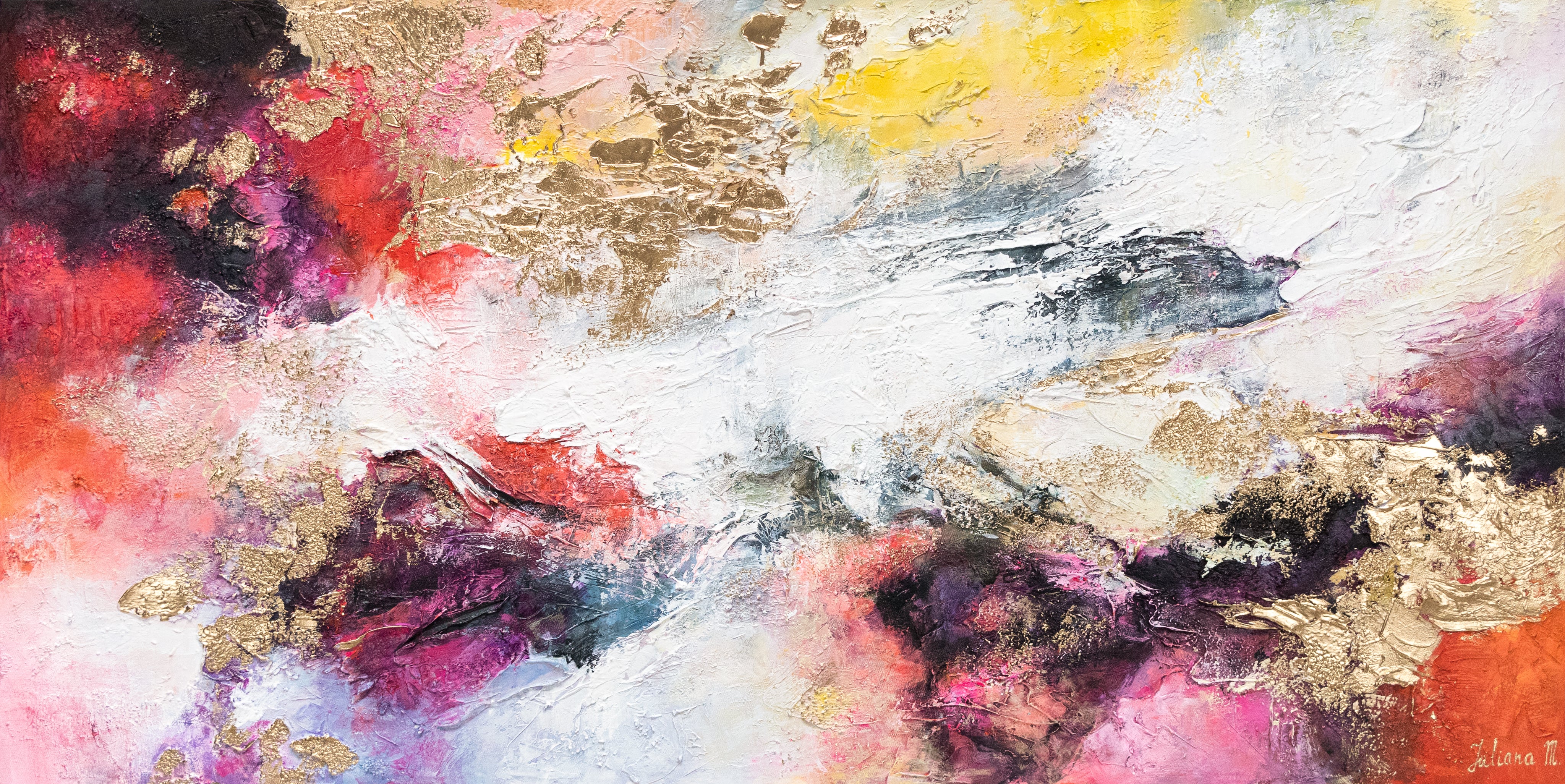 Dyk ned i farveeksplosionen i dette håndmalede akrylblid på lærred, der forener bløde overgange og rå strukturmaleri-effekter. De storladne og intense nuancer vækker din stue til live og tilfører et moderne præg af abstrakt kunst. Hver penselstrøg er et bevis på den rene håndlavede kvalitet og skaber et unikt, kunstnerisk udtryk.