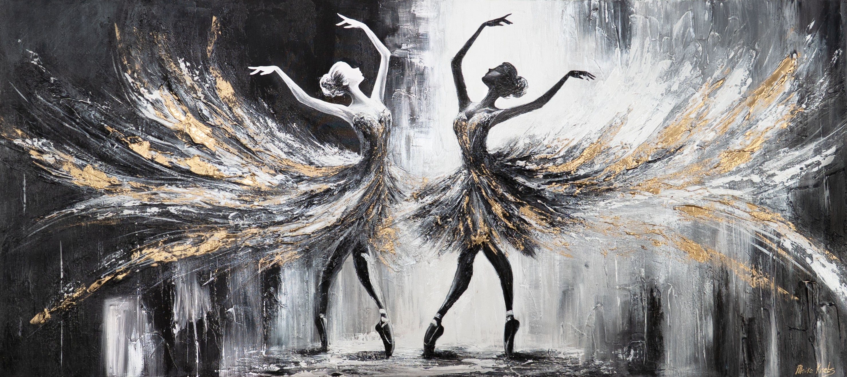 "Die Brillanz des Balletts" er et håndmalet akrylmaleri, der viser to dansende divas i dynamisk bevægelse. Svingende penselstrøg i sort, hvid, grå og guld skaber en abstrakt komposition, der forener ynde og energi.