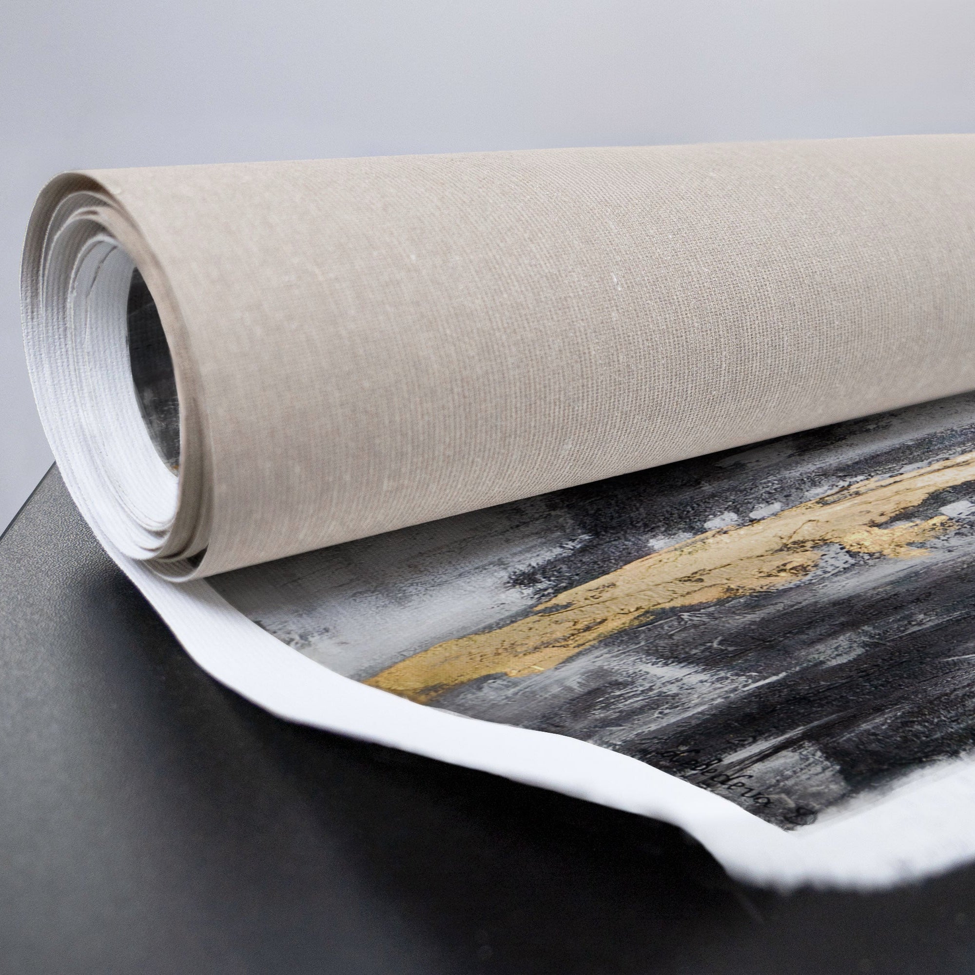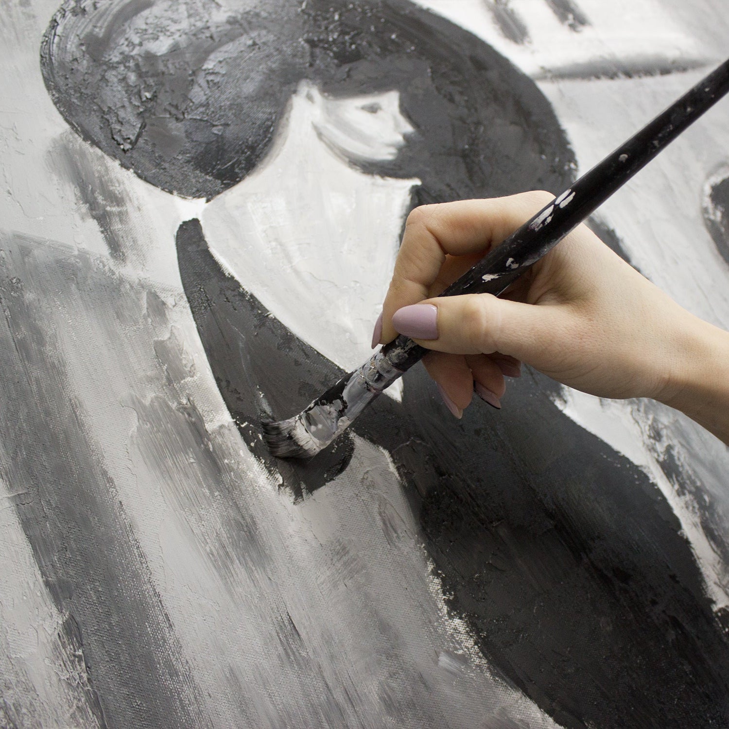 Et mystisk øjeblik midt i storbyen – lærredsbilledet „Filmstrimmel“ viser en stilfuld kvinde med stor hat, der går gennem et urbant landskab. I monokrom farveskala med guldaccenter fanger motivet en filmisk atmosfære. De håndmalede penselstrøg skaber en struktureret overflade, der giver bevægelse og dybde. Kontrasten mellem sort, hvid og bladguld giver scenen et cineastisk præg fyldt med elegance og selvsikkerhed.
