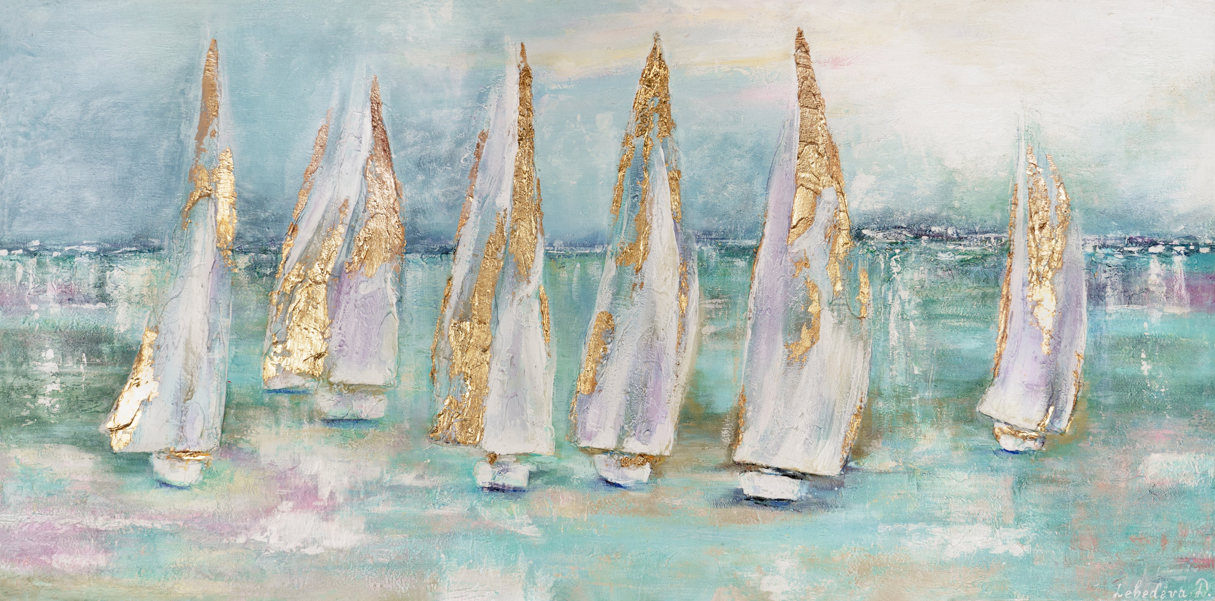 Det håndmalede acrylmaleri „Sejlbåde“ viser en fredelig maritim scene med sejlskibe på stille vand. Kombinationen af sarte pastelfarver og gyldne accenter skaber en harmonisk og beroligende atmosfære. Den levende, strukturerede overflade giver værket dybde og liv, hvilket gør det til et stilfuldt blikfang i ethvert rum.