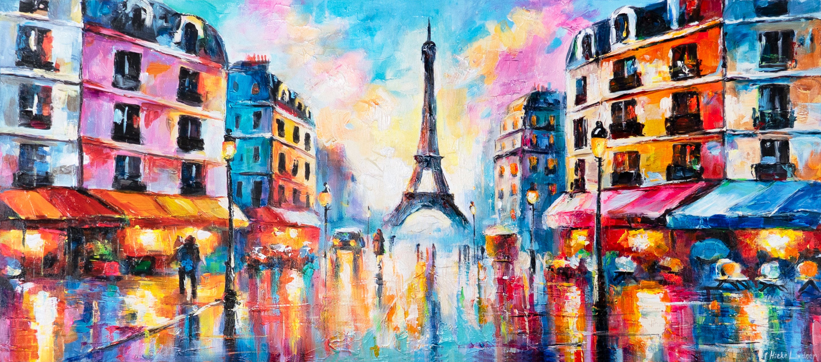 Maleri „Pariser lys“ viser et impressionistisk bybillede med Eiffeltårnet i baggrunden. Kraftige farver, lysreflekser og levende penselstrøg giver scenen en særlig atmosfære mellem romantik og storbyliv.