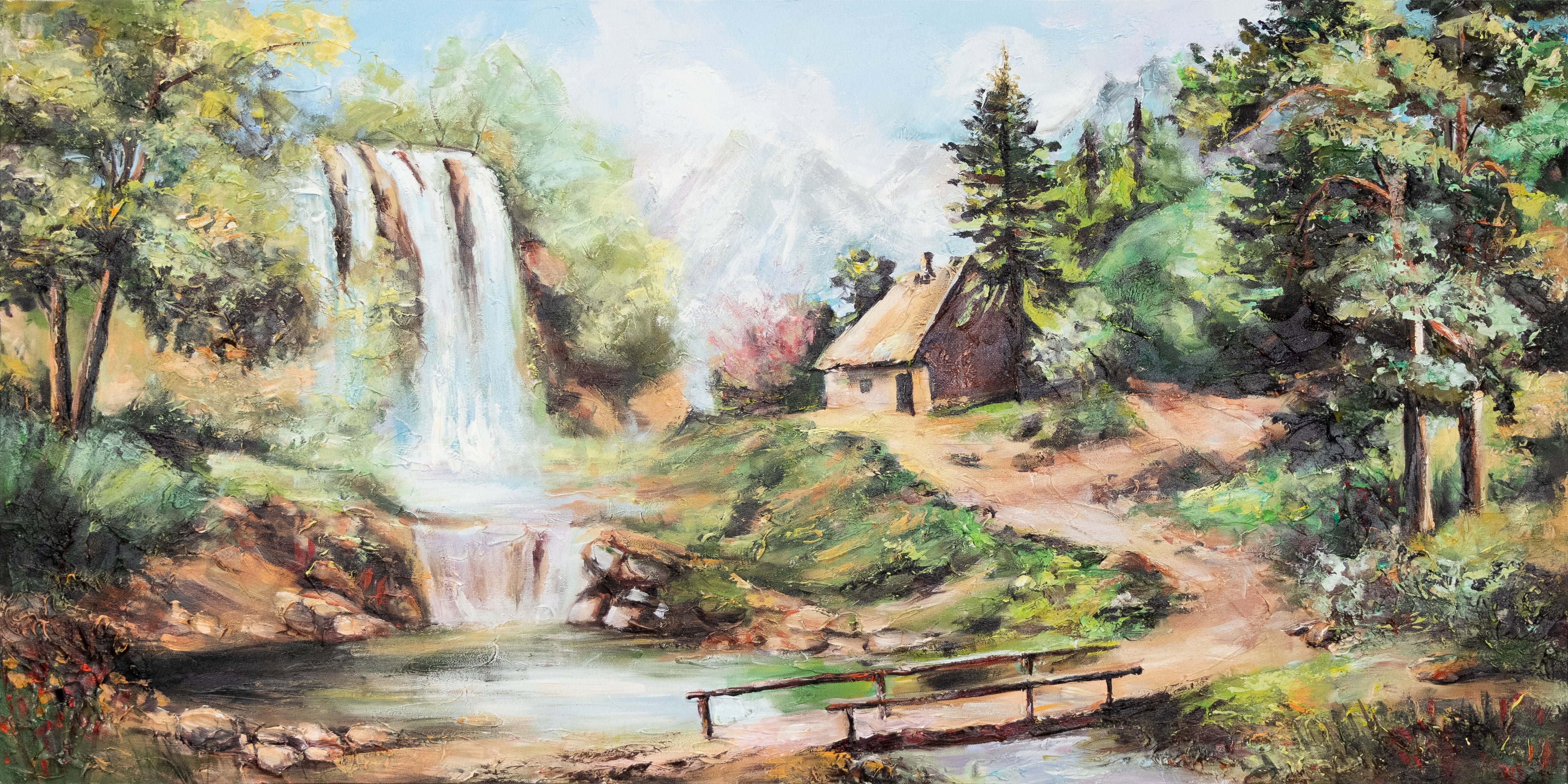 Dyk ned i den idylliske verden med dette håndmalede landskabsmaleri. De levende farver og de præcise penselstrøg skaber en realistisk scene med et malerisk vandfald og et hyggeligt landsted. Dette kunstværk er fuldstændig håndlavet og et unikt originalt værk. Vi tilbyder gratis levering direkte til din dør.