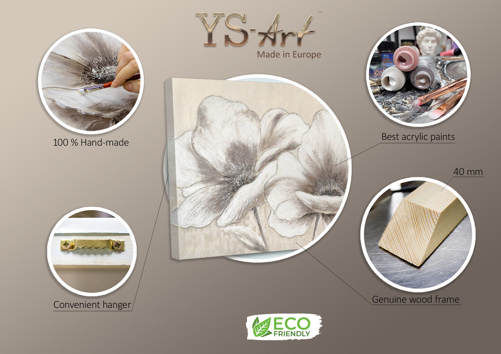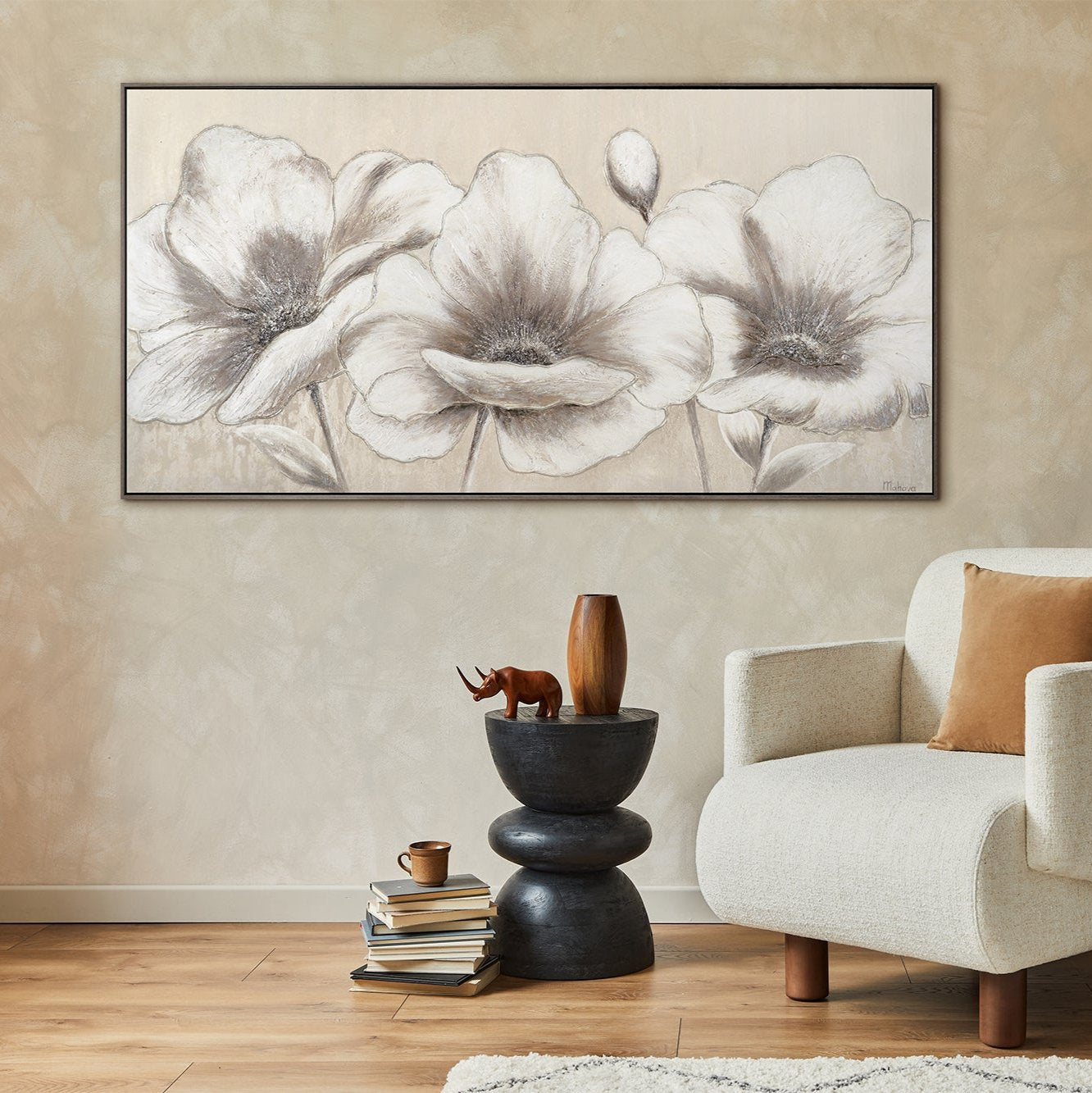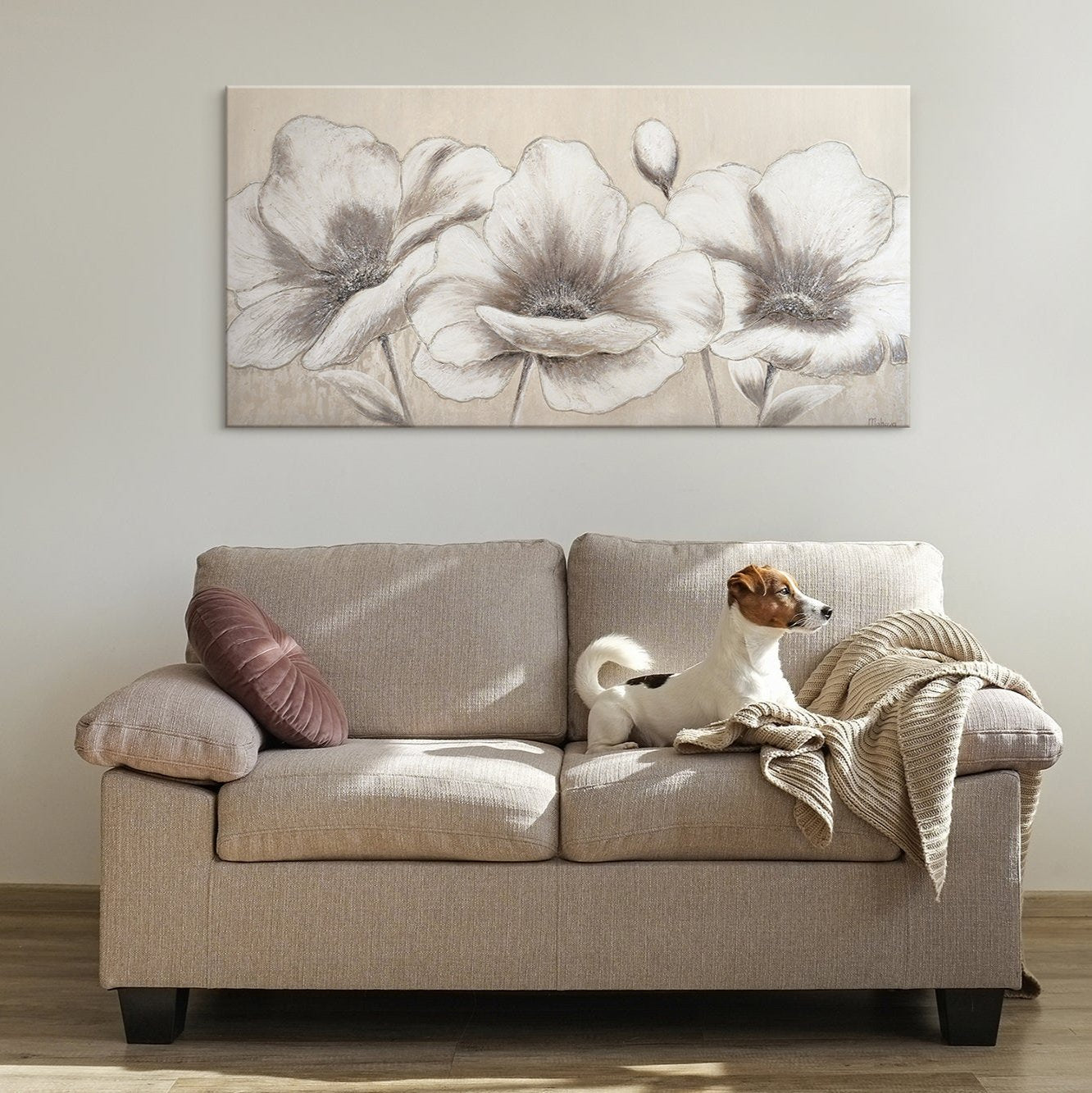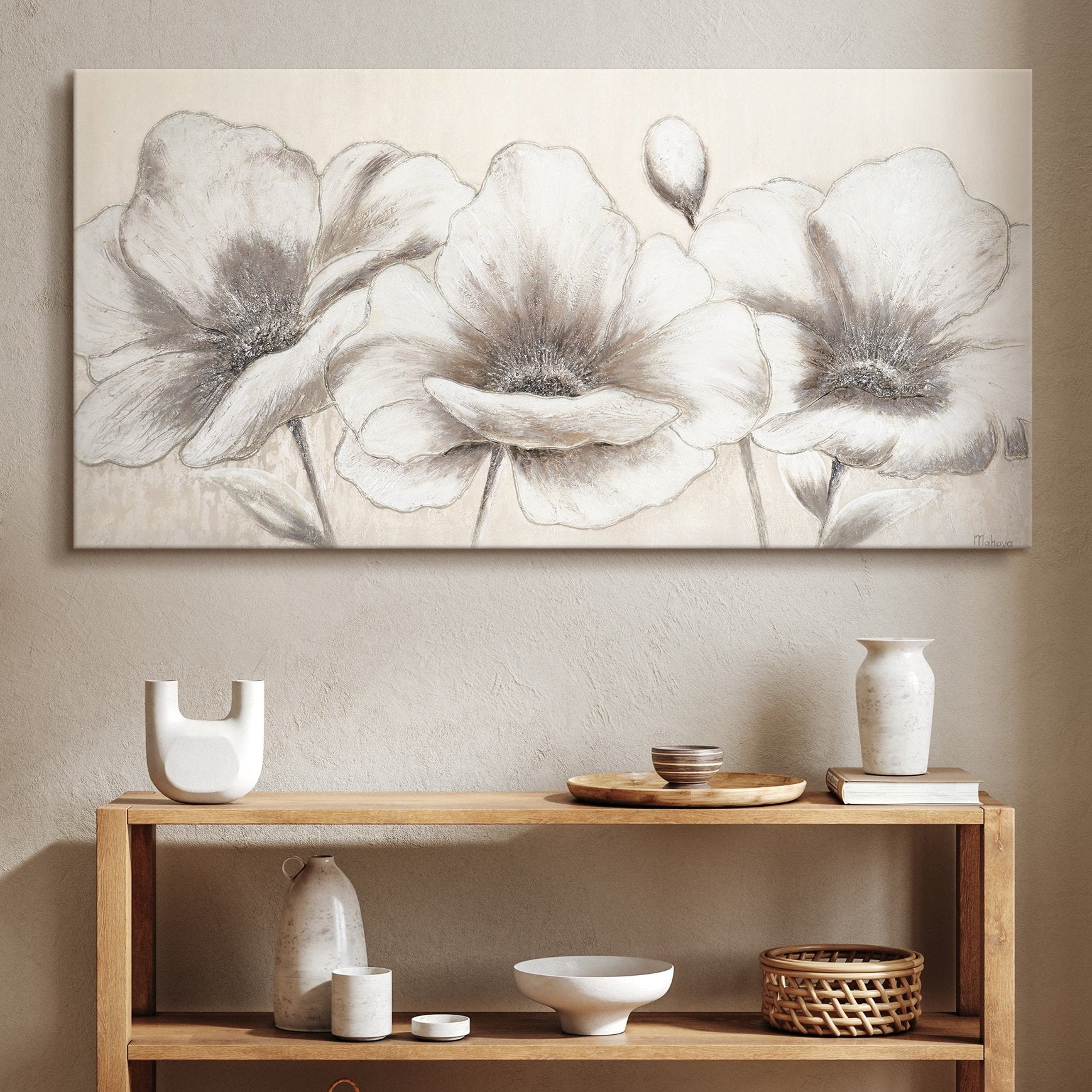 Dette moderne akrylmaleri imponerer med sine elegante blomstermotiver, malet i bløde og harmoniske farver på lærred. De detaljerede blomsterudtryk formidler en tidløs skønhed, der passer perfekt ind i enhver boligindretning. Den afdæmpede farvepalet gør det nemt at integrere værket i indretningen og skaber en rolig atmosfære.
