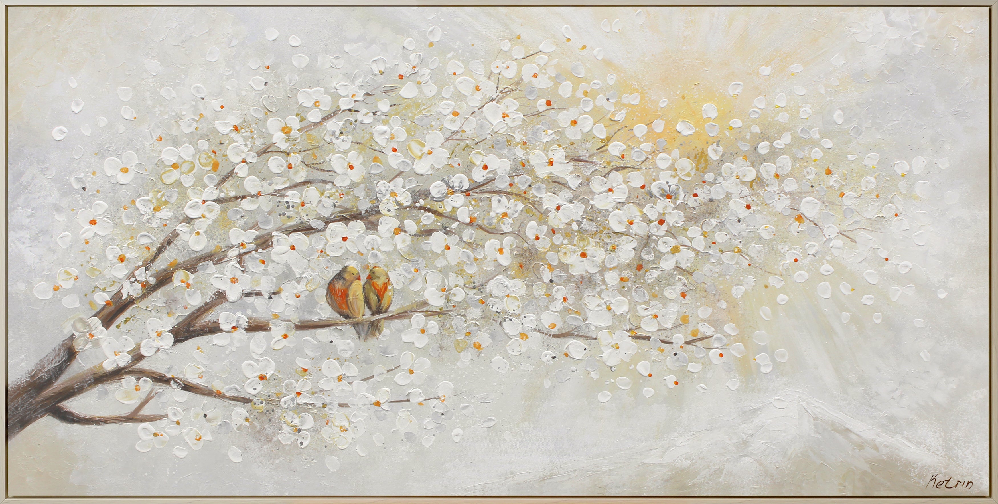 Dette håndmalede akrylmaleri viser et fortryllende motiv med blomster og fugle på en blomstrende gren. De sarte farver og den detaljerede gengivelse gør det til et elegant kunstværk, der bringer ro og harmoni ind i dit hjem. Perfekt egnet som moderne vægkunst i stue, kontor eller soveværelse.