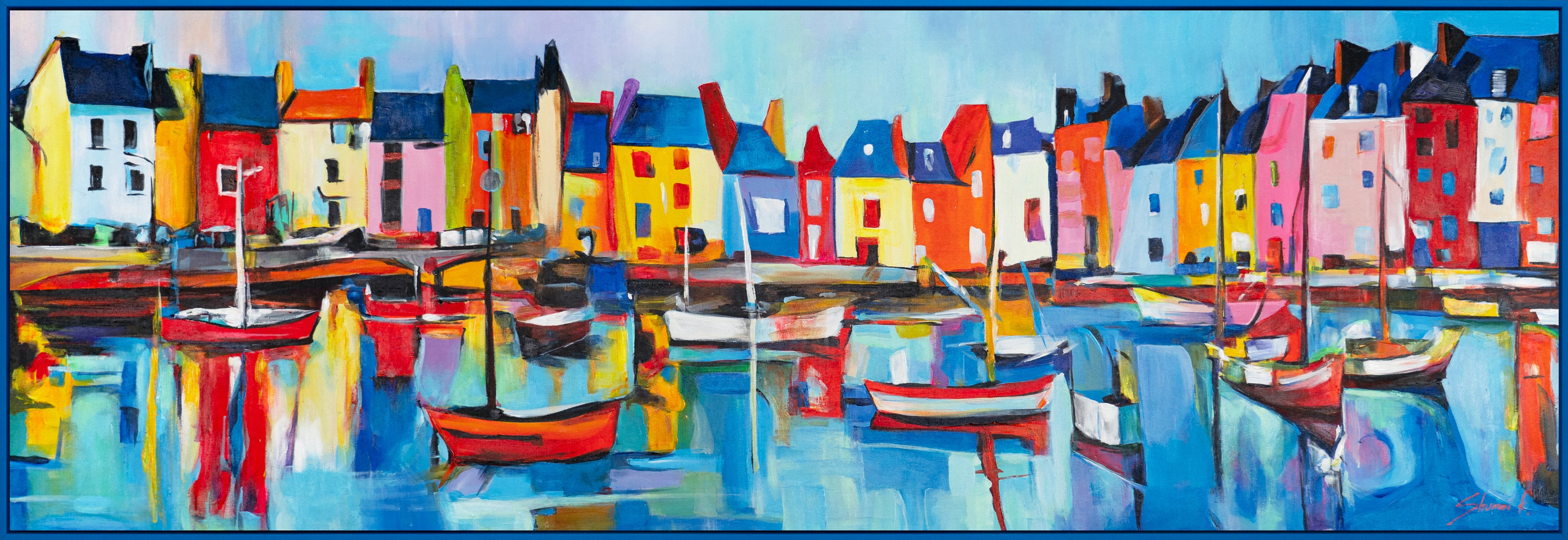 Berig dit hjem eller kontor med dette farverige, abstrakte maleri, der gengiver en livlig havnescene med stærke kontraster og ekspressive penselstrøg. Kunstværket er 100% håndmalet og indrammet i en stilfuld blå ramme, som understreger det moderne udtryk. Et oplagt valg for dig, der elsker moderne kunst og nuancer.