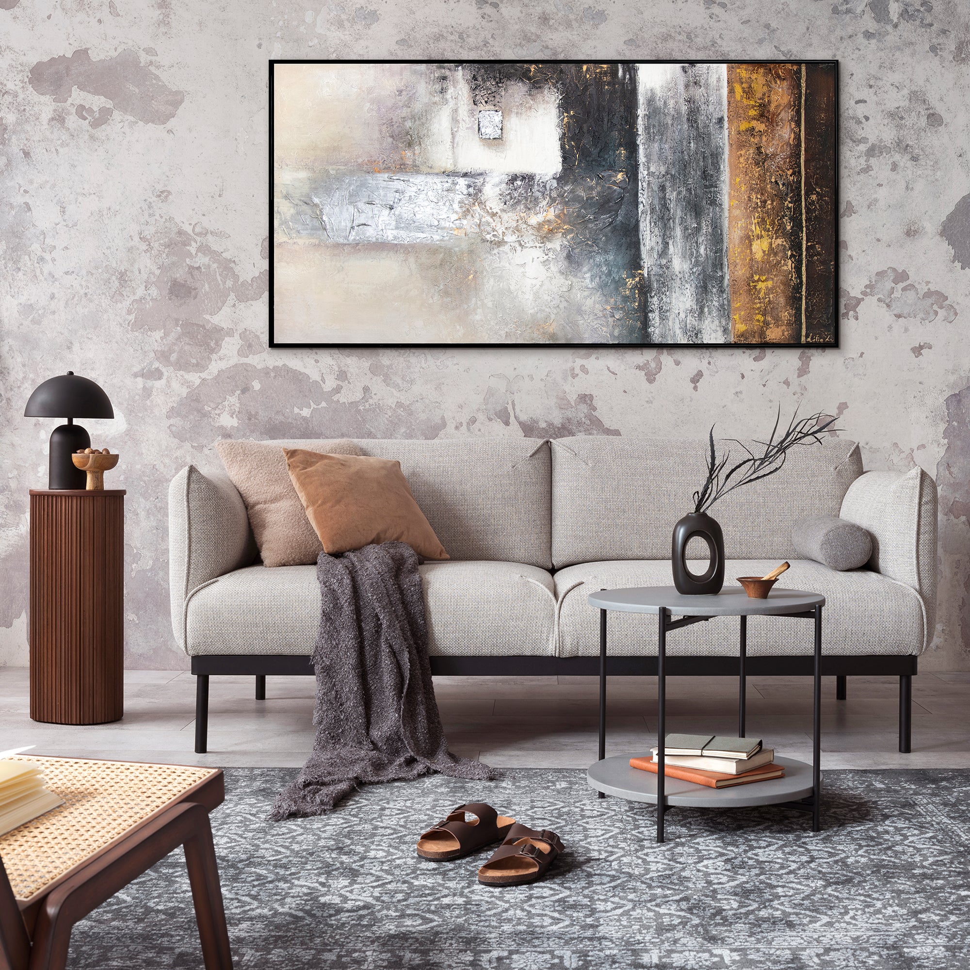 Dette imponerende abstrakte maleri vil berige dit hjem med sine intense kontraster og teksturrige overflader. Det håndmalede kunstværk kombinerer grå, hvide og brune toner i et dragende design, som skaber både dybde og varme. Hver detalje er udført i hånden med stor omhu, hvilket gør hvert billede til et ægte unika. En perfekt løsning til dig, der ønsker moderne vægdekoration med personlighed og stil.