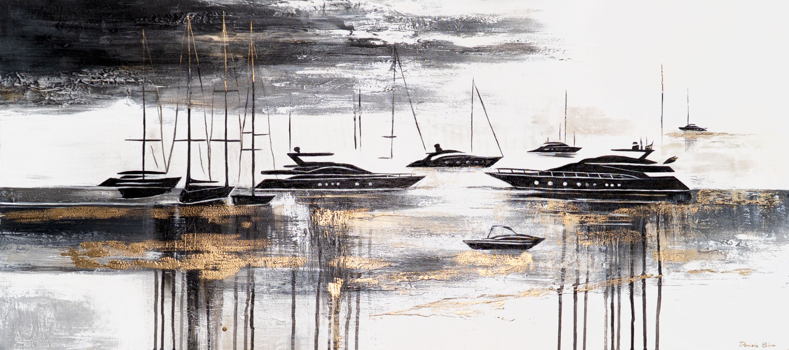 Kunstværket „Yachter“ er et stilfuldt, håndmalet akrylmaleri på lærred, som viser en rolig maritim scene med elegante yachter i sort, hvid og guld. Den strukturerede maleteknik giver dybde og glans, mens den monokrome kontrast med gyldne accenter skaber en moderne, luksuriøs atmosfære.