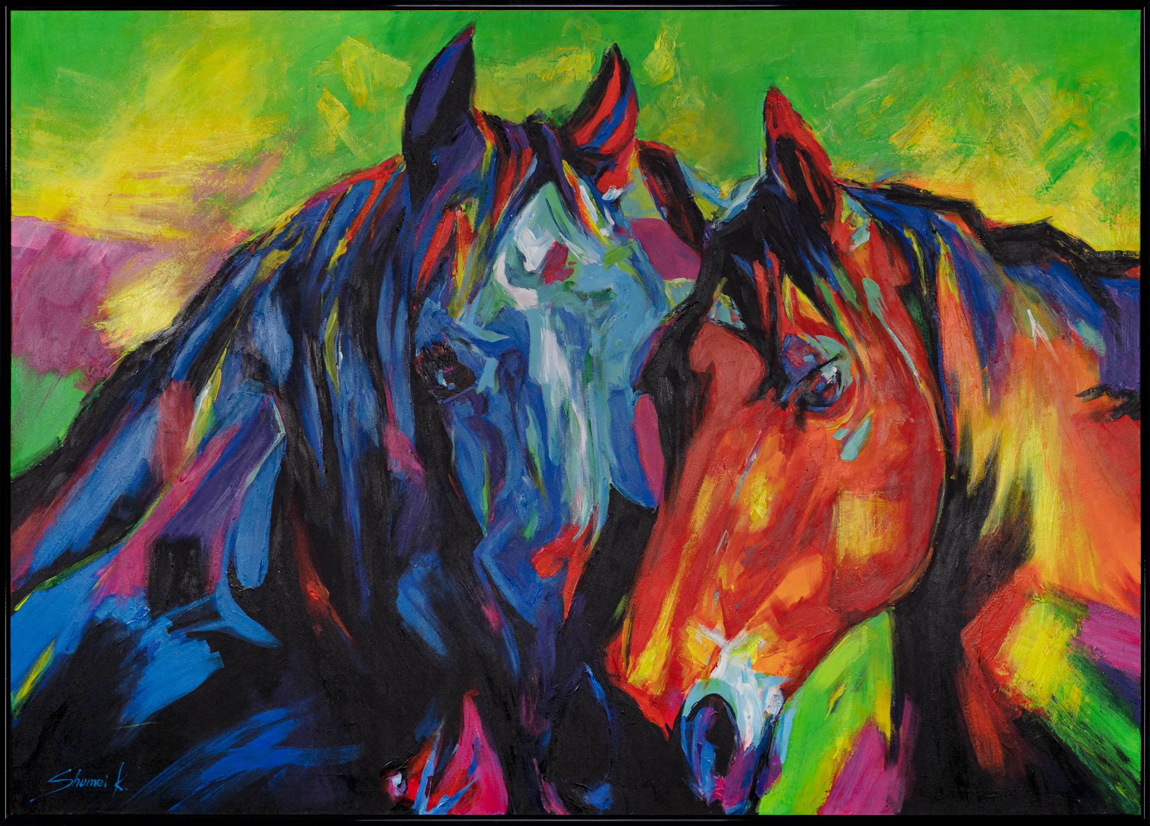 Et energifyldt kunstværk med to ekspressivt malede heste i strålende farver – "Mangfoldige manker" udstråler dynamik og livlighed. De kontrastfyldte toner af rød, blå, grøn og violet indfanger bevægelsen og dyrenes frie ånd, mens den markante struktur i maleriet giver en håndgribelig dybde. Hvert eneste detalje på lærredet taler om følelser, intensitet og kunstnerisk frihed.