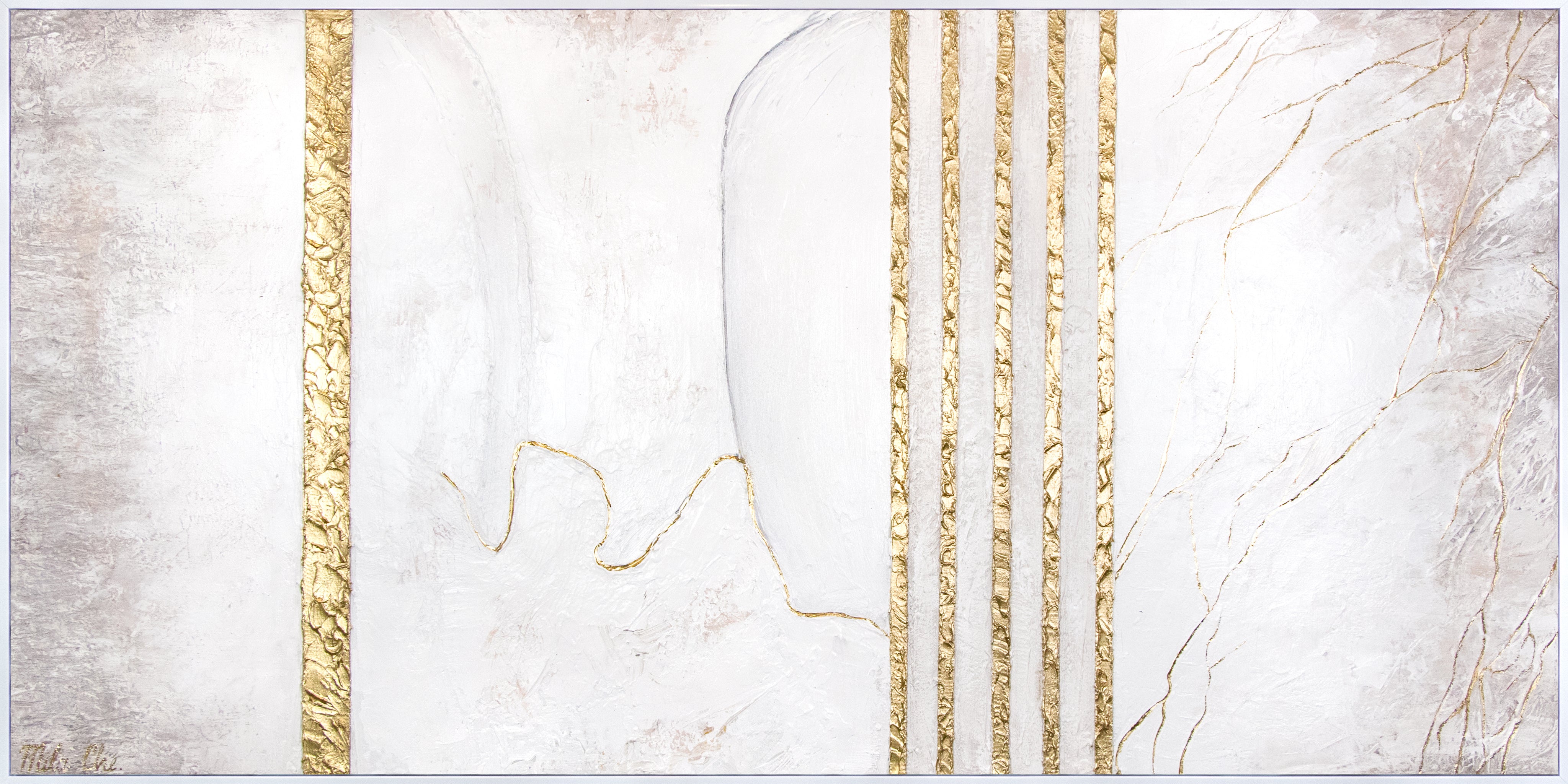 Dette elegante abstrakte malerier i lyse farver kombinerer hvid og guld i et moderne design, der udstråler luksus og raffinement. De klare linjer og diskrete farveaccenter giver værket en stilfuld udstråling, perfekt til rummelige boliger, hvor det kan fungere som et centralt kunstværk.