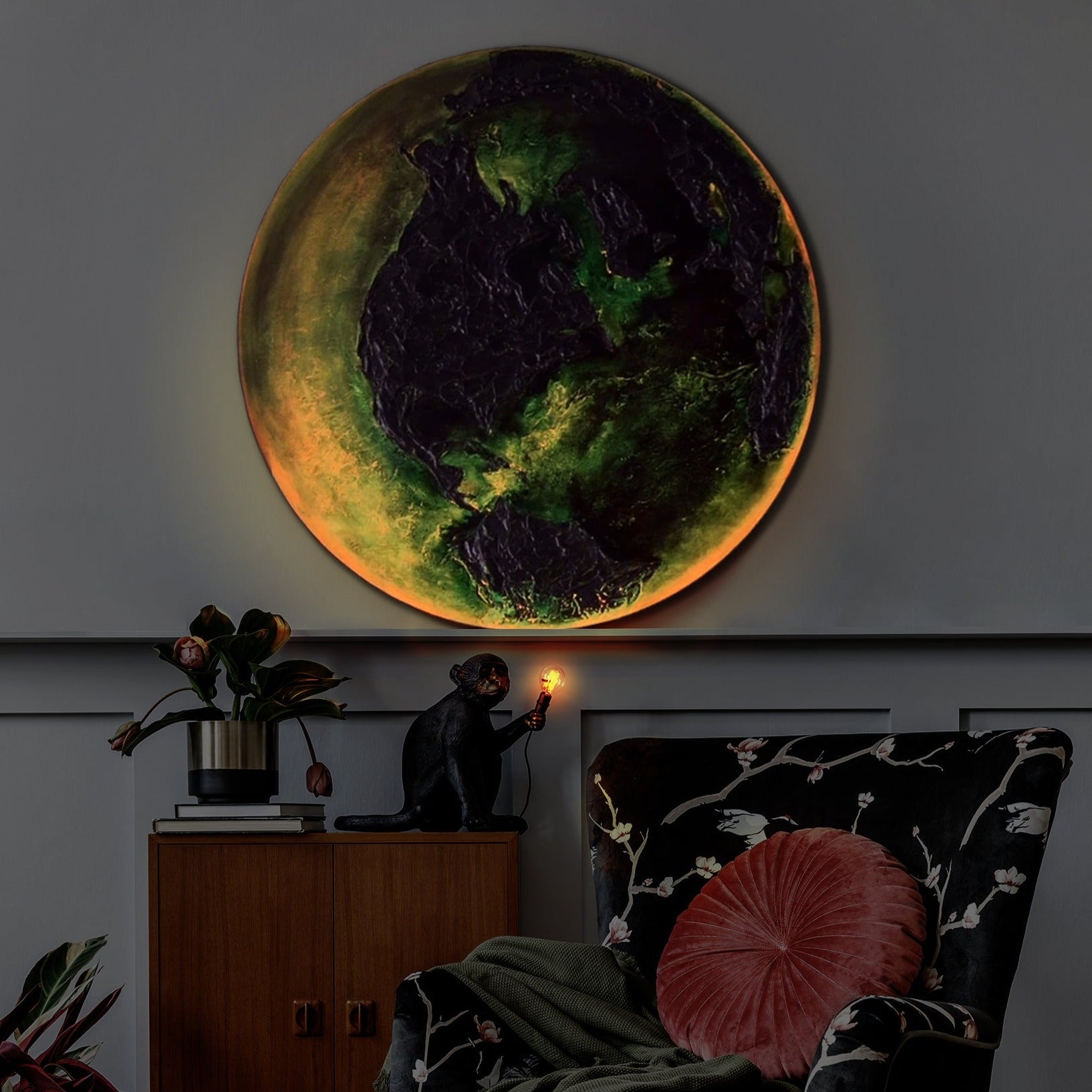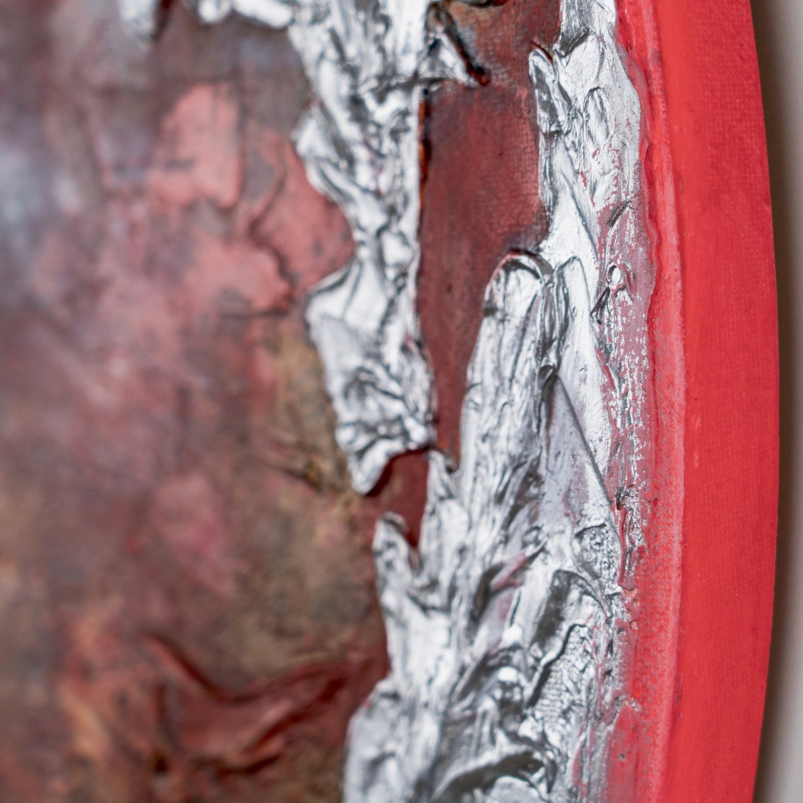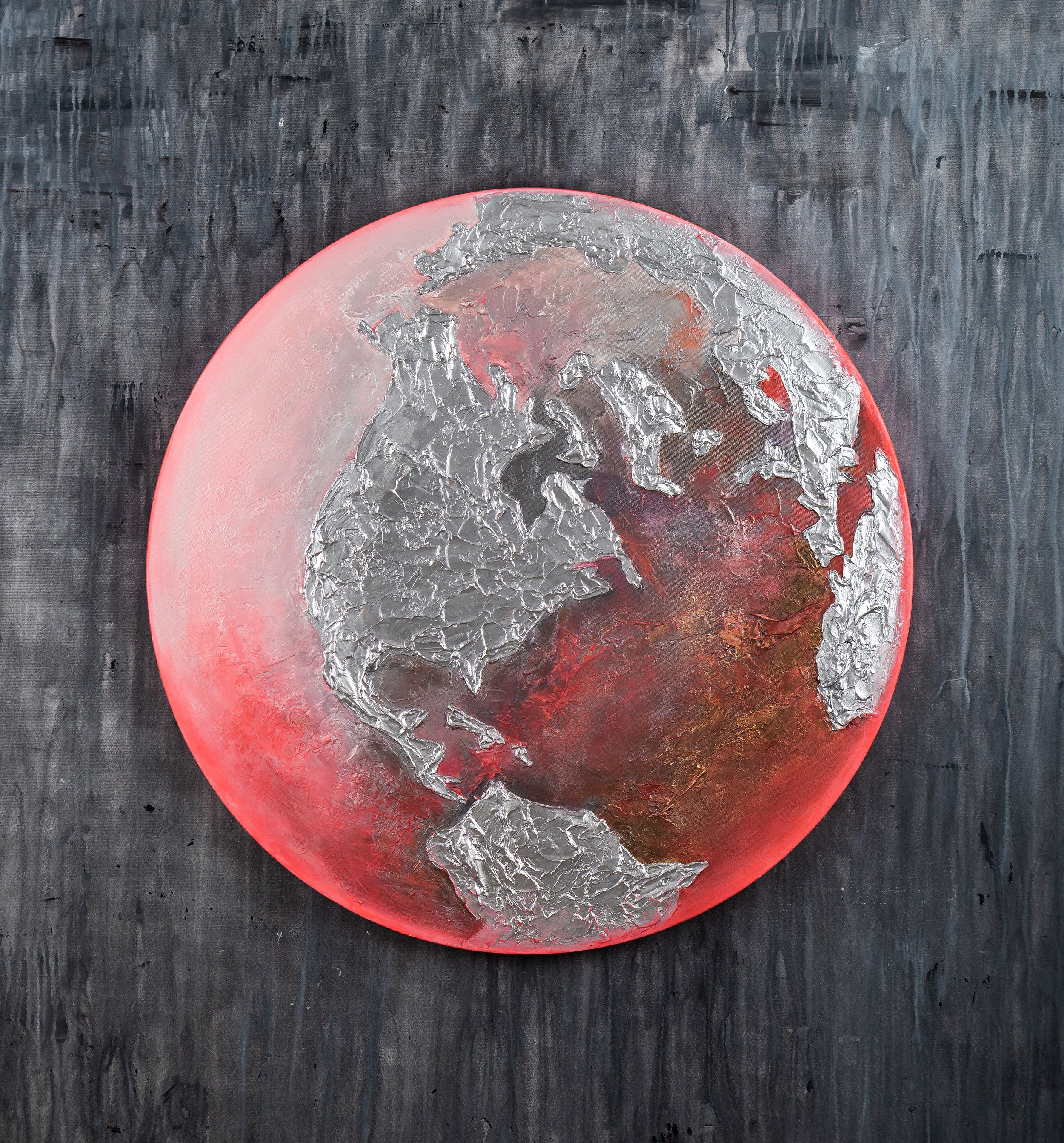 Berig dit hjem eller kontor med den elegante "Jorden" – et rundt akrylmaleri i planetform, som lyser op i mørket takket være en særlig selvlysende effekt. Denne moderne kunst imponerer med røde nuancer og sølvfarvede kontinenter, som skaber en varm og dynamisk atmosfære. Værket er 100% håndlavet og fremhæves af en stilfuld ramme.