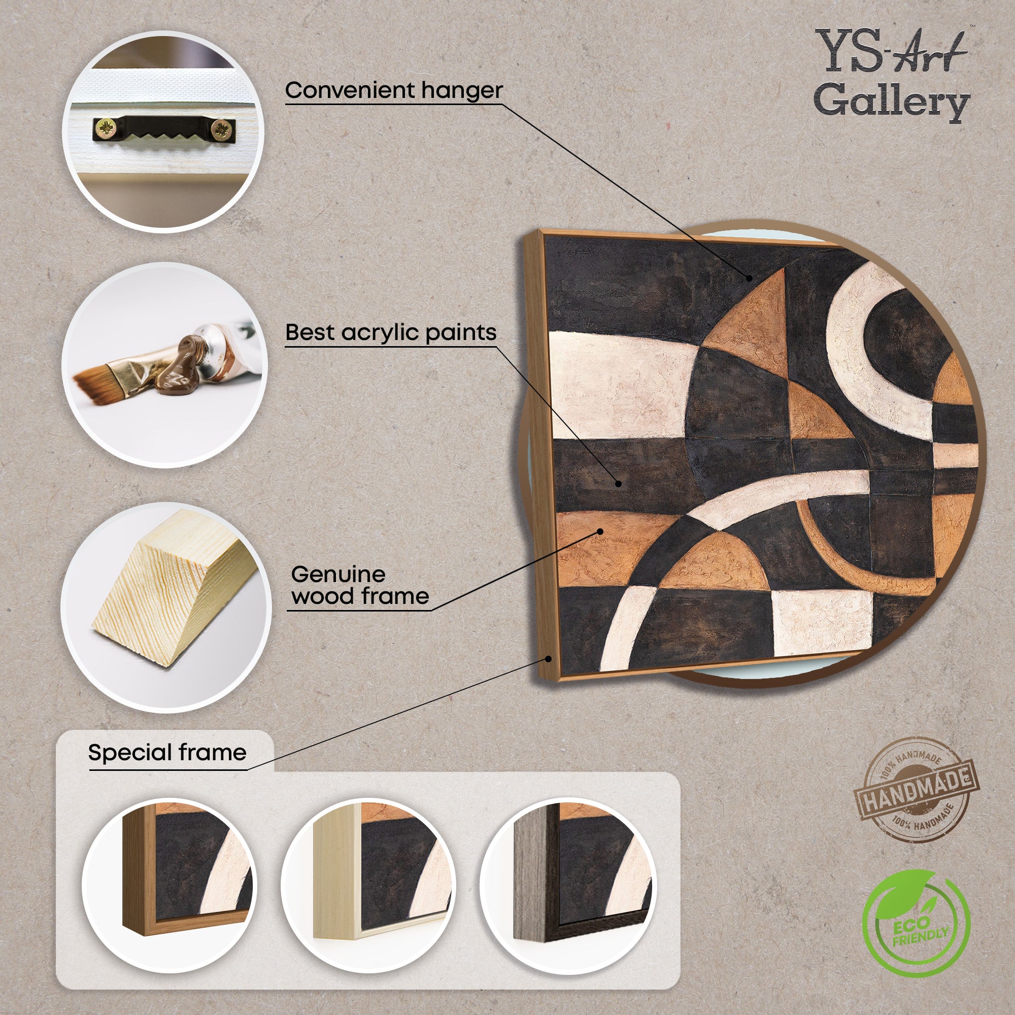 "Harmony of Curves" er et udtryksfuldt abstrakt maleri, der leger med rytmiske linjer og geometriske former. Kombinationen af dyb sort, varm brun og blød beige skaber en kraftfuld, men afbalanceret komposition. Den synlige overfladetekstur giver akrylmaleriet dybde og en tydelig håndmalet karakter.