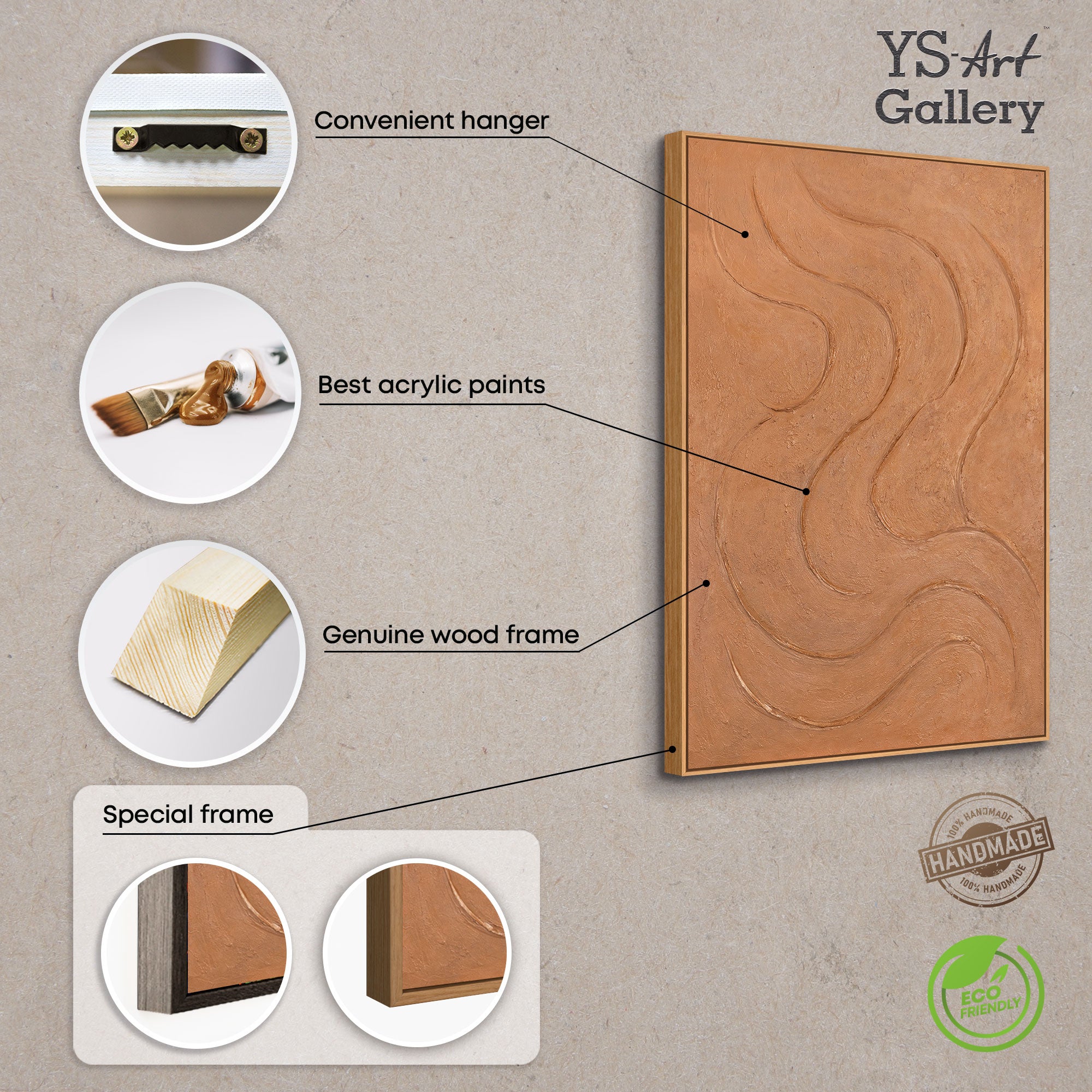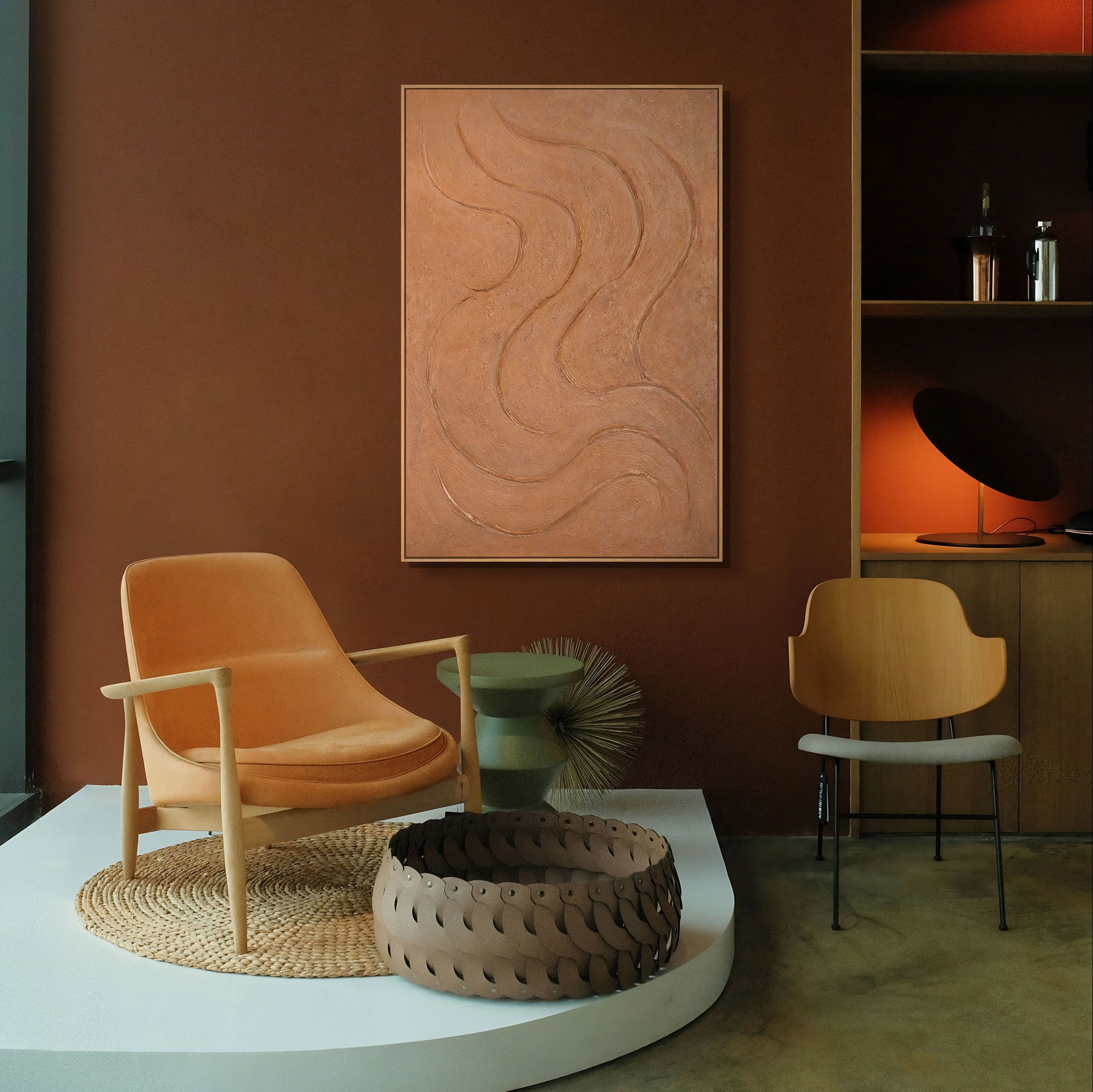"Varme rytmer" forener organiske former, varme naturtoner og håndmalet strukturkunst i et eksklusivt unika. Det bringer ro og elegance ind i moderne hjem – inklusiv gratis levering.