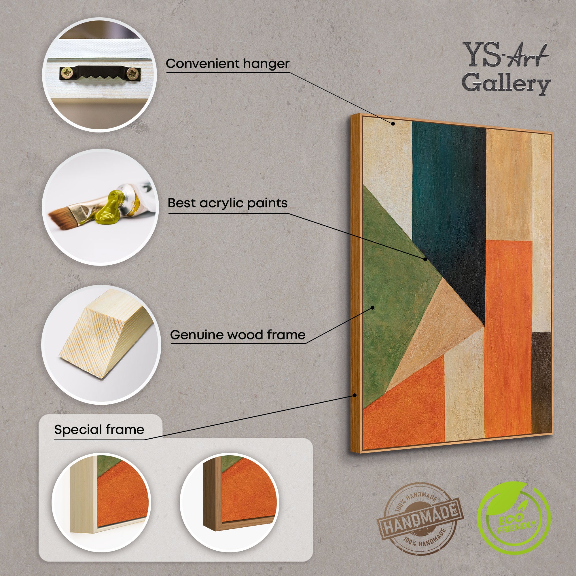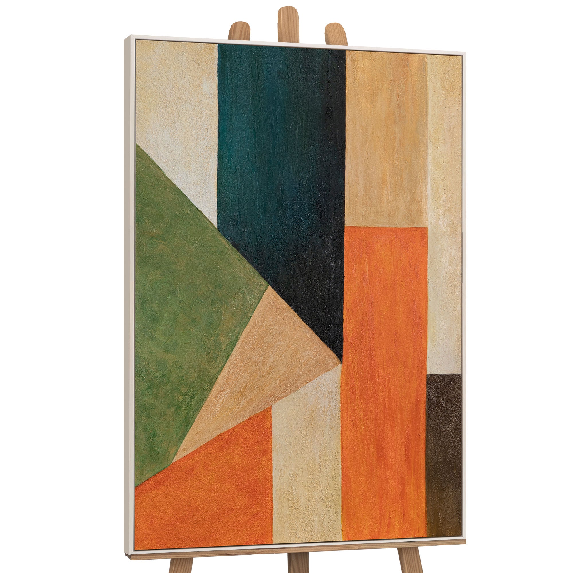 "Orden og bevægelse" forener klare linjer med livlige farveaccenter. Geometriske flader i orange, grøn, beige og sort danner et spændingsfyldt samspil mellem stabilitet og dynamik. Den strukturerede acryloverflade giver værket dybde og en taktil, kunstnerisk energi, der tilfører rummet karakter.