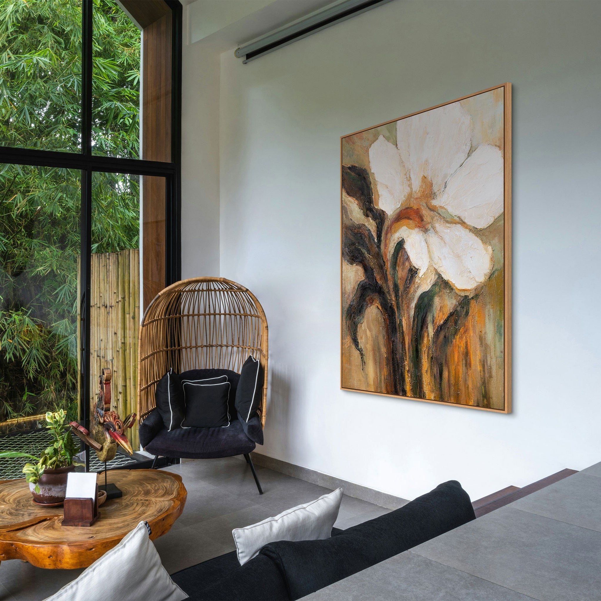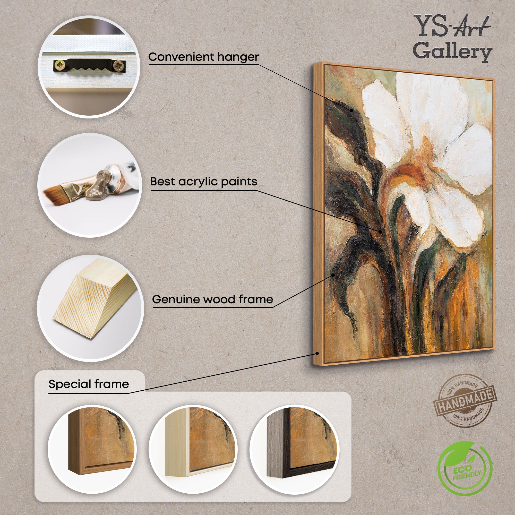 Dette florale kunstværk er det perfekte valg for dem, der elsker moderne og tidløs vægdekoration. Det passer ideelt i stue, soveværelse eller spisestue og tilfører hjemmet en varm og elegant atmosfære. Hvert billede er 100% håndmalet, skabt på lærred af høj kvalitet og spændt på en solid træramme – klar til ophængning.