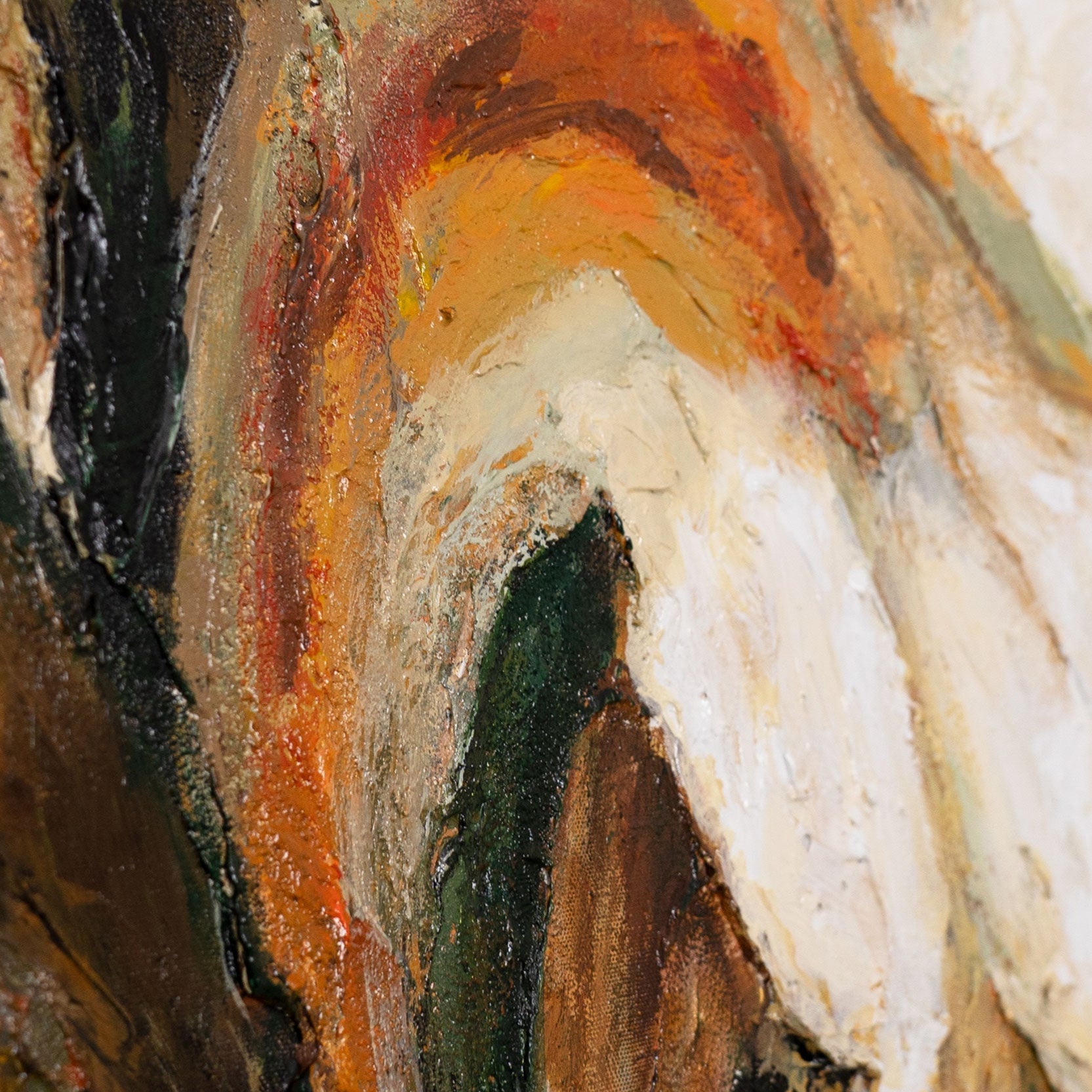 Akrylmaleriet "Tidens forløb" viser en imponerende hvid blomst, hvor tekstur og farver skaber en harmonisk forbindelse mellem natur og kunstnerisk udtryk. Varme brune og grønne nuancer, gennemtrukket af bløde orange og gyldne detaljer, giver blomsten dybde og liv. Den strukturerede overflade fremhæver den plastiske virkning og gør hvert penselstrøg levende.