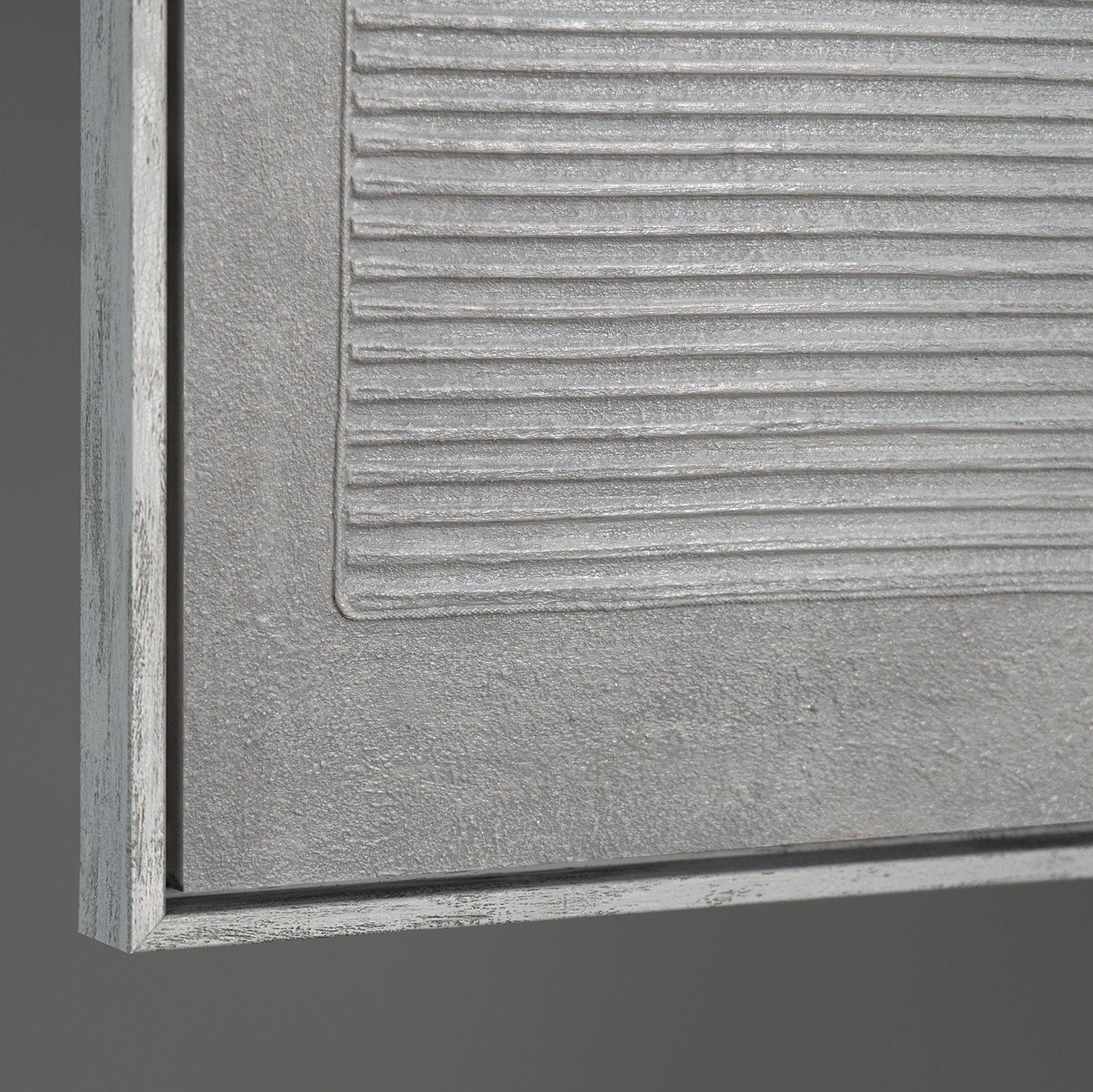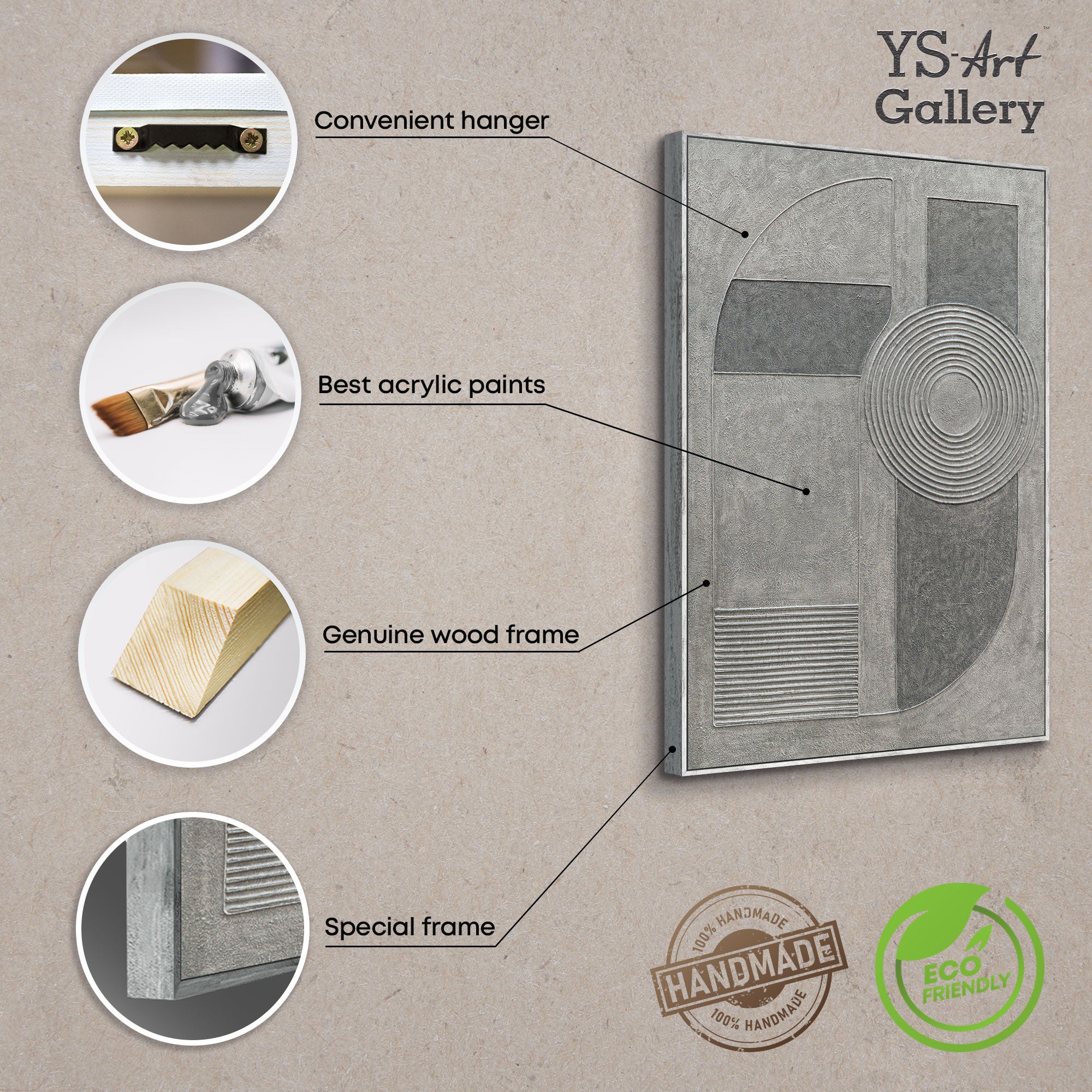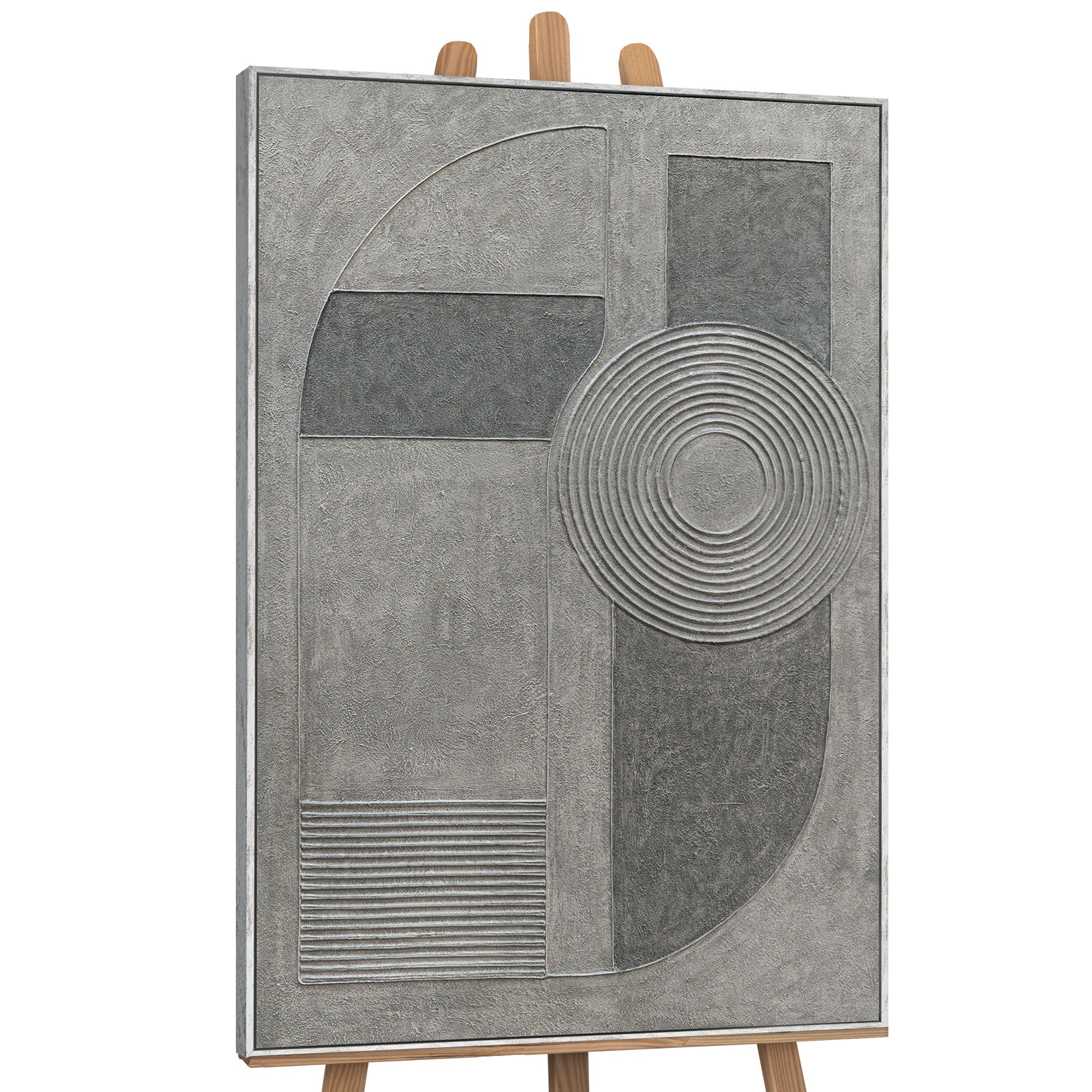 "Gråt akkord" forener arkitektonisk klarhed og kunstnerisk dybde. Geometriske former, koncentriske cirkler og strukturerede flader i varierede gråtoner skaber harmonisk balance mellem præcision og følelse. Den fint bearbejdede overflade minder om beton og giver værket en skulpturel karakter.