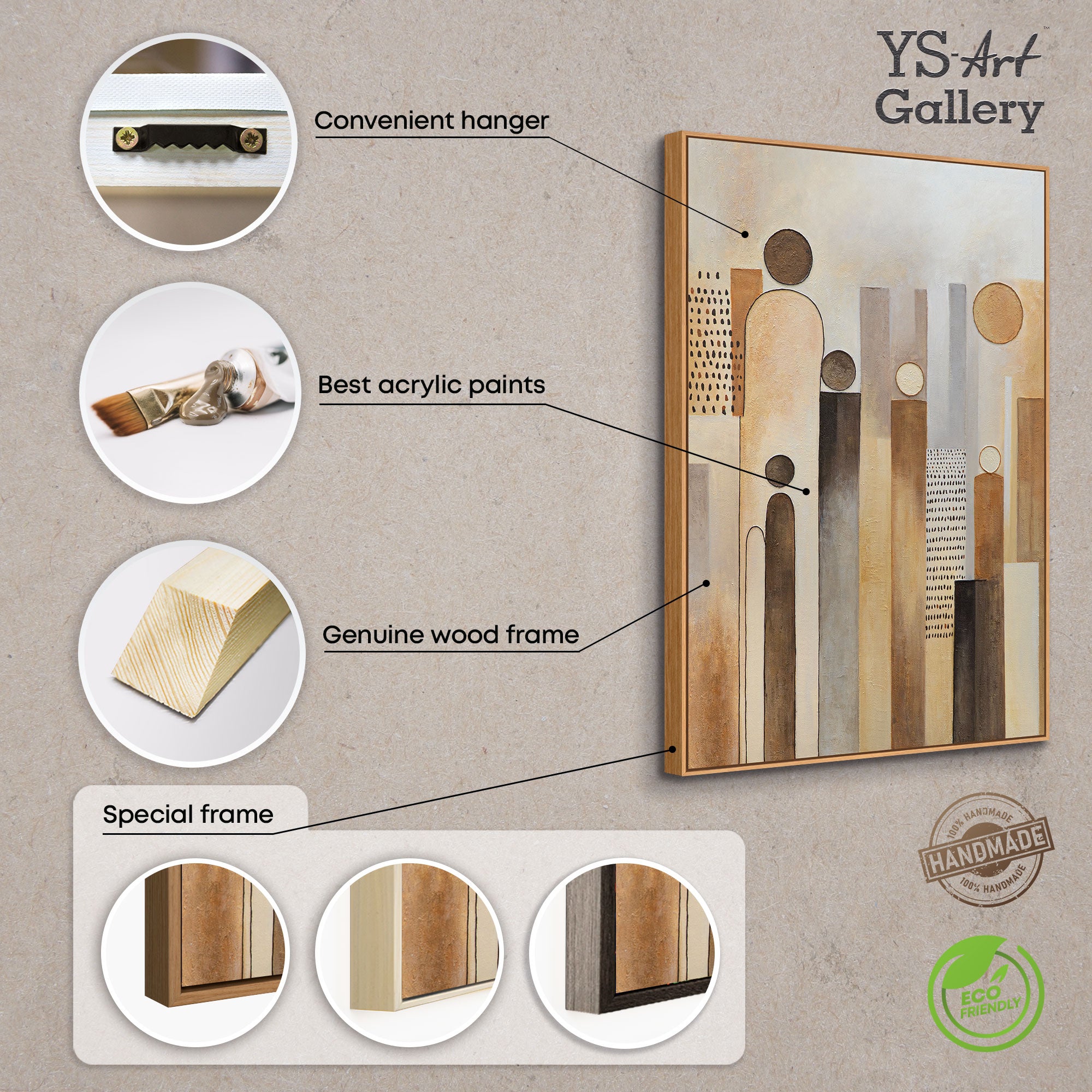 „Byen af Figurer“ er en hyldest til det urbane liv – reduceret til form, rytme og relationer. Vertikale linjer vokser som bygninger mod himlen, mens cirkler symboliserer den menneskelige tilstedeværelse. Kompositionen af varme beige-, brun- og okkertoner skaber både bevægelse og ro. I sin klare struktur minder den om hjerteslaget i en by, der pulserer mellem nærhed og afstand.