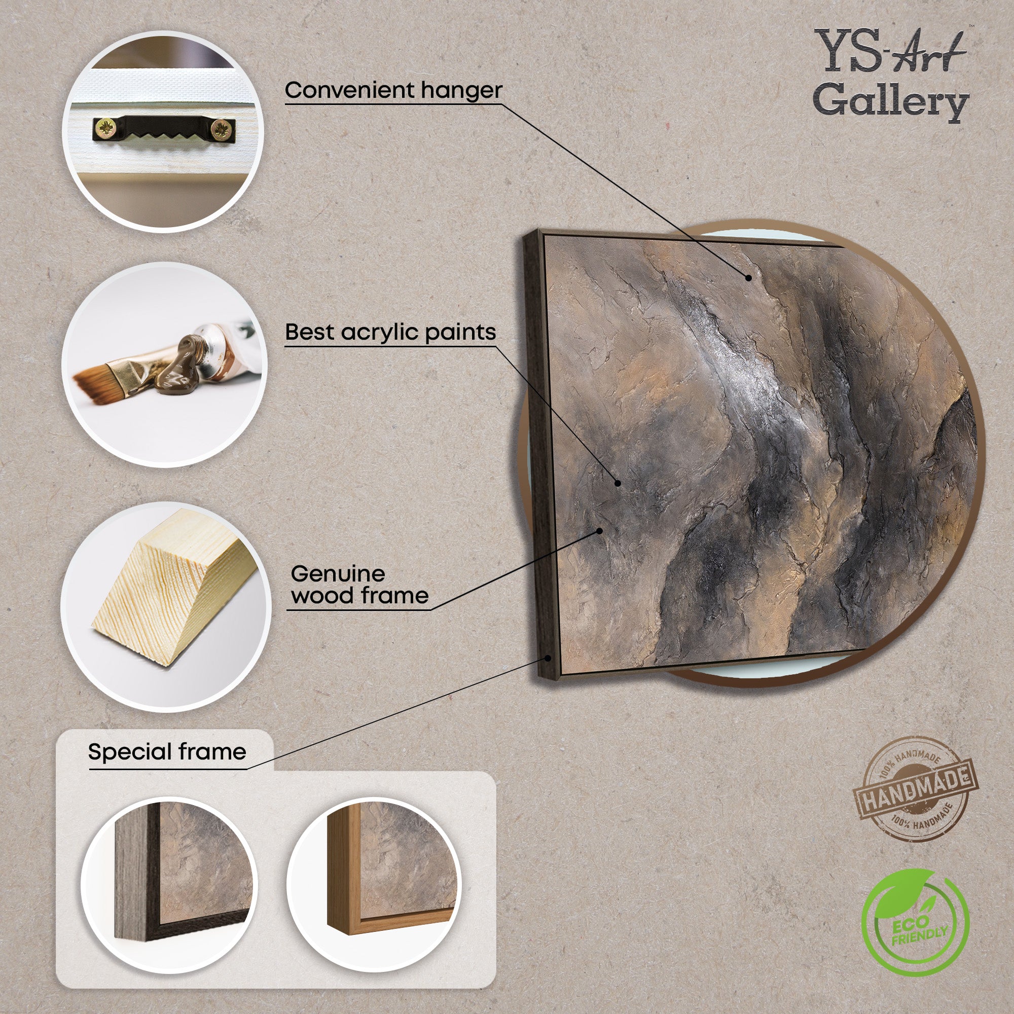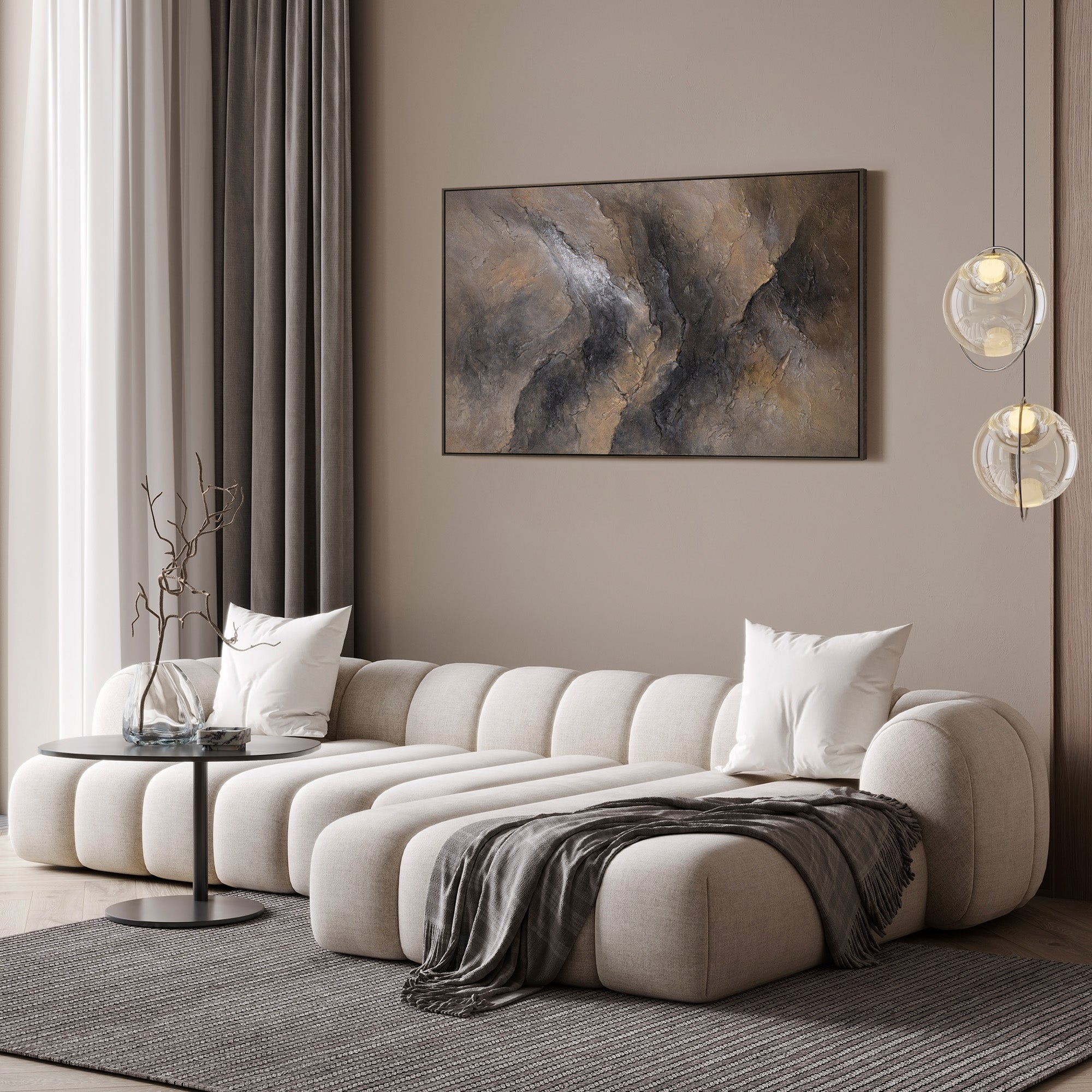 "Darkness and Dawn" er et udtryksfuldt abstrakt akrylmaleri, der er karakteriseret ved dybe grå, brune og varme jordtoner. Den flerlagede, relieflignende struktur fremkalder naturlige klippeformationer og samspillet mellem lys og skygge. Subtile kontraster og ru overflader giver værket en kraftfuld, jordnær tilstedeværelse og understreger dets håndmalede karakter.